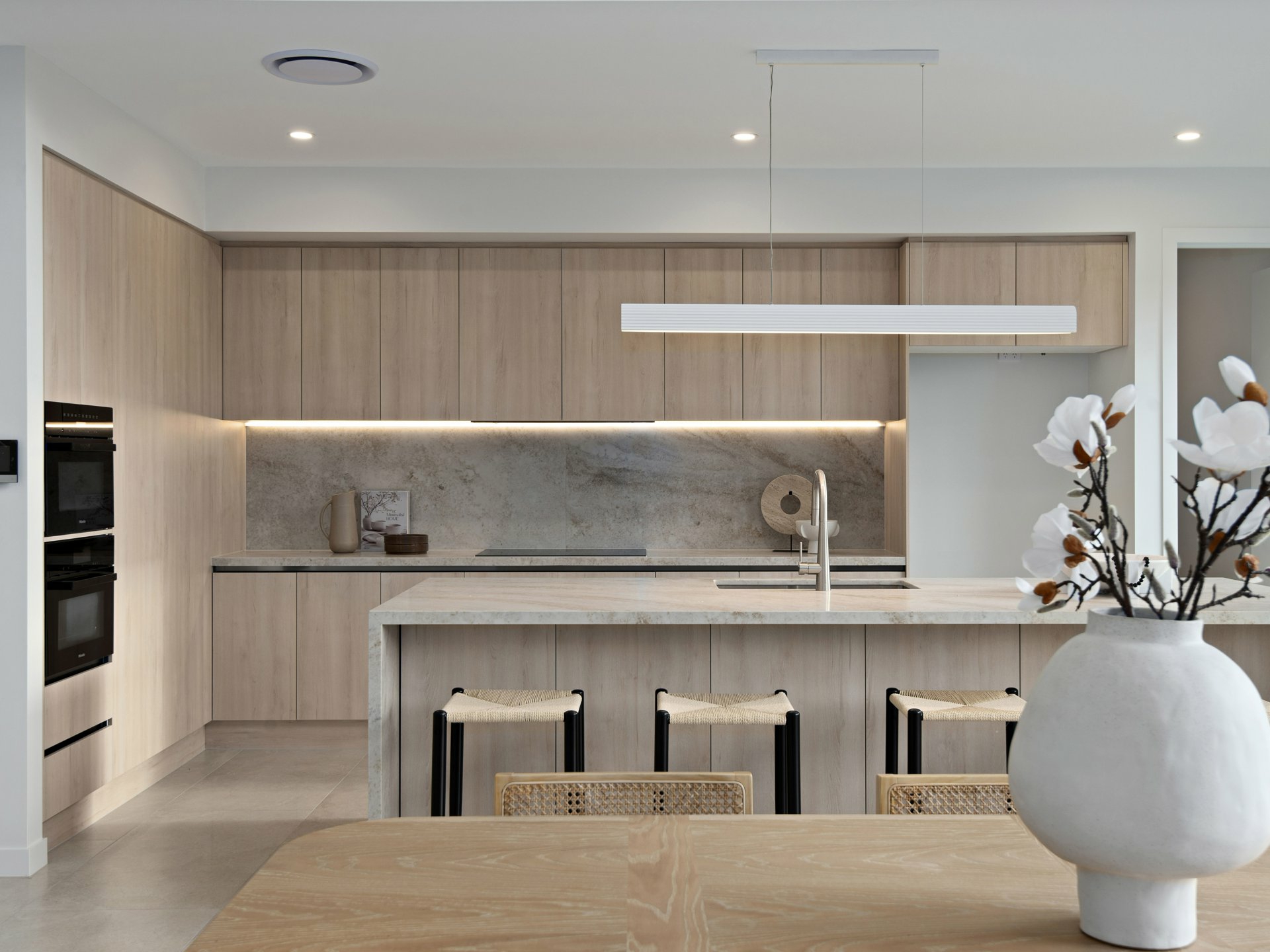 The designer kitchen anchors this space and makes hosting feel refined and effortless. The expansive stone island naturally draws people together, whether for casual breakfasts, evening drinks or weekend celebrations, while premium European appliances and beautifully appointed custom cabinetry with soft-close finishes ensure it performs as beautifully as it presents. Tucked behind, the full butler's pantry can function as a second kitchen space, providing the luxury of keeping preparation and clean-up discreetly out of sight, preserving the main kitchen as a polished focal point when entertaining.
