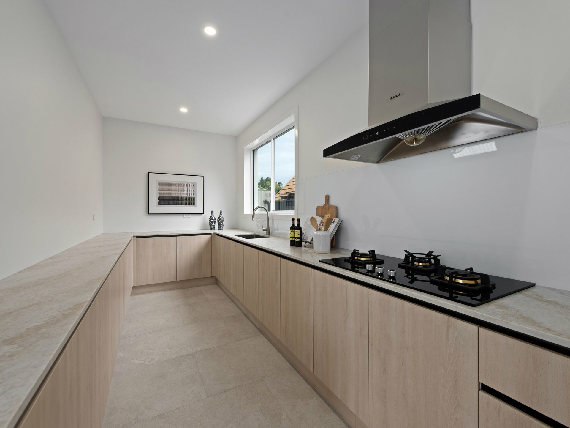 Seamless indoor-outdoor integration defines the rear of the home, with wide sliding doors opening onto a covered alfresco terrace. Overlooking the level, artificially turfed yard, this space is perfectly suited to weekend gatherings, and relaxed evenings.