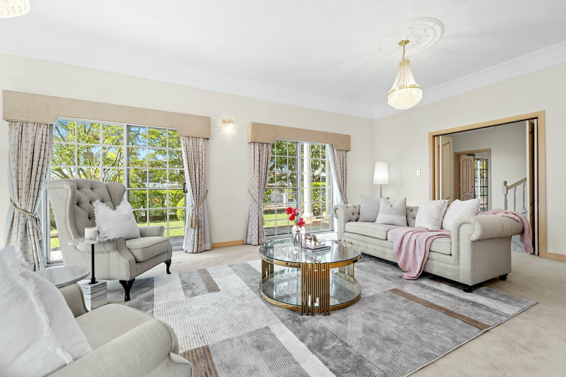 Beyond the formal areas, the main family and casual living area provides a sunlit, comfortable space for everyday connection. This thoughtful configuration ensures complete flow between formal entertaining, quiet personal space, and the high-energy demands of family life, all underscored by expansive windows overlooking the established grounds.