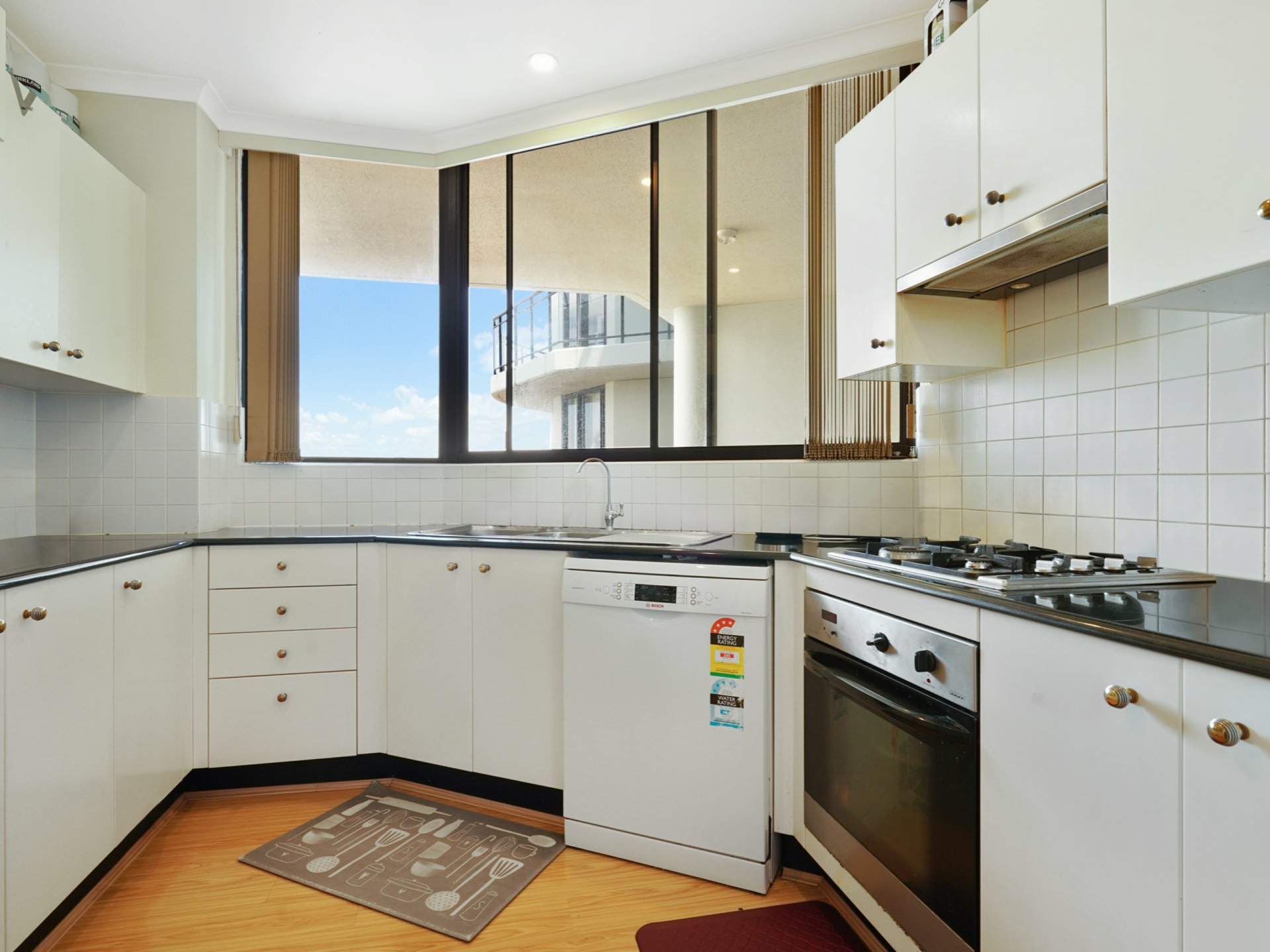 - Modern kitchen with gas cooking and stainless steel appliances.