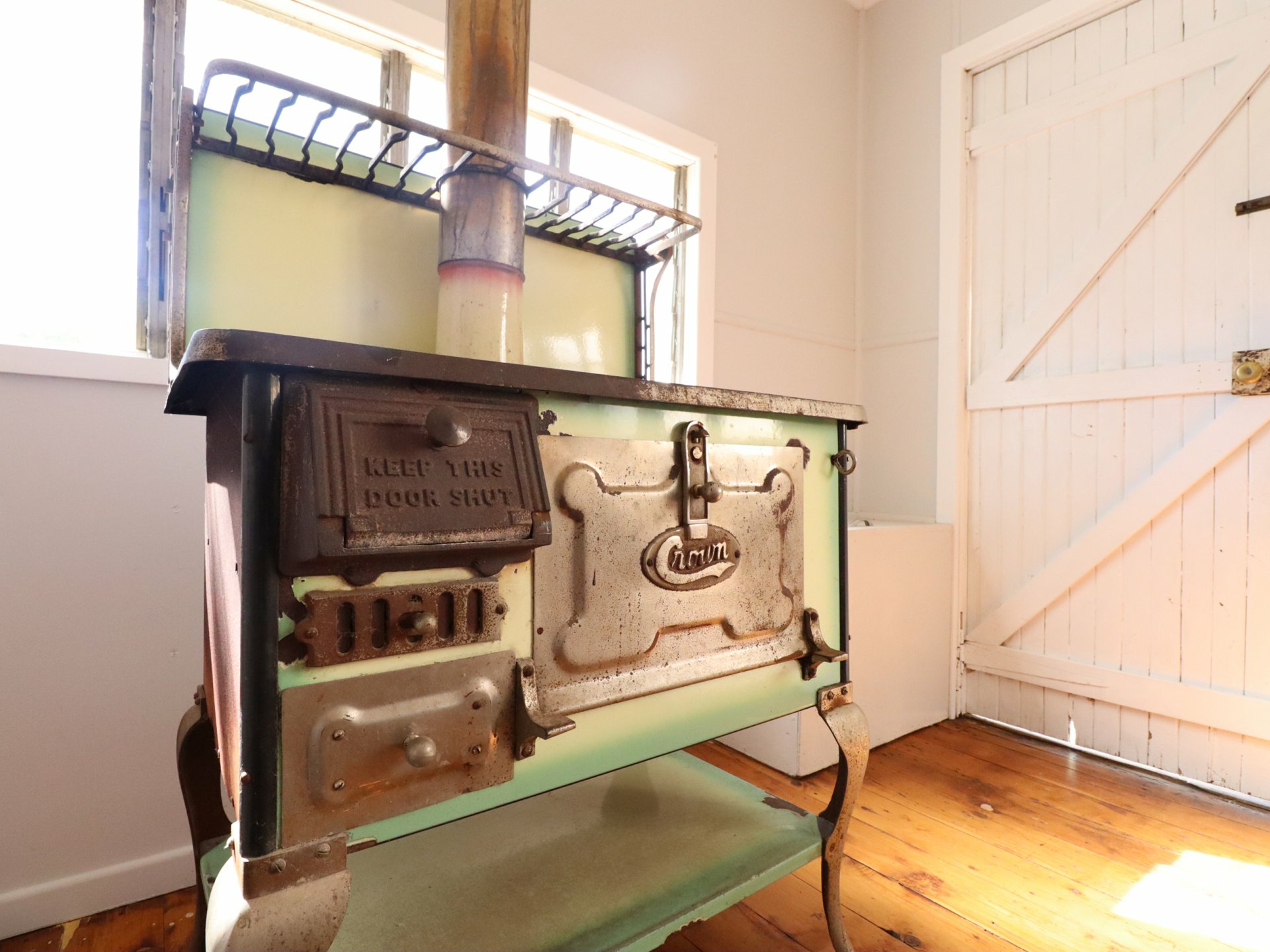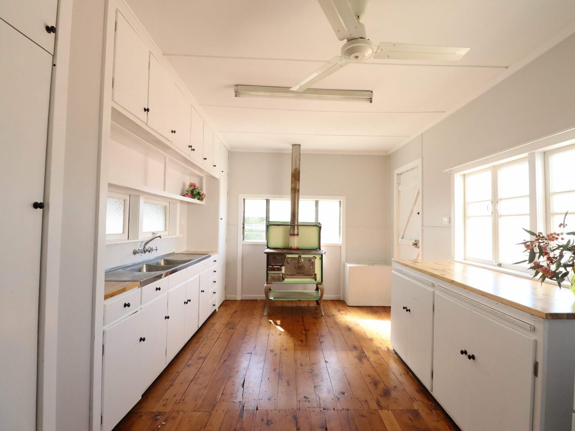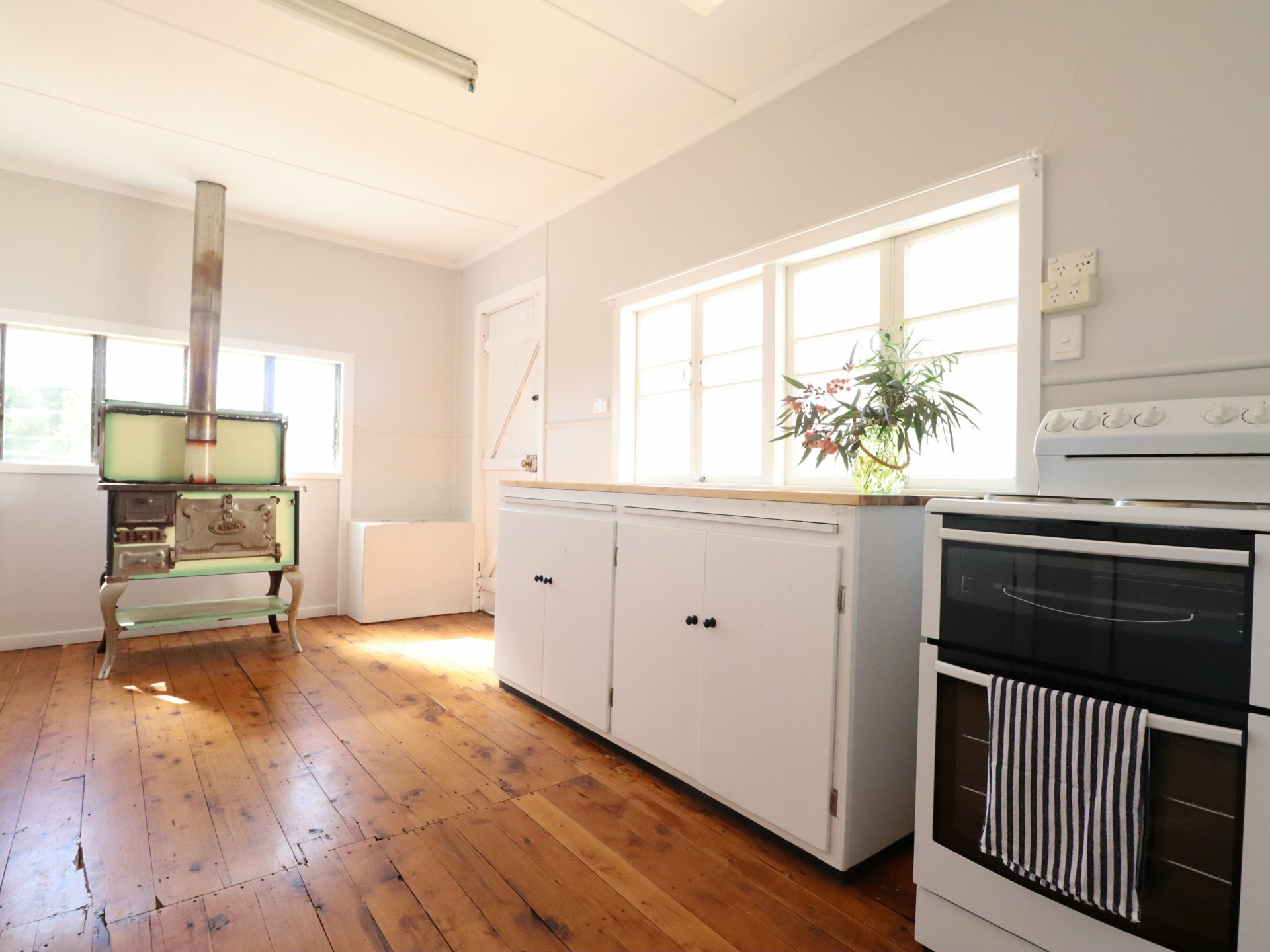 Cooking enthusiasts will appreciate the vintage Crown wood fire stove — a conversation piece that connects to the home's heritage while offering renovation opportunities for those seeking to blend old-world charm with contemporary convenience. The kitchen has ample storage space, a handy pull out bench feature for cosy breakfasts and a walk in pantry for storing food & large appliances.