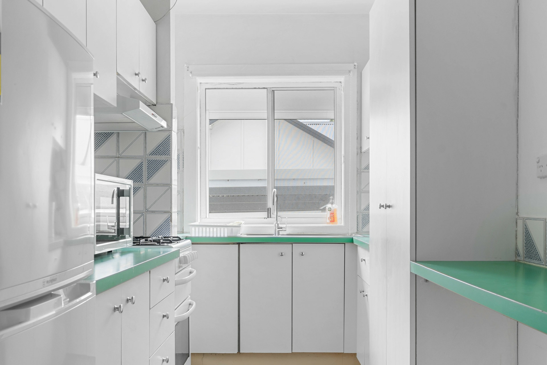 - Galley kitchen with gas stove, built-in breakfast bar, and ample cupboard space
