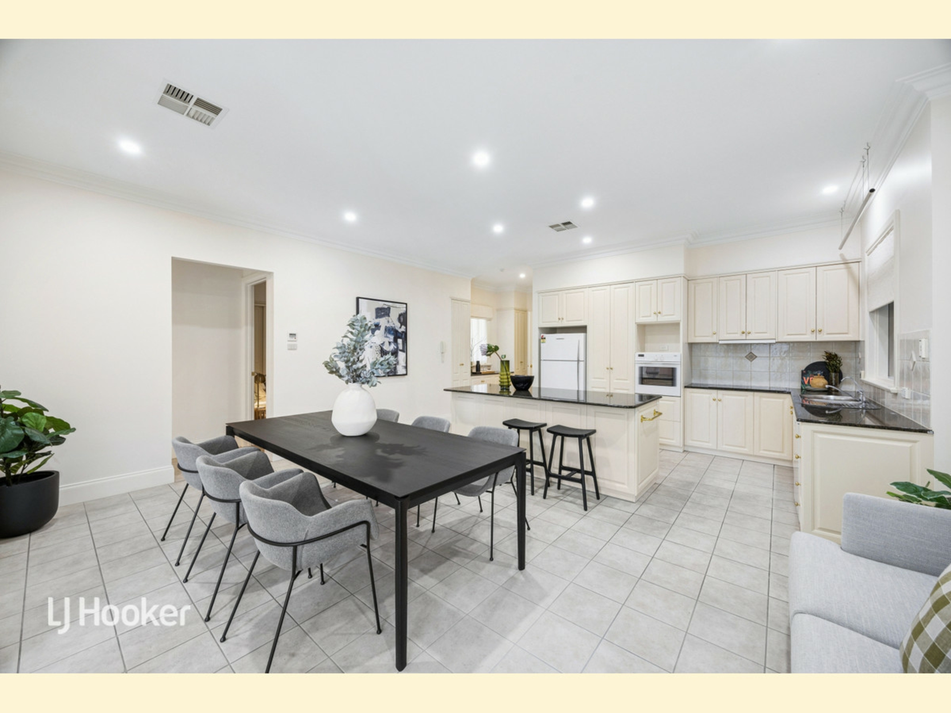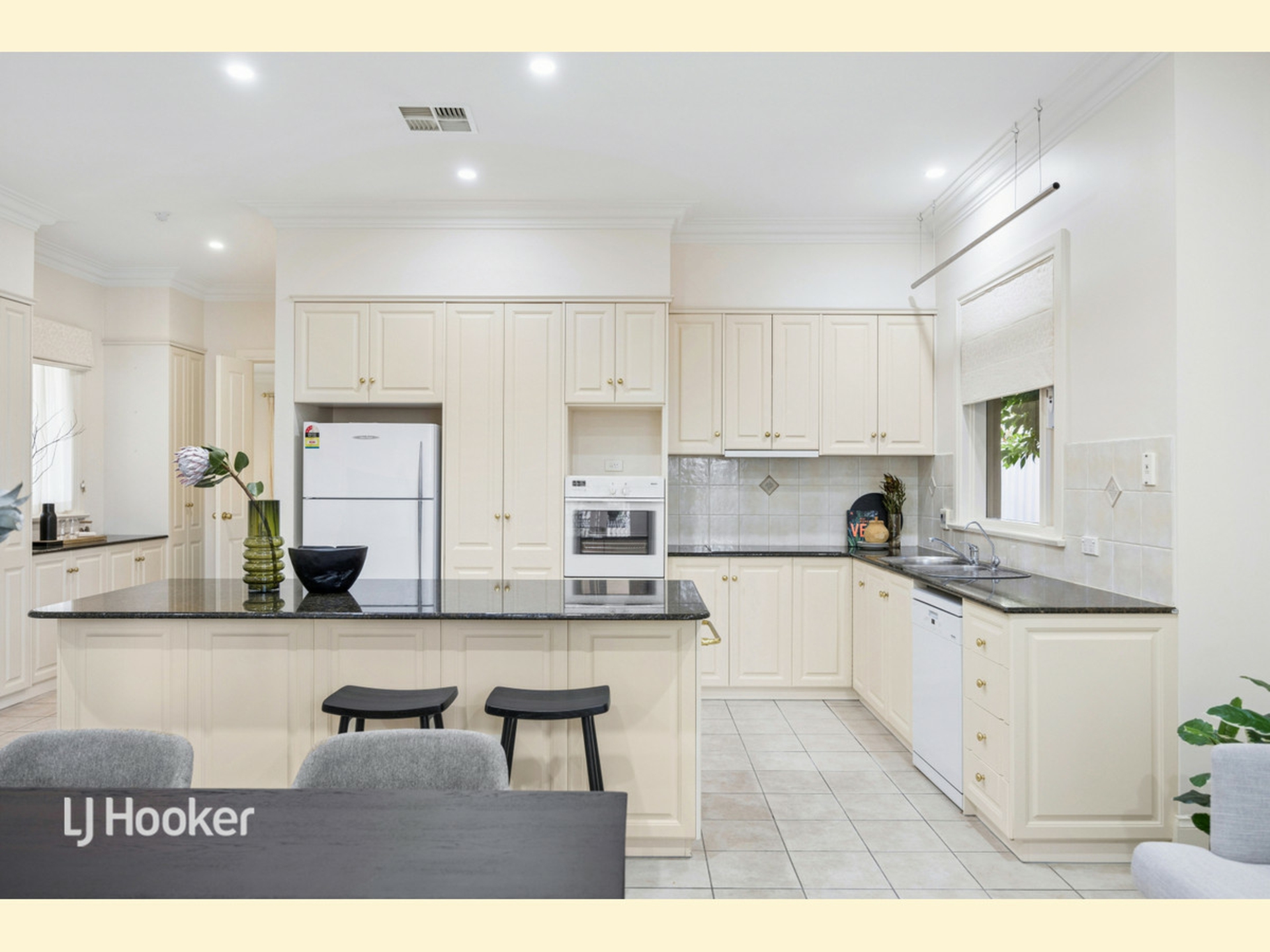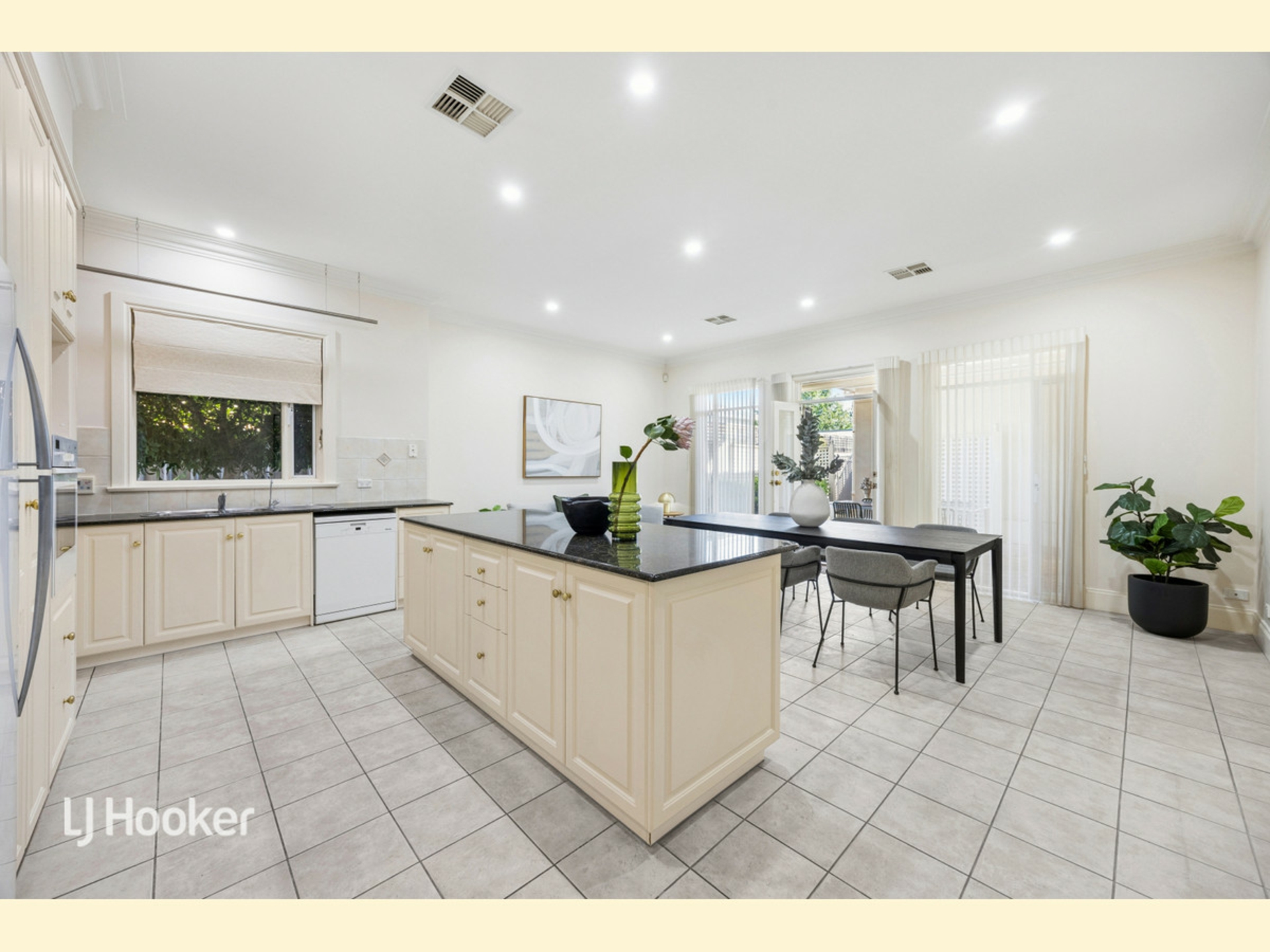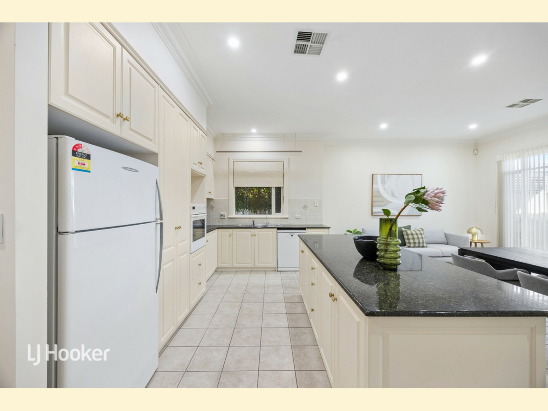 Single-level and designed for ease, the home opens with a formal lounge at the front, providing a welcoming entry with parquetry flooring. A central courtyard is accessed through double doors from the lounge. Further through, the spacious dining area is complemented by a well-appointed kitchen, complete with more than enough storage and functionality, especially with the granite island. French doors separate the casual area from the formal entry and lounge, with additional storage or bar facility at the entry.