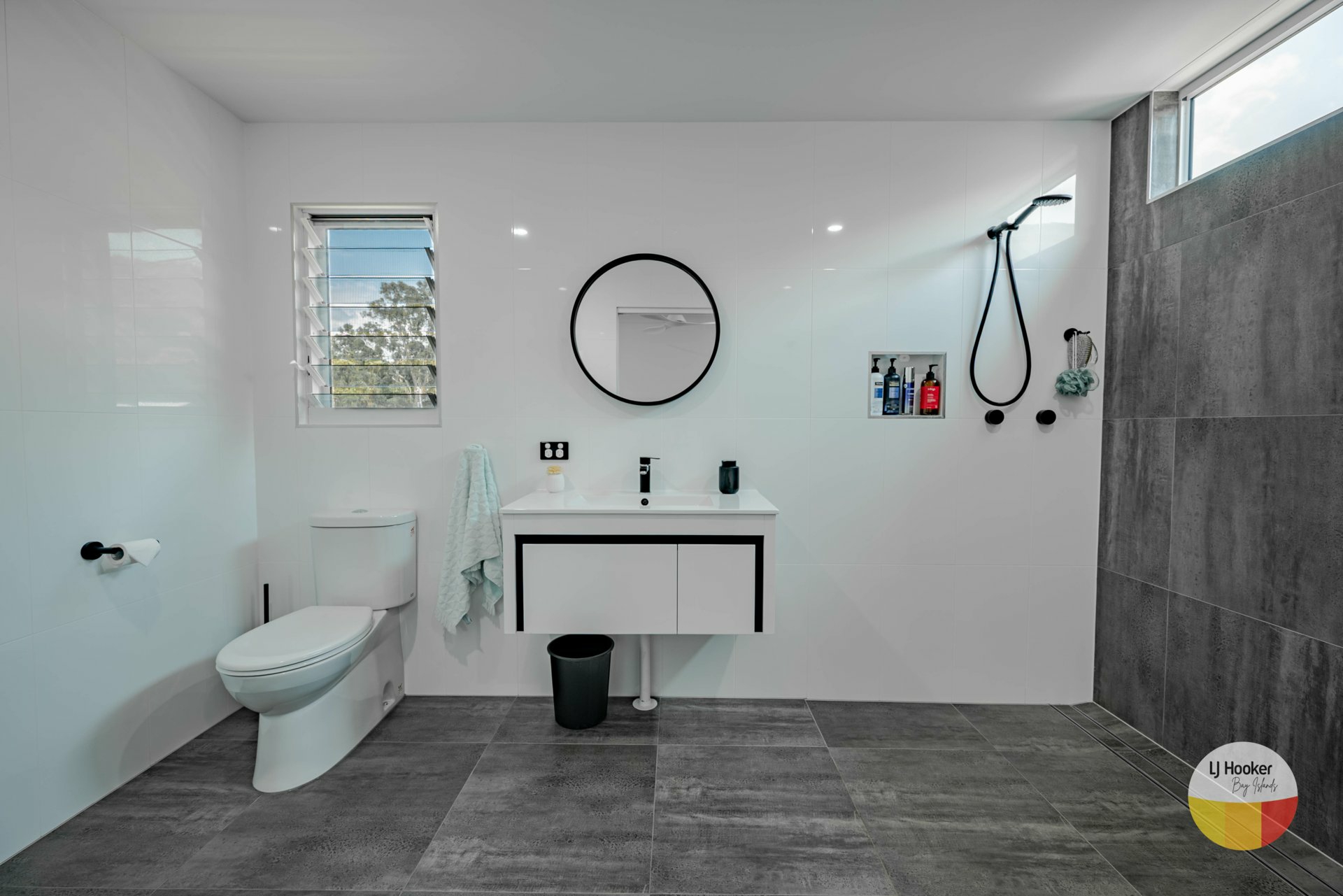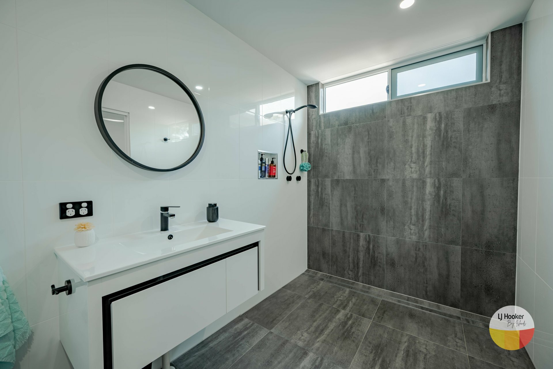 The primary residence reveals a generous open-plan living and dining domain, complemented by a bespoke designer kitchen appointed with quality fittings and finishes. A central hallway leads to an impressive floor-to-ceiling tiled ensuite bathroom of substantial proportions, accessible from both the hallway and the master suite. The master bedroom is beautifully appointed, showcasing clean architectural lines and a calming, contemporary aesthetic.