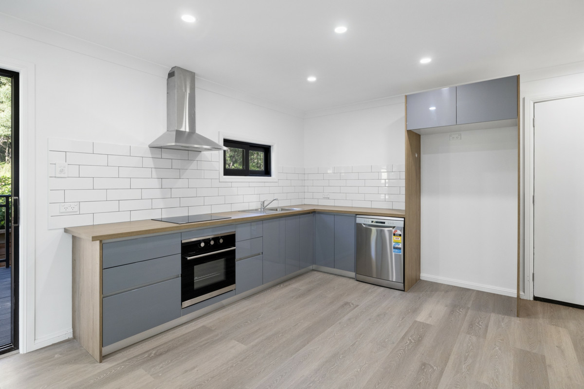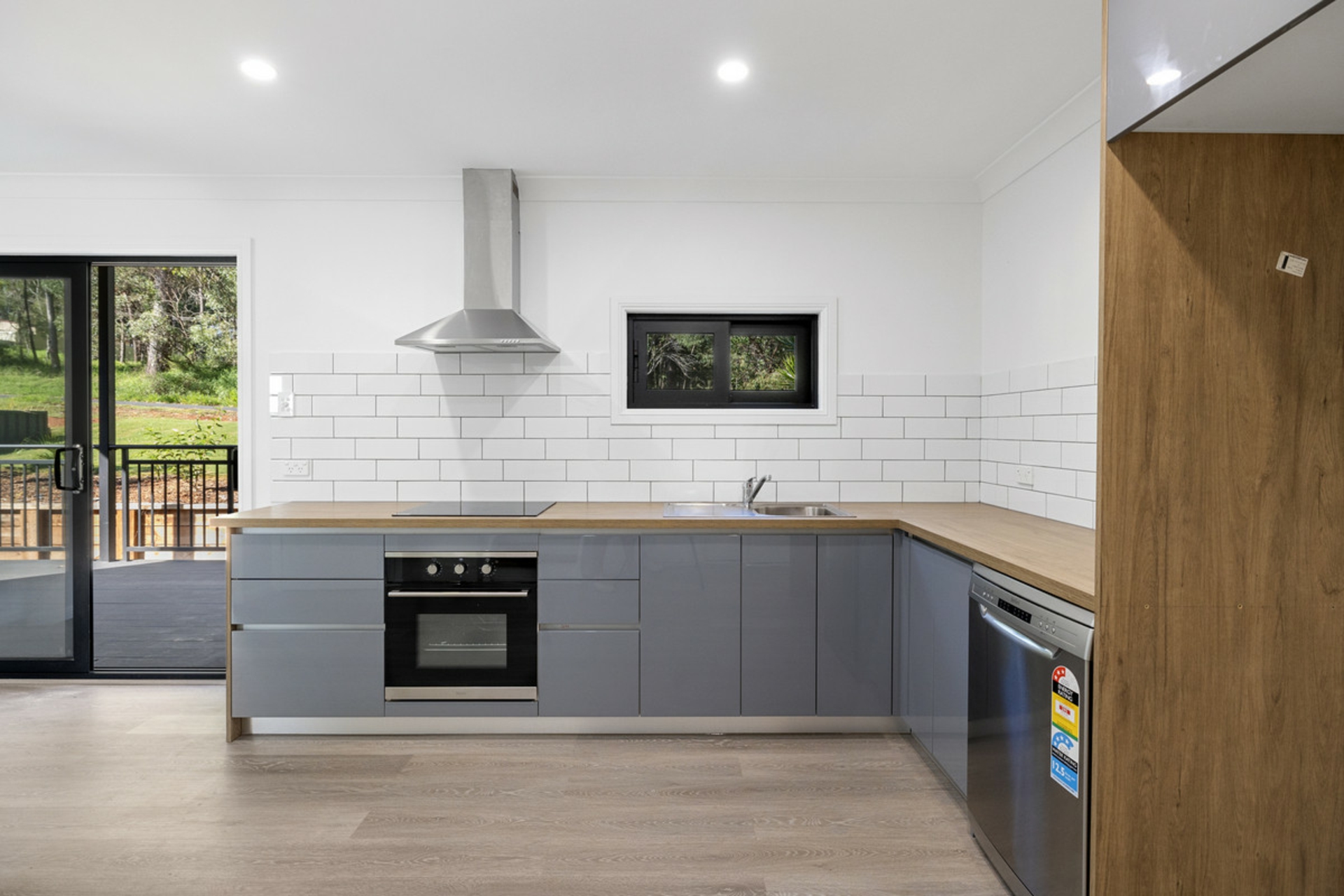 • Kitchen with neutral 2 pak cabinetry, timber look benchtops, room for a family size fridge,