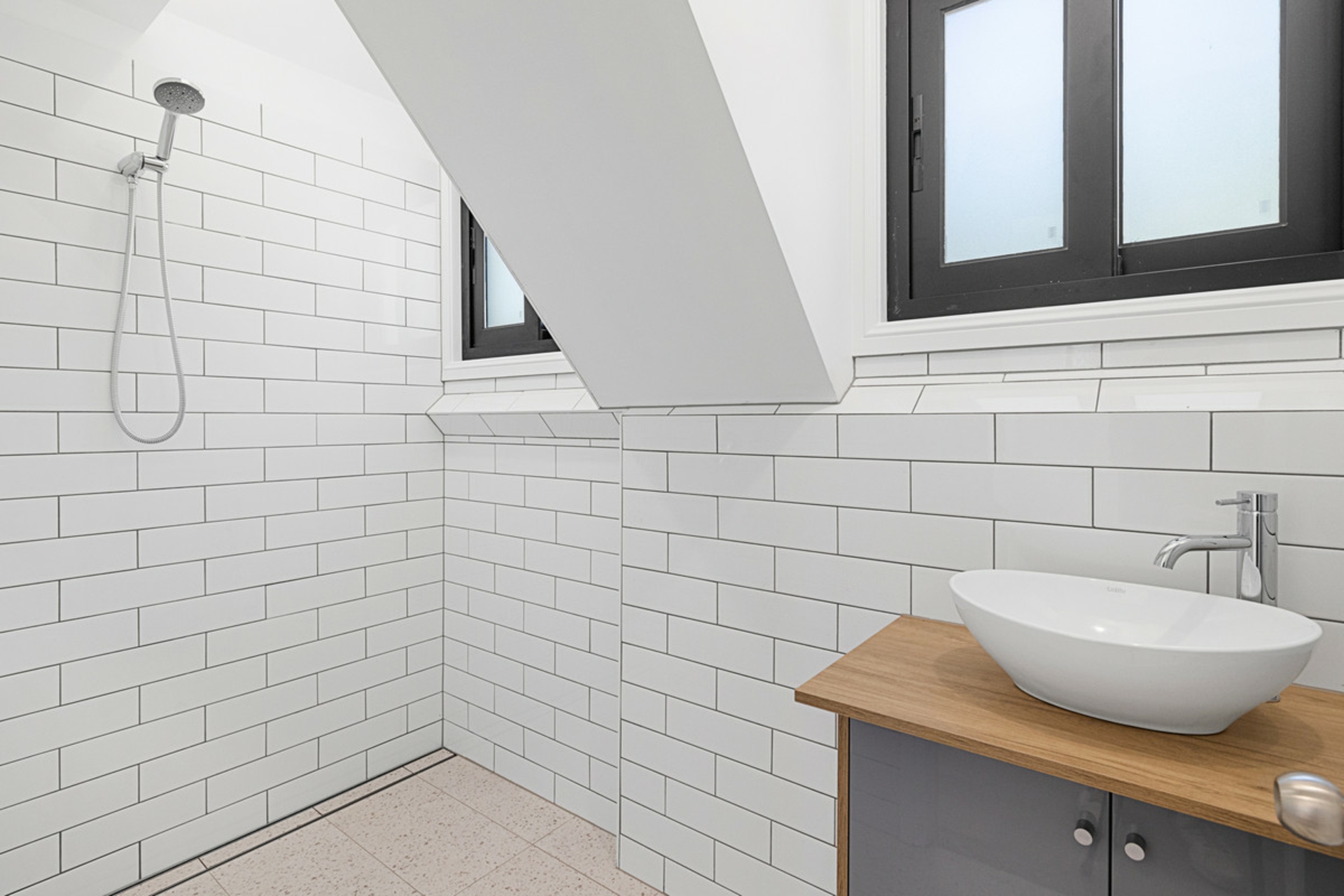• Bathroom with shower and floor to ceiling tiles, wall hung vanity