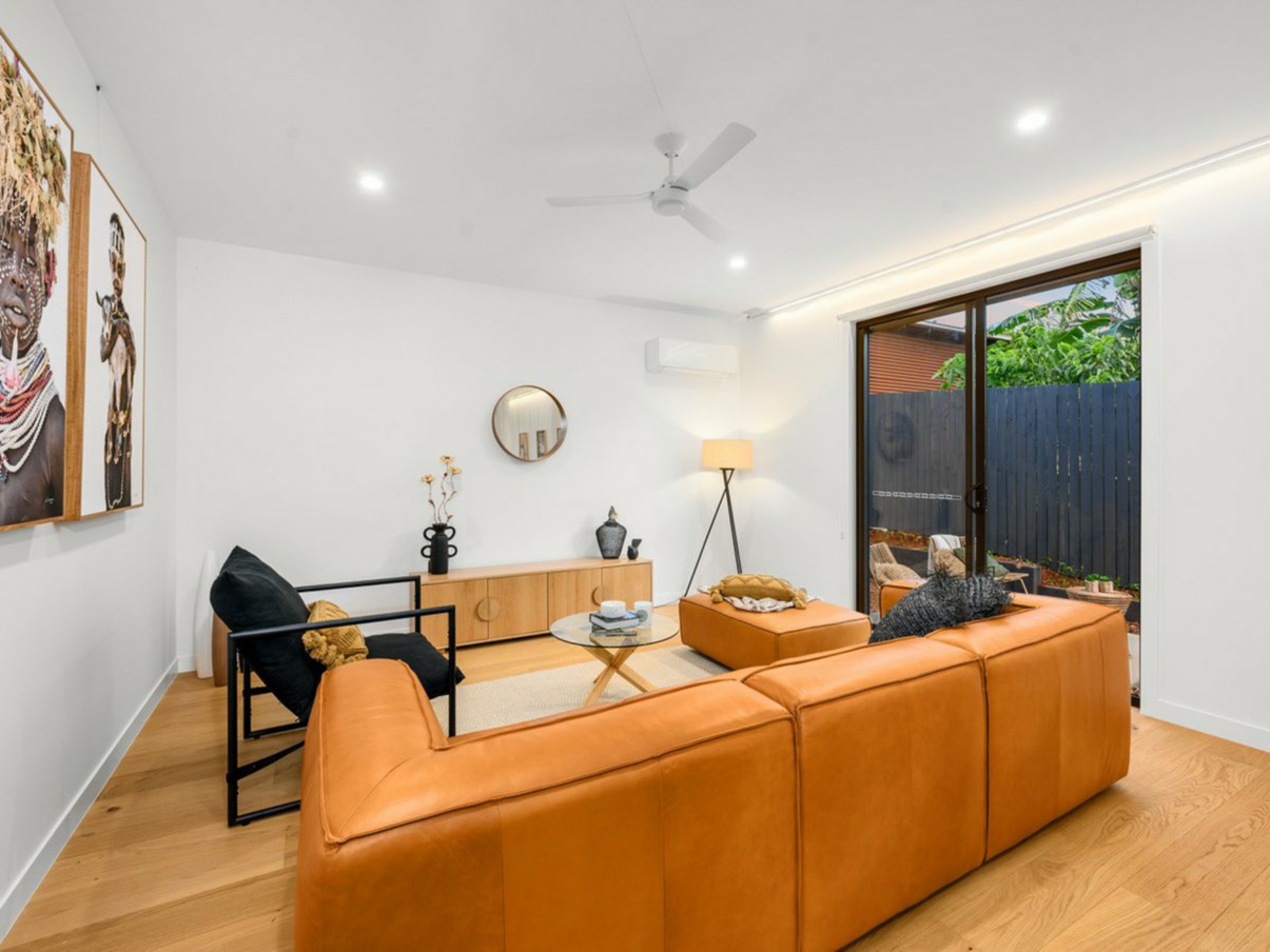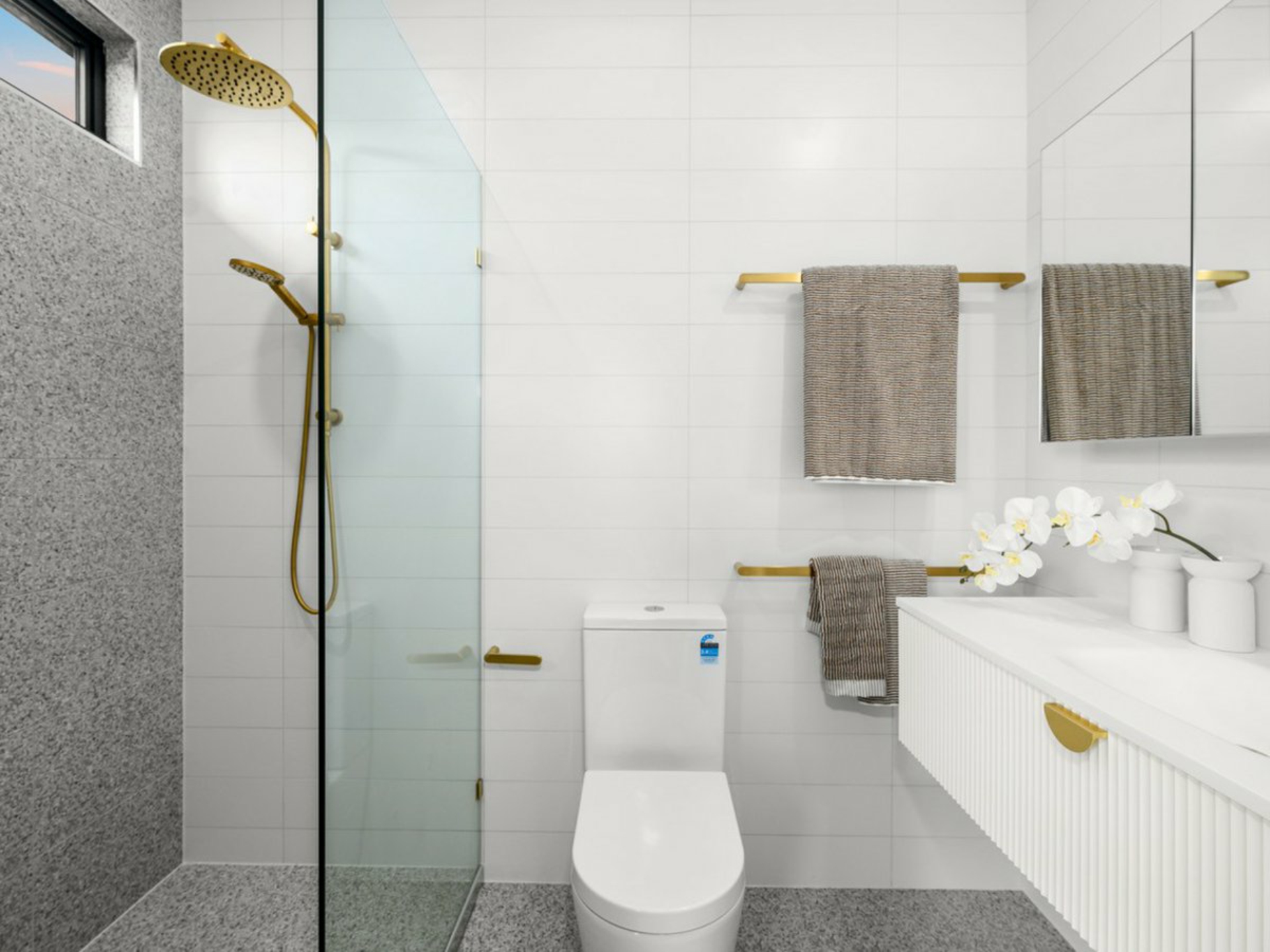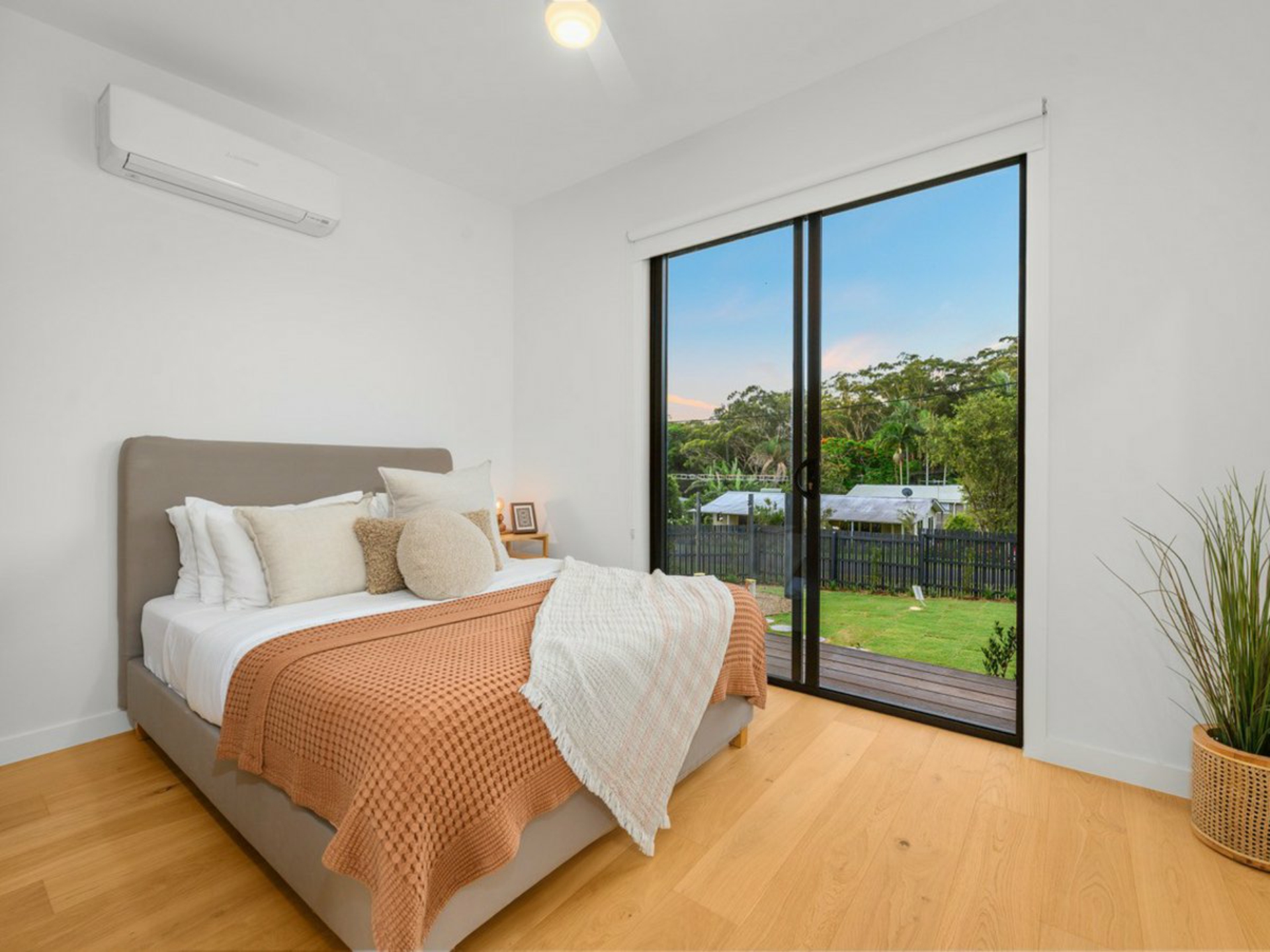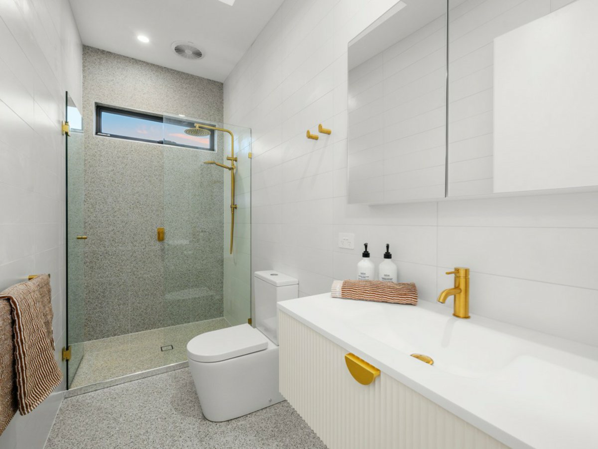 Enjoy hybrid flooring, large raked ceilings, and Mitsubishi air conditioning in both the living area and master bedroom. The bathrooms feature floor-to-ceiling tiles, adding a luxurious touch throughout.