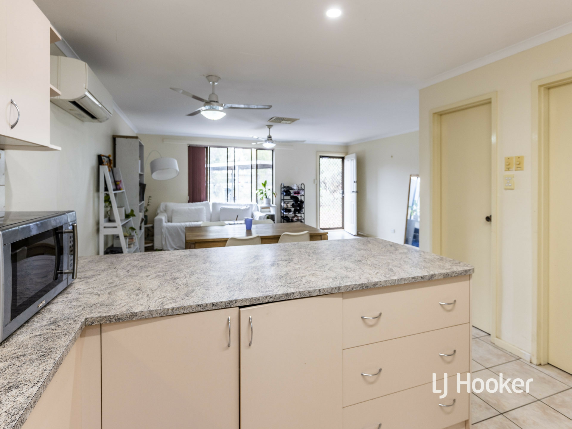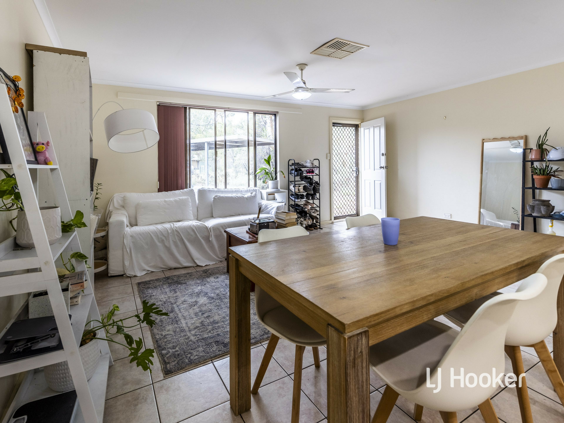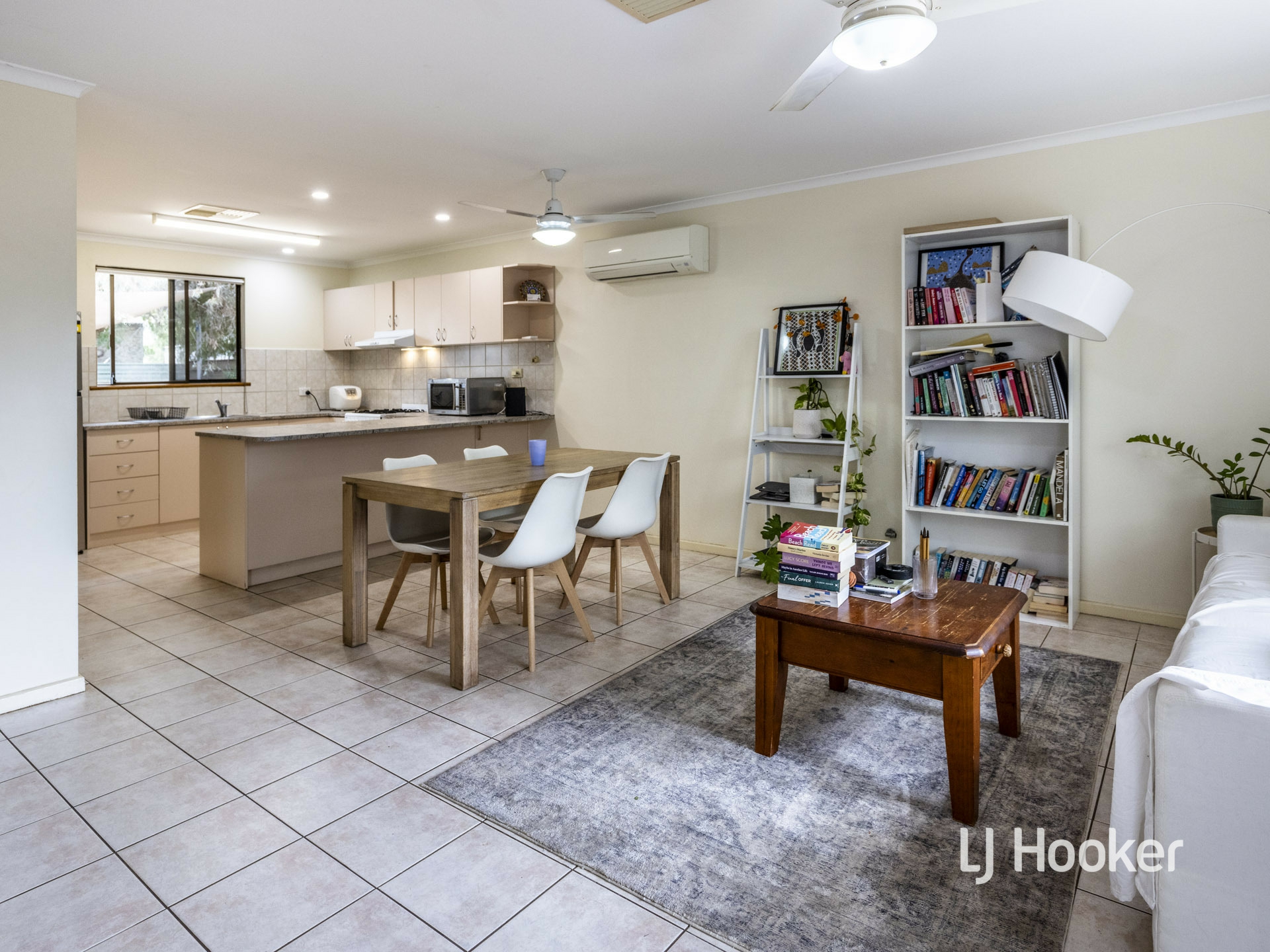 The designated dining area is adjacent the kitchen and the open plan living area. All bedrooms include built in robes, ceiling fans and vertical blinds.
