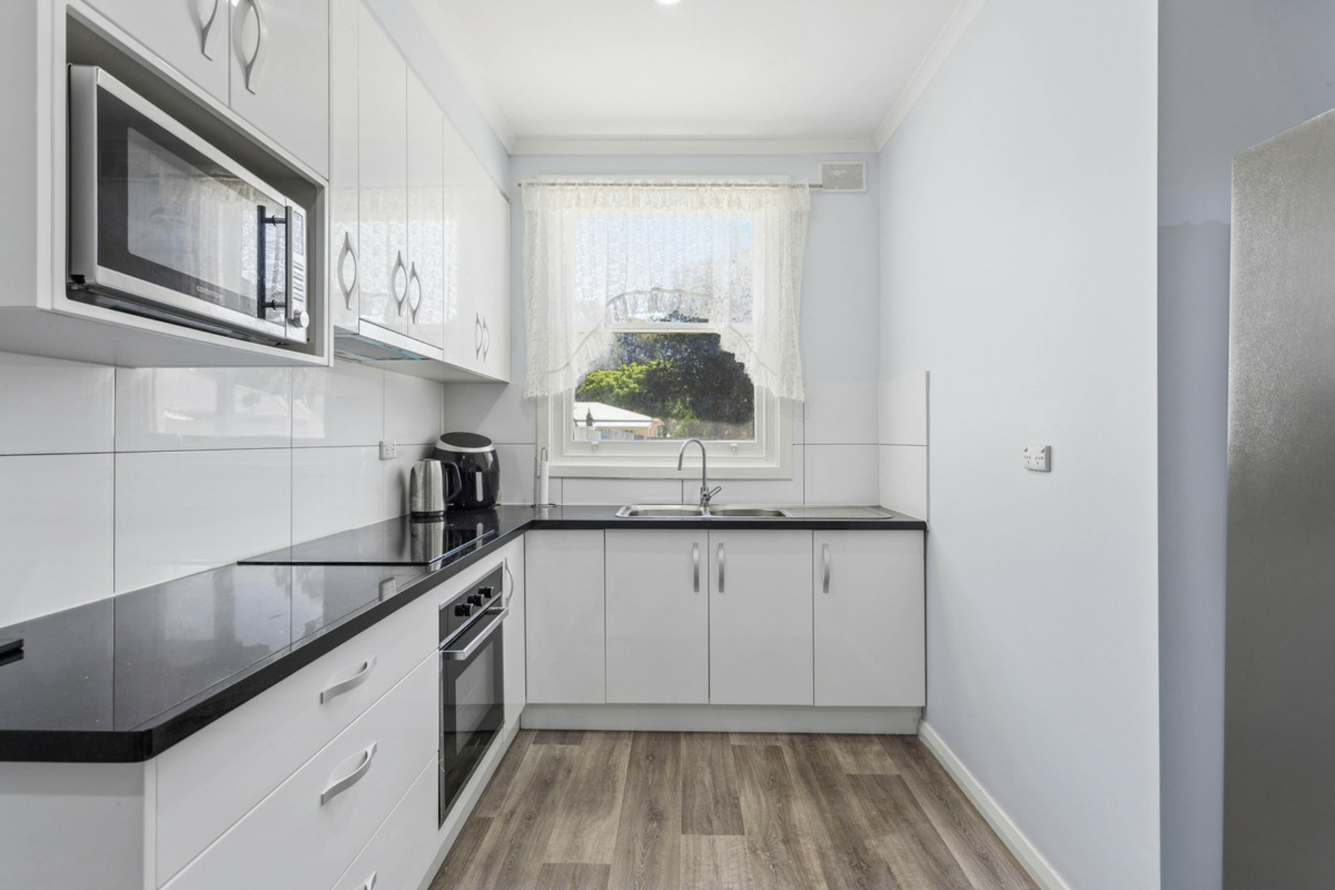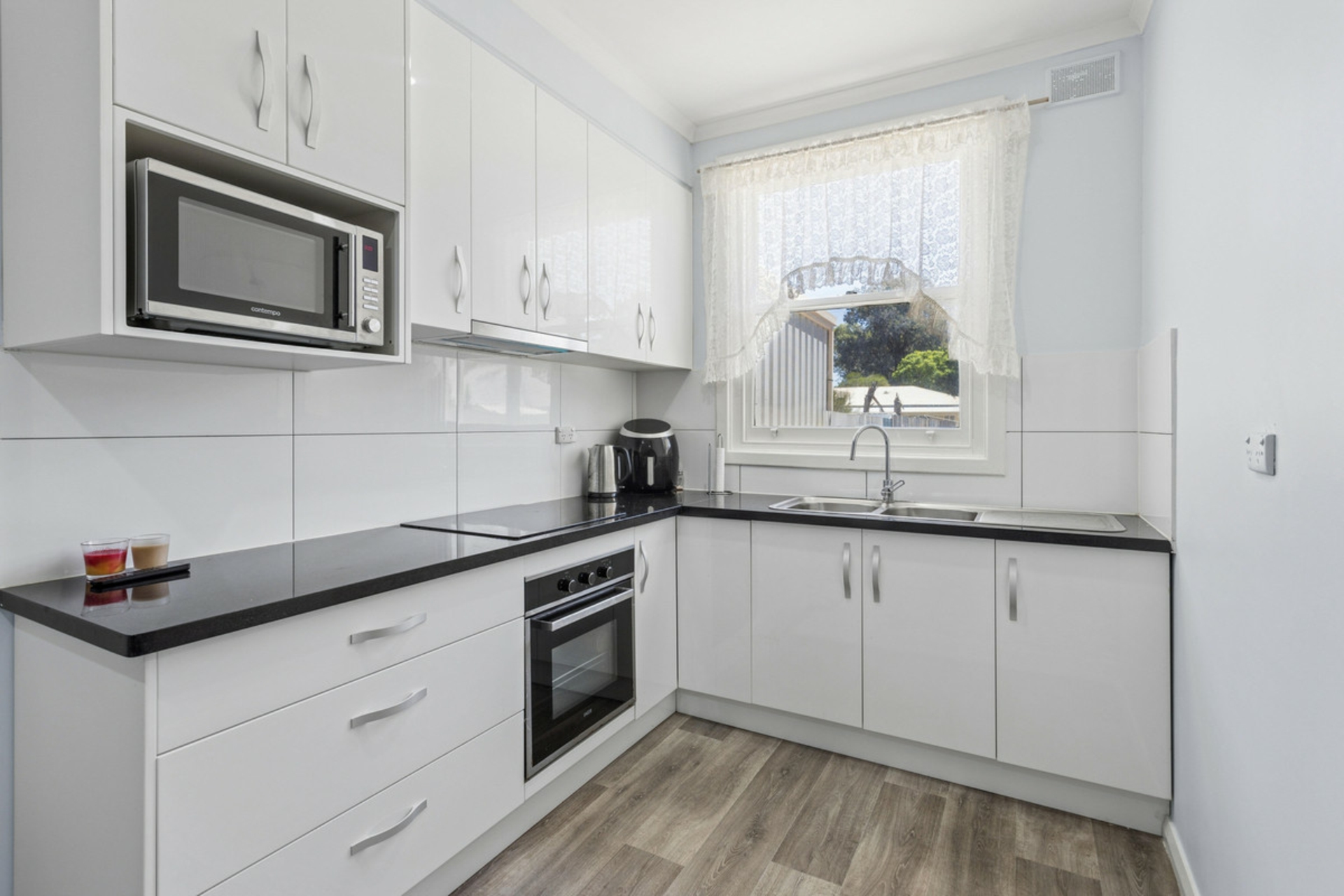 • Renovated kitchen with overhead cupboards and electric cooktop