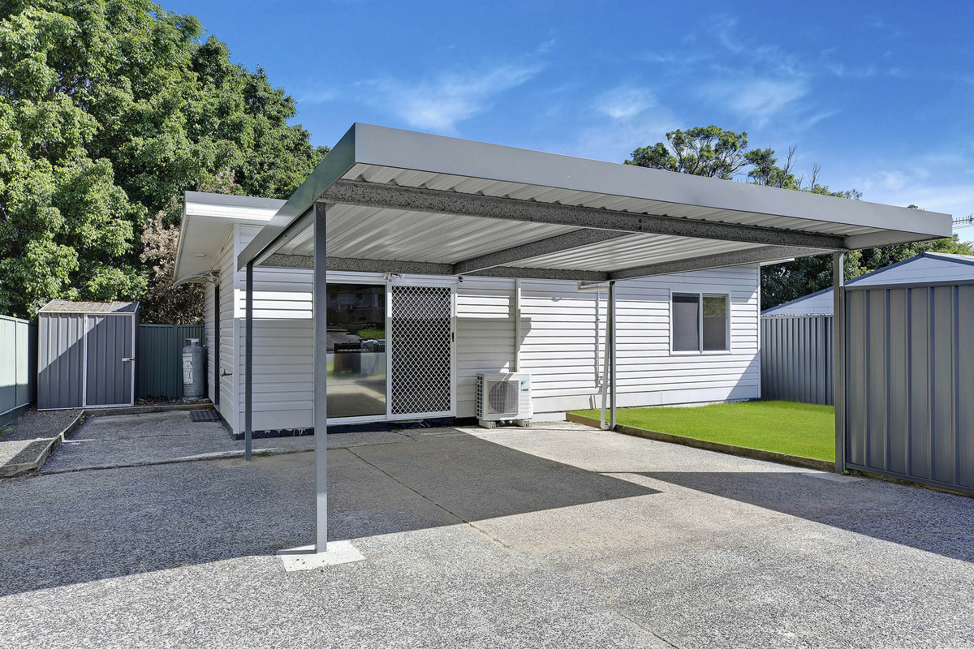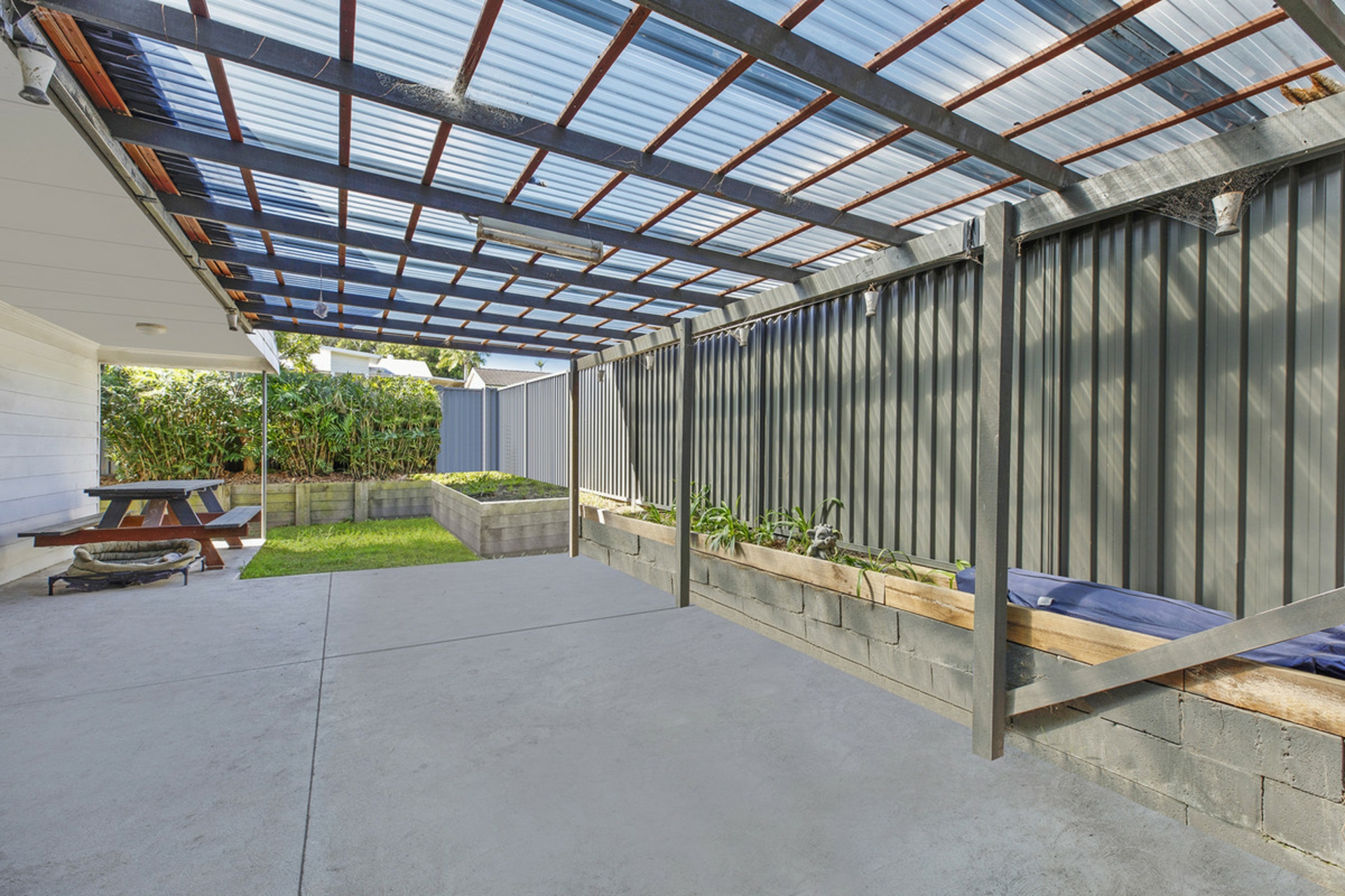 •Private outdoor entertaining area with established hedge line and garden shed.