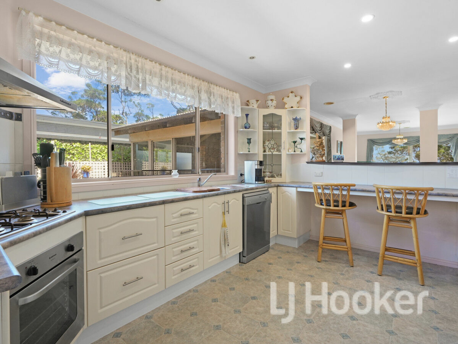 At the rear of the home, the living spaces are perfectly positioned to capture cooling breezes and offer uninterrupted views of the clear waters of St Georges Basin below. Multiple windows and sliding doors enhance the connection to the outdoors, while the spacious kitchen enjoys water views and features a walk-in pantry, breakfast bench, oven and gas cooktop, flowing to a formal dining area and multiple living zones. These areas open to a sunny courtyard, an enclosed sunroom with BBQ and entertaining space, and a grassed backyard with outdoor dining, creating an ideal setting for relaxed coastal living.