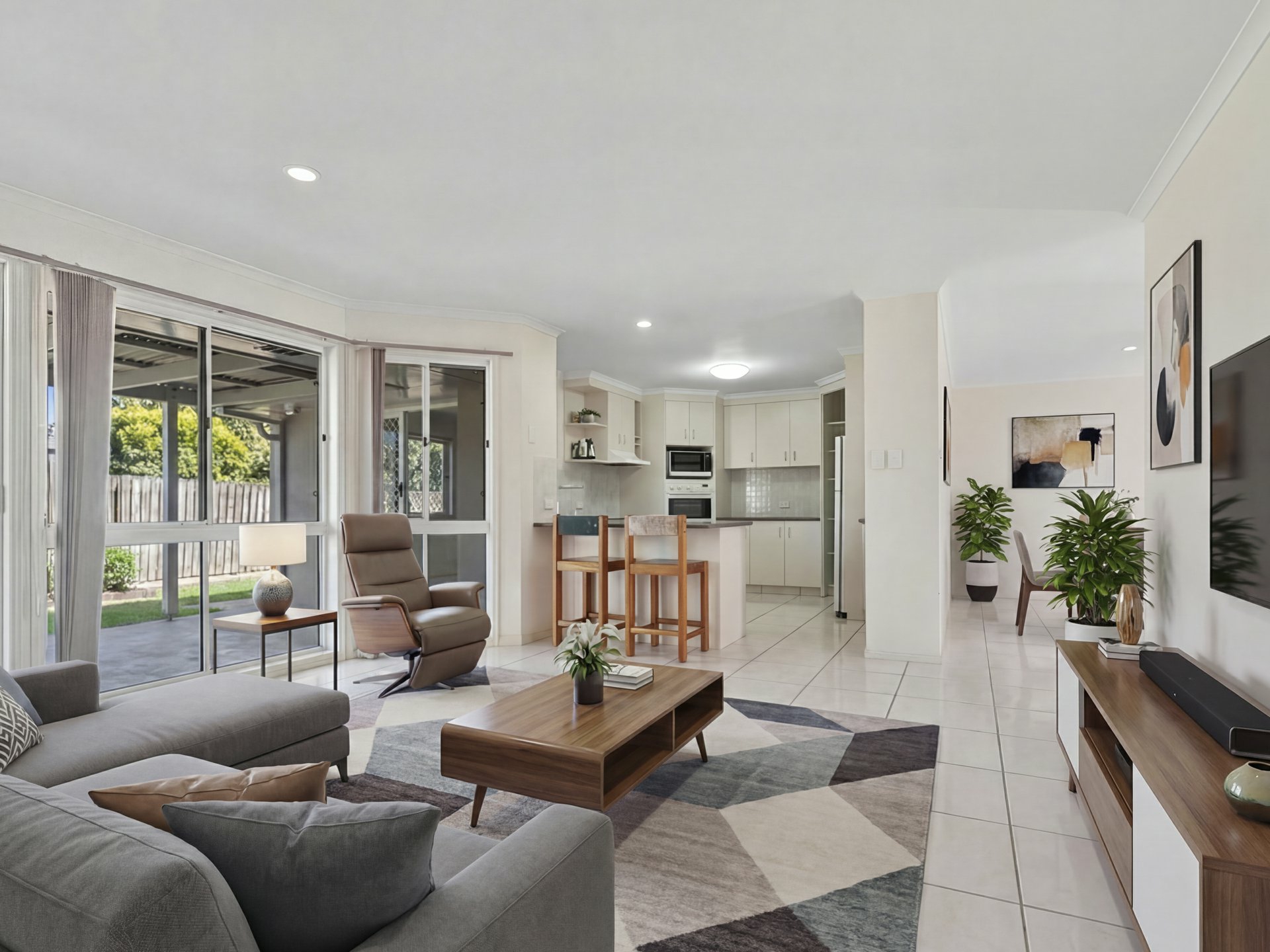 • Open-plan kitchen, dining, and living areas
