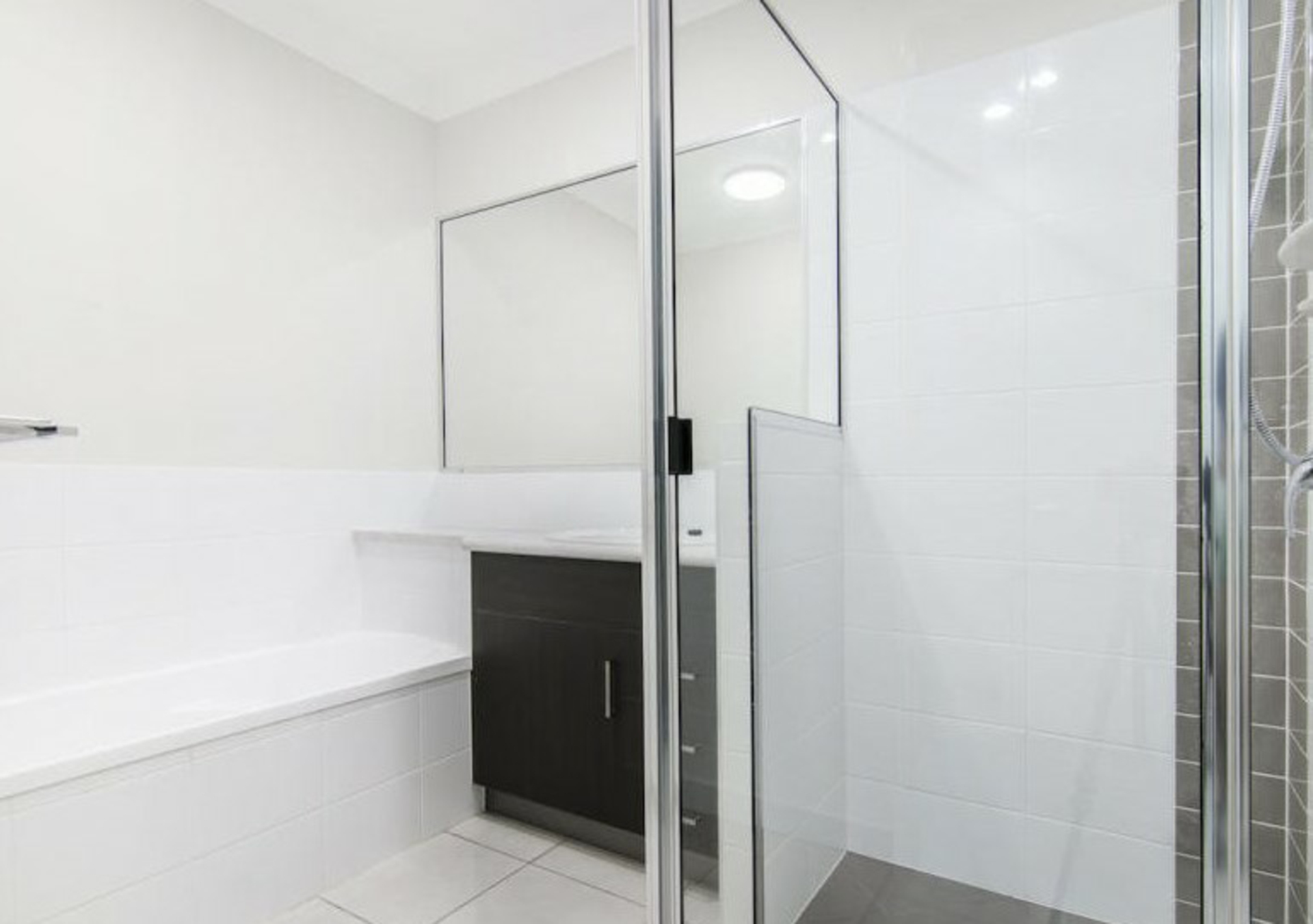 - The main bathroom consists of a bathtub, shower, and vanity as well as a separate toilet.