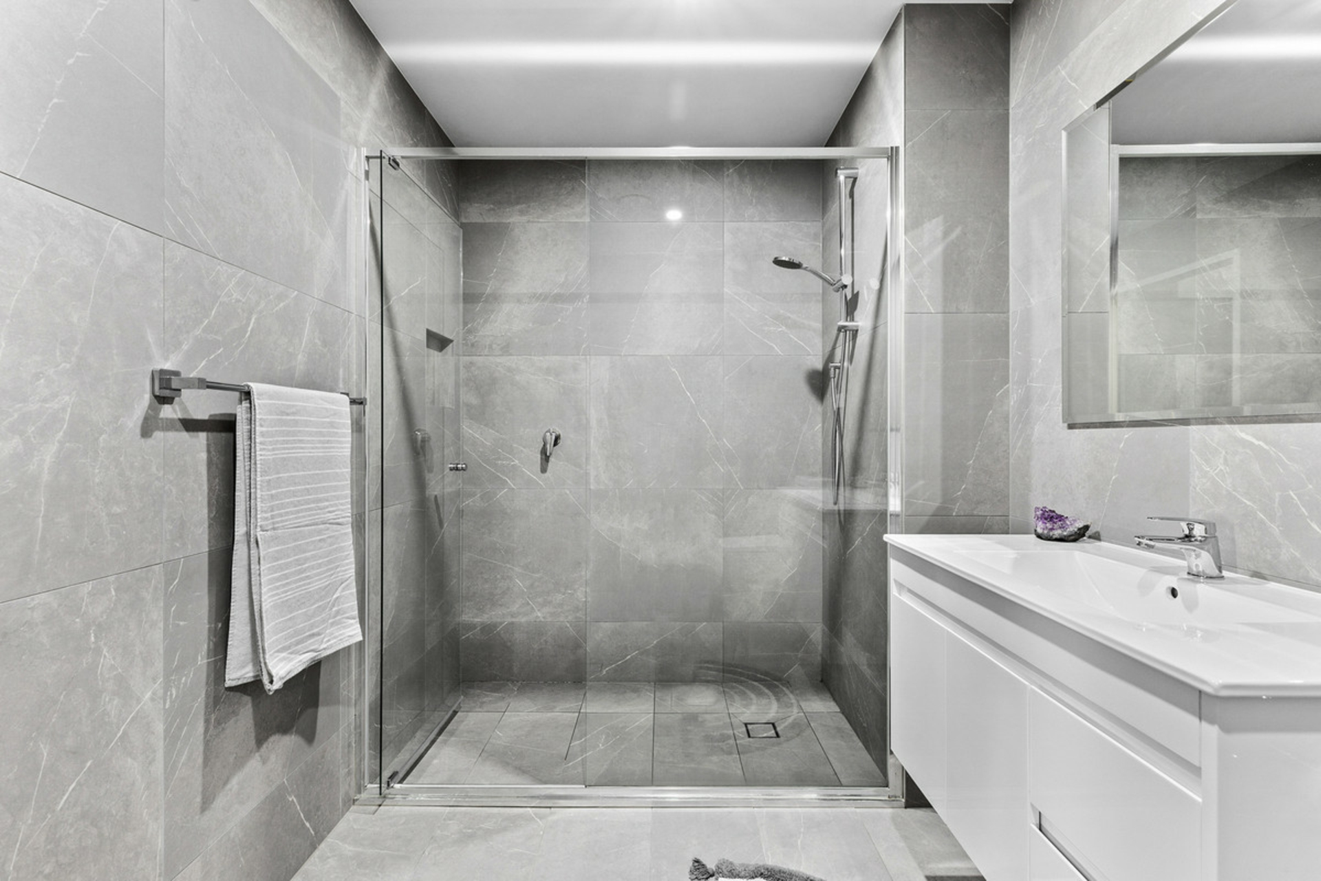 -Bathroom adorned with floor-to-ceiling tiles and generously sized shower