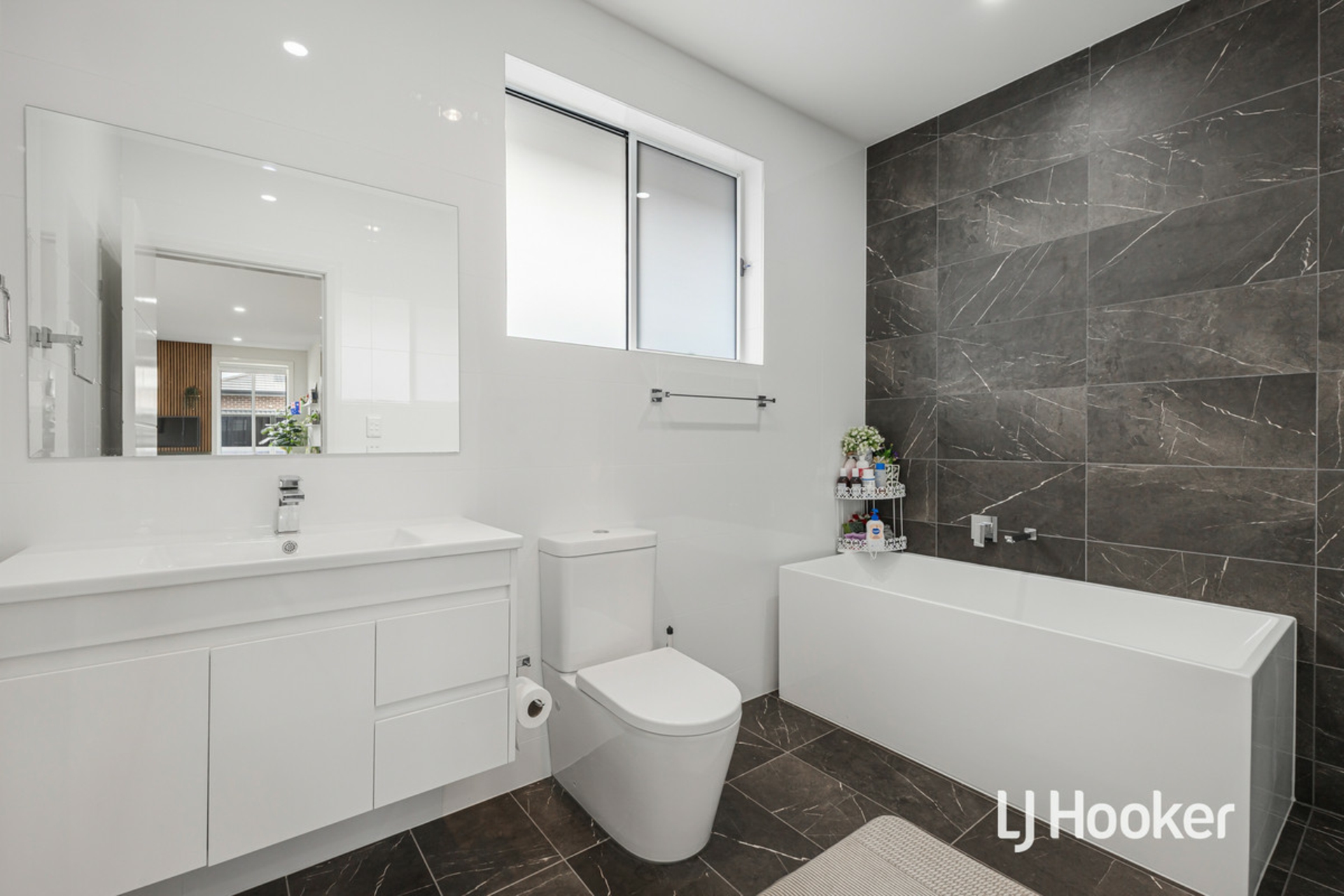 - Two stylish bathrooms boast floor-to-ceiling tiles, main with shower and bathtub