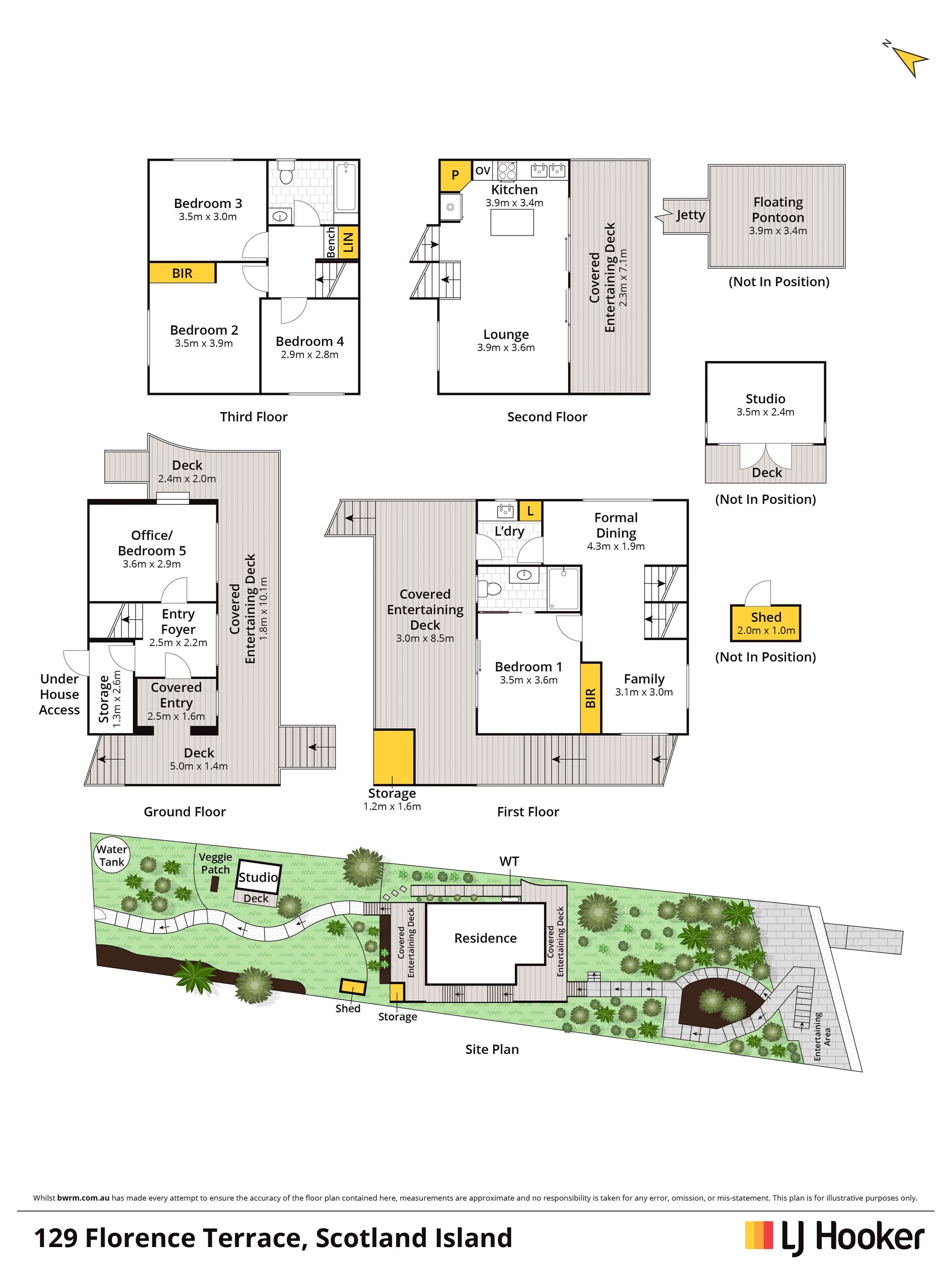 Upstairs, an additional three bedrooms and a second bathroom provide flexible accommodation for family or guests. A rear entertaining deck, landscaped gardens and a private studio offer even more space to relax or create.
