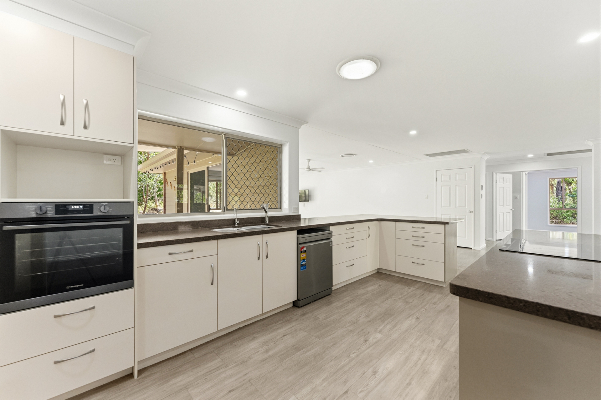 The stylish kitchen offers stone benchtops, a dishwasher, and space for a plumbed double-door fridge, delivering a modern and practical cooking space.