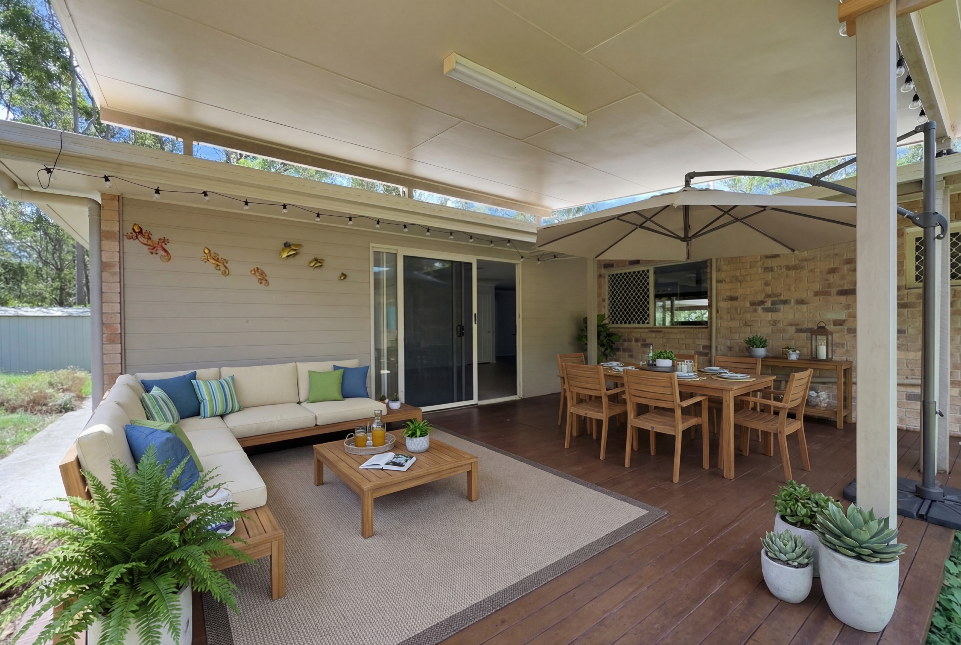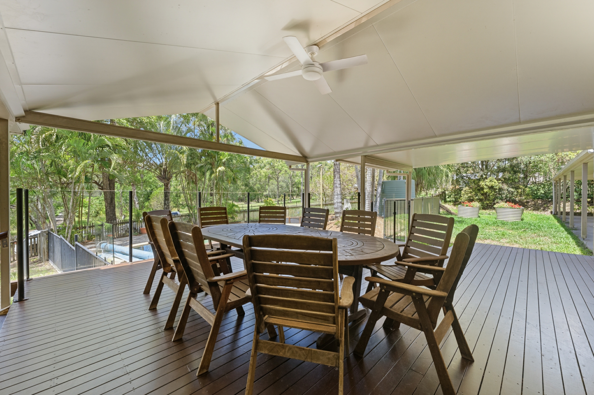 Grand timber-decked front verandah which creates bold first impression and provides a sophisticated outdoor gallery for morning coffees or twilight relaxation.