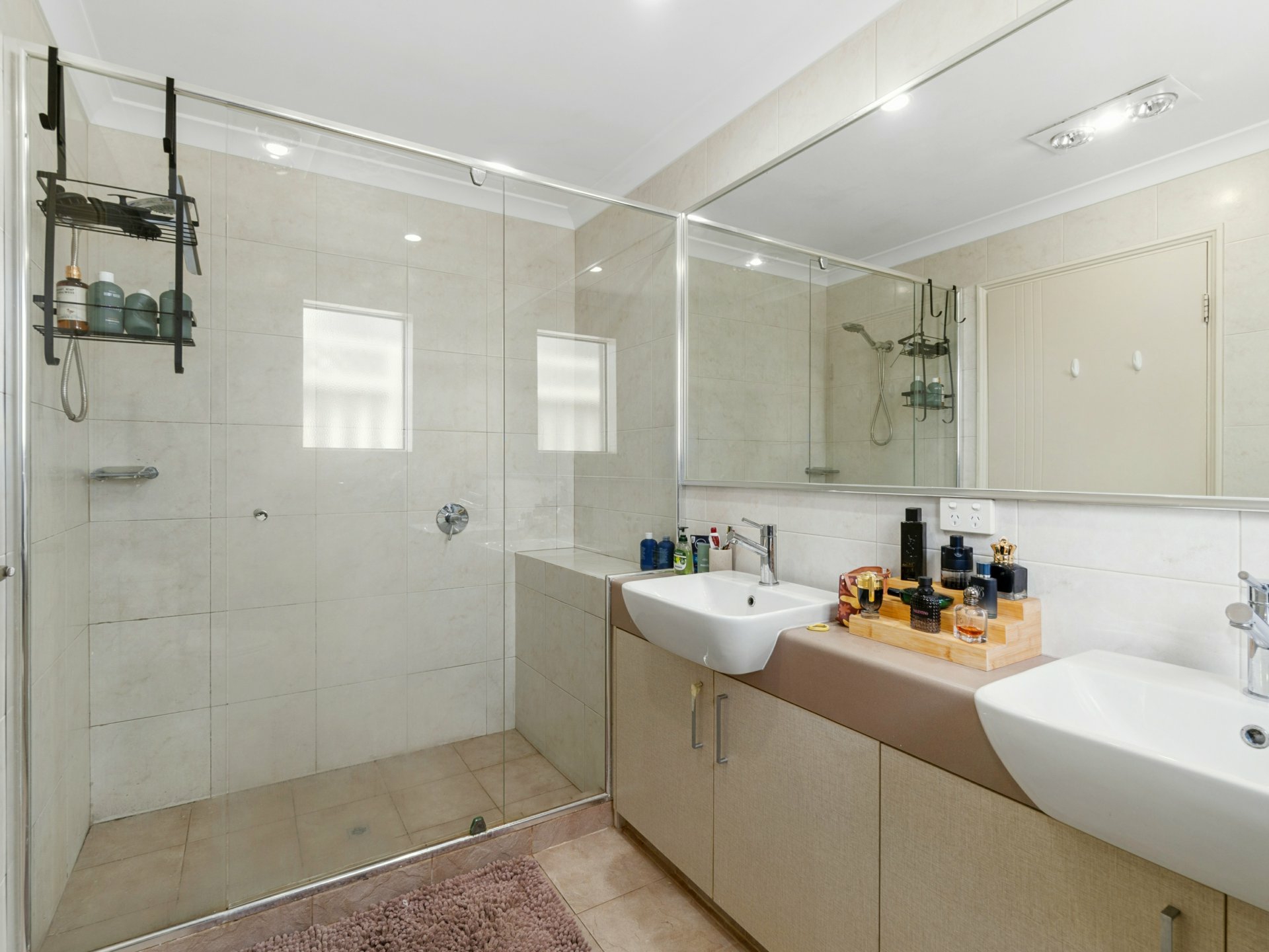 The main bedroom includes a private ensuite with double basins and floor-to-ceiling built-in wardrobes. Two additional bedrooms are both well-sized and include built-in robes.