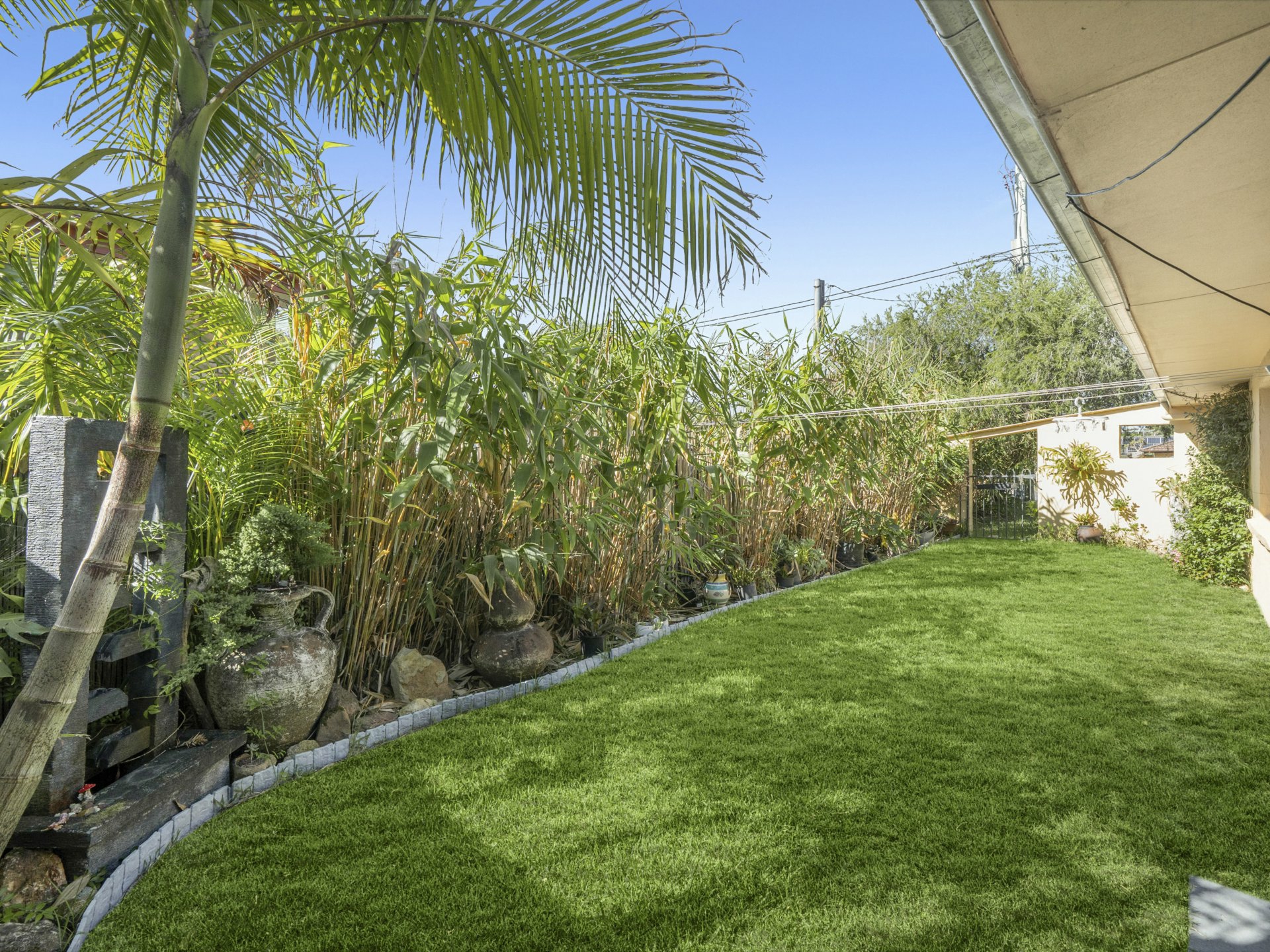 The private outdoor space is framed by established greenery and creates a peaceful retreat.