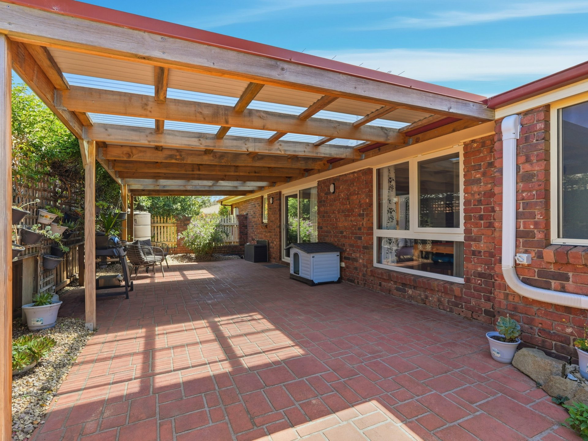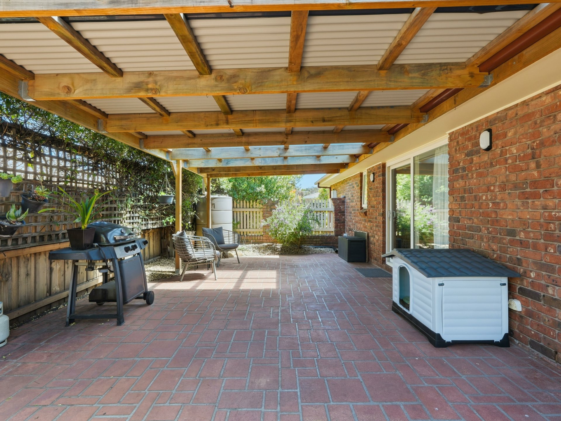 • Small water tank off the pergola roof – handy for the garden without raiding the mains.