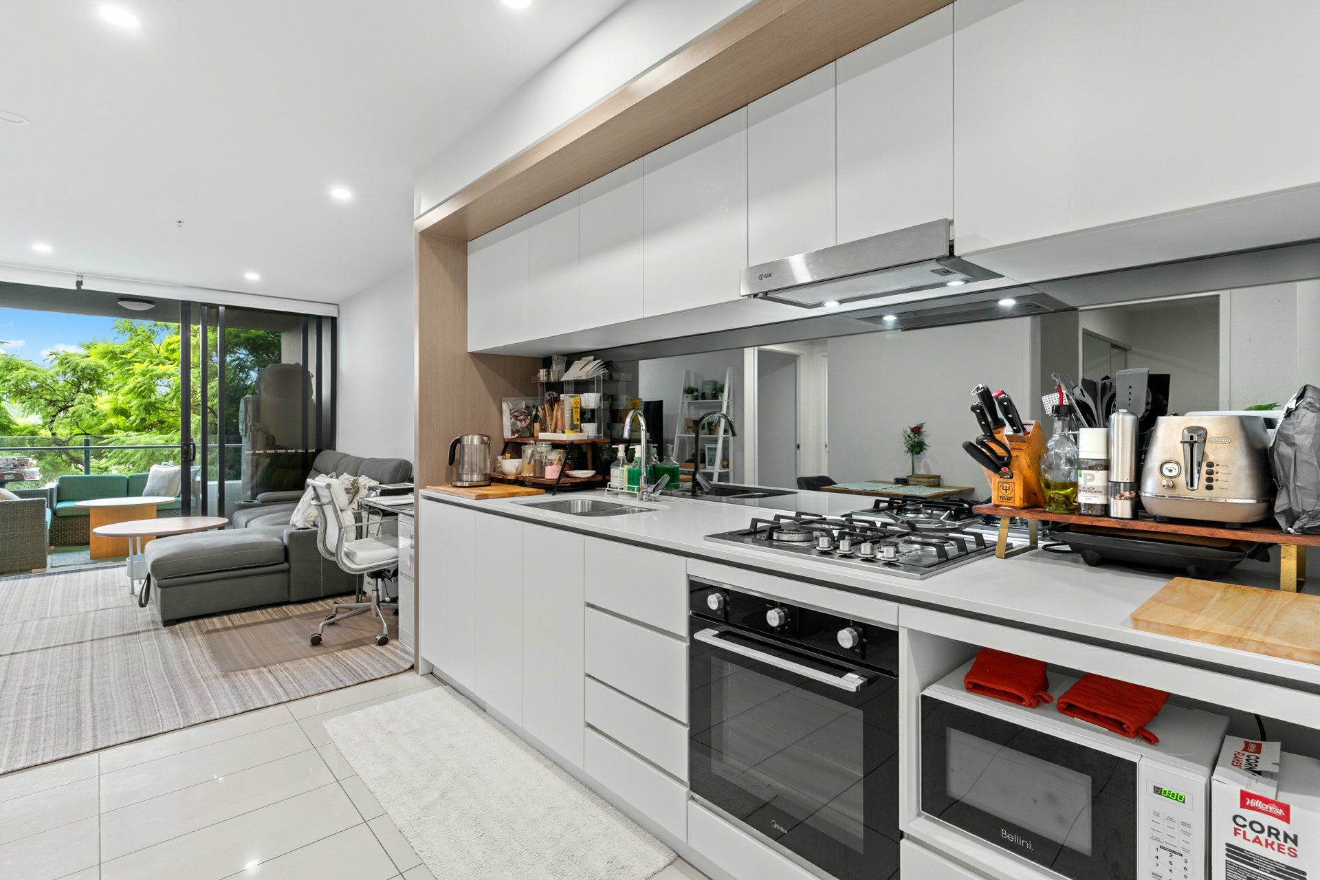 - Combined kitchen/meals/living extending onto a covered balcony with a leafy outlook