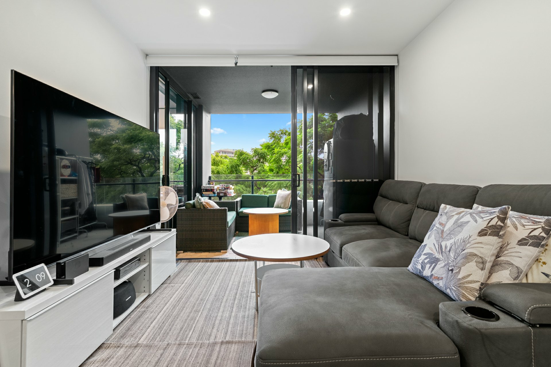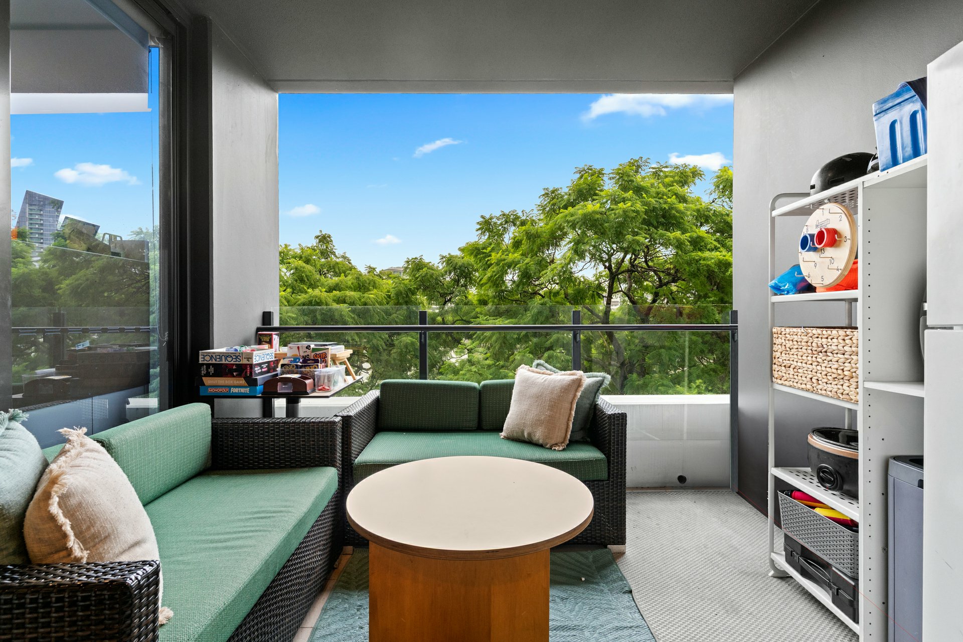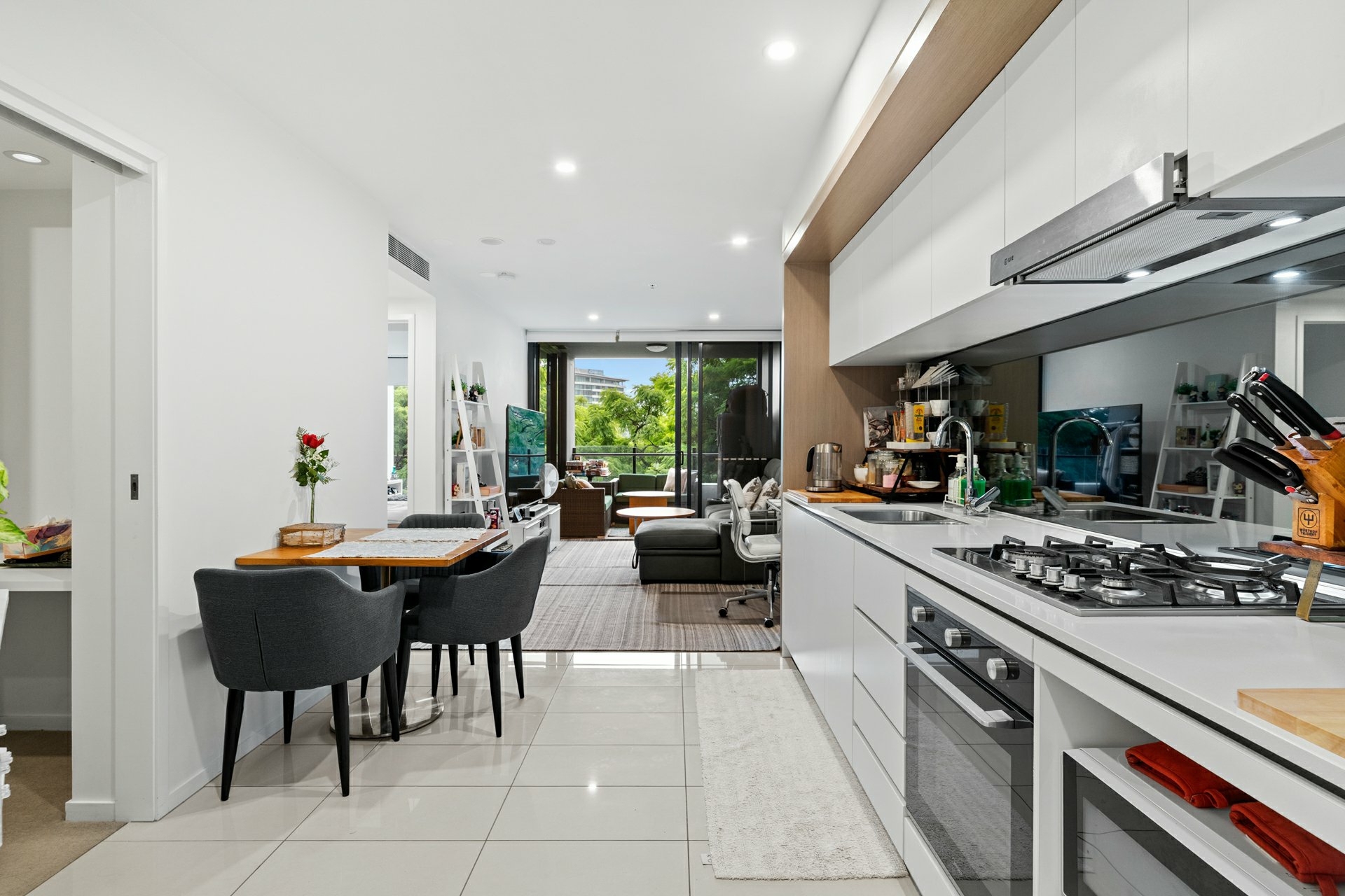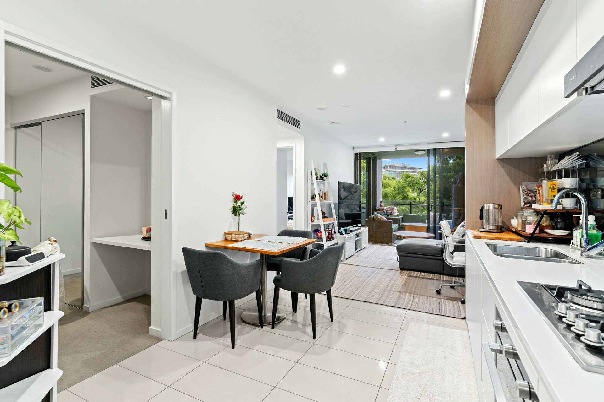 The apartment itself marries its stylish fit out with a space savvy layout underpinned by a tiled open-plan kitchen/meals/dining area that extends effortlessly onto a covered balcony with treetop views and room for a couple of sofas or a big outdoor table.