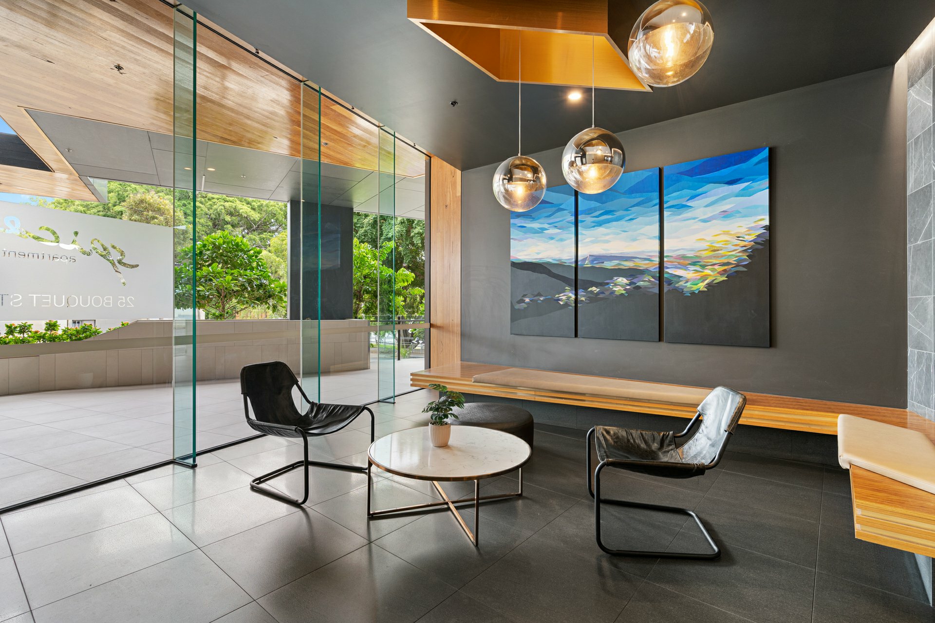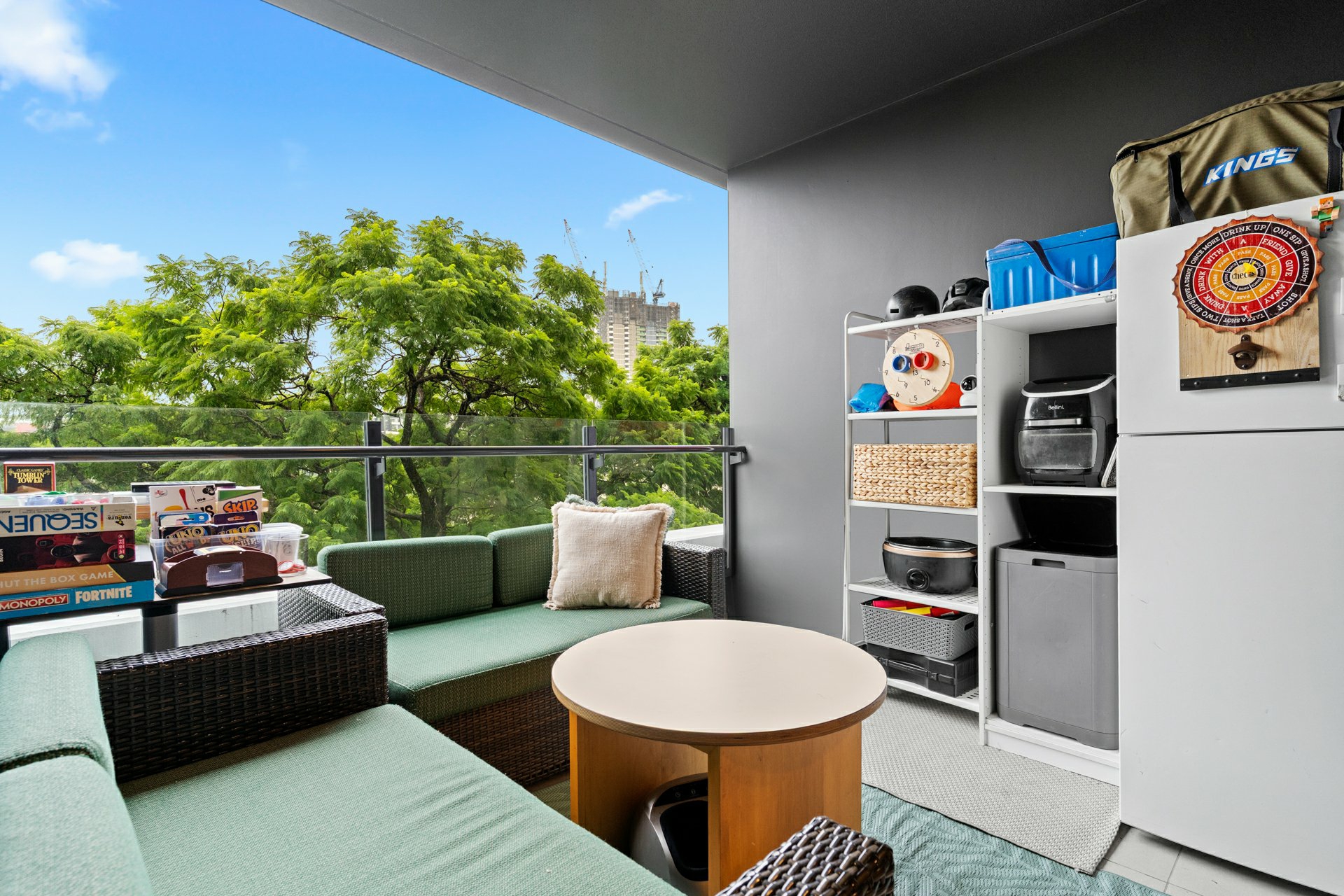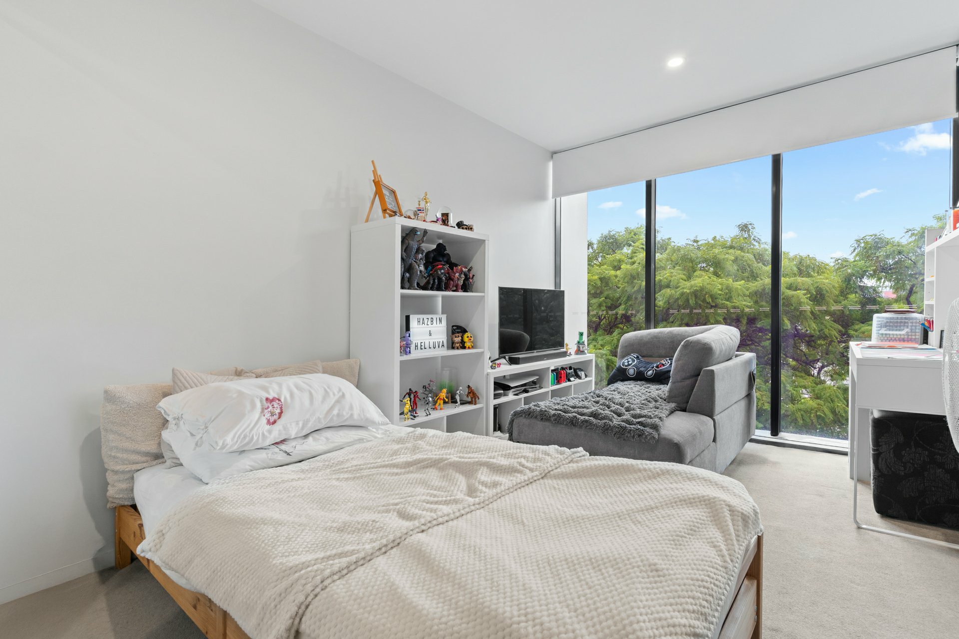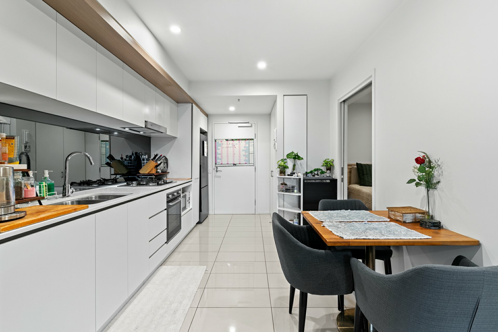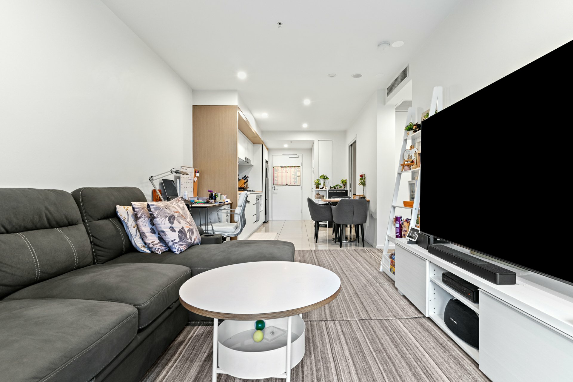 The apartment itself marries its stylish fit out with a space savvy layout underpinned by a tiled open-plan kitchen/meals/dining area that extends effortlessly onto a covered balcony with treetop views and room for a couple of sofas or a big outdoor table.