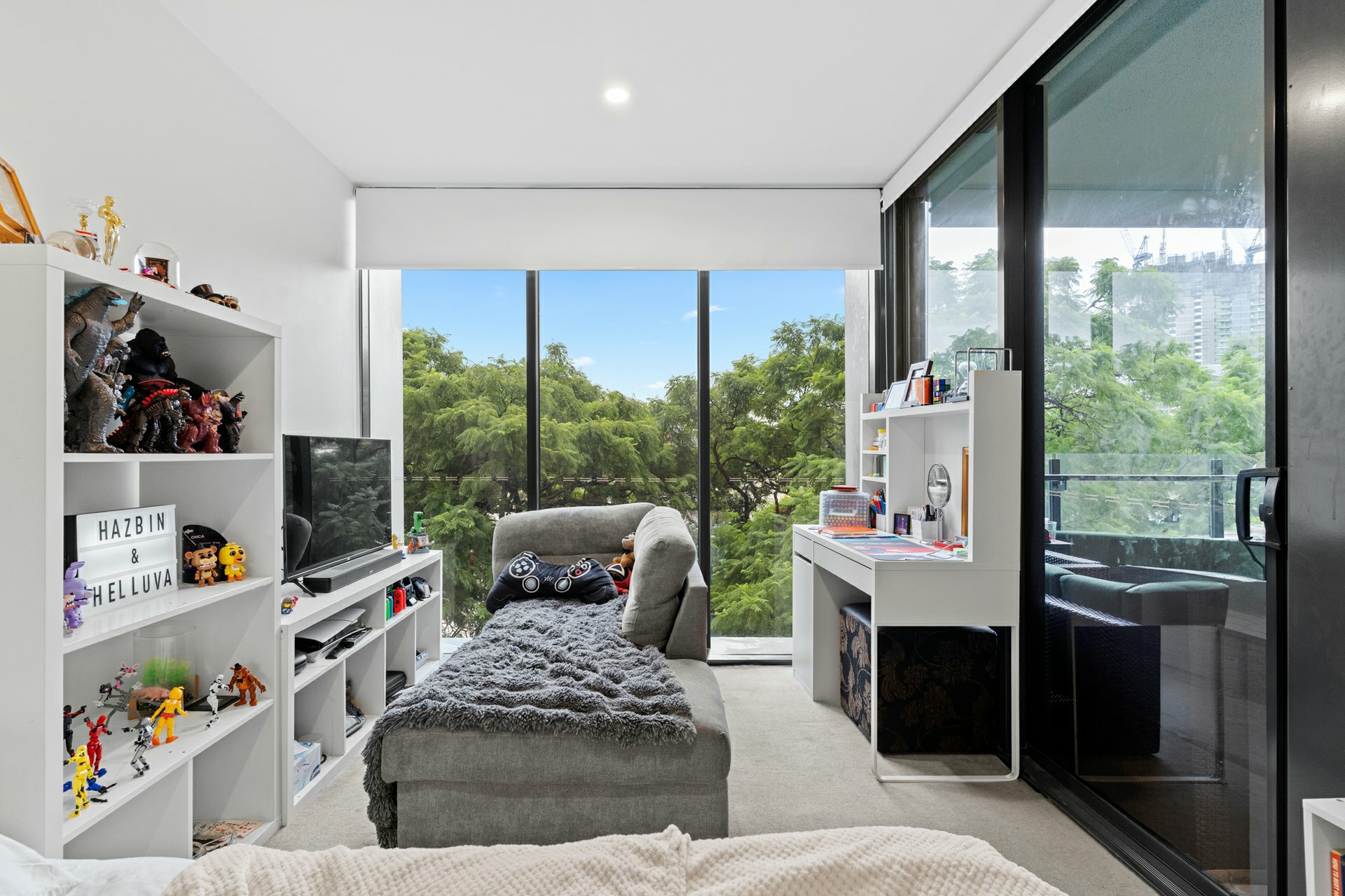Cosily carpeted, the 2 beds both have BIRs, the smaller with a study nook, the larger master enjoying balcony access and the same treetop vista through a wall of floor-to-ceiling glass.