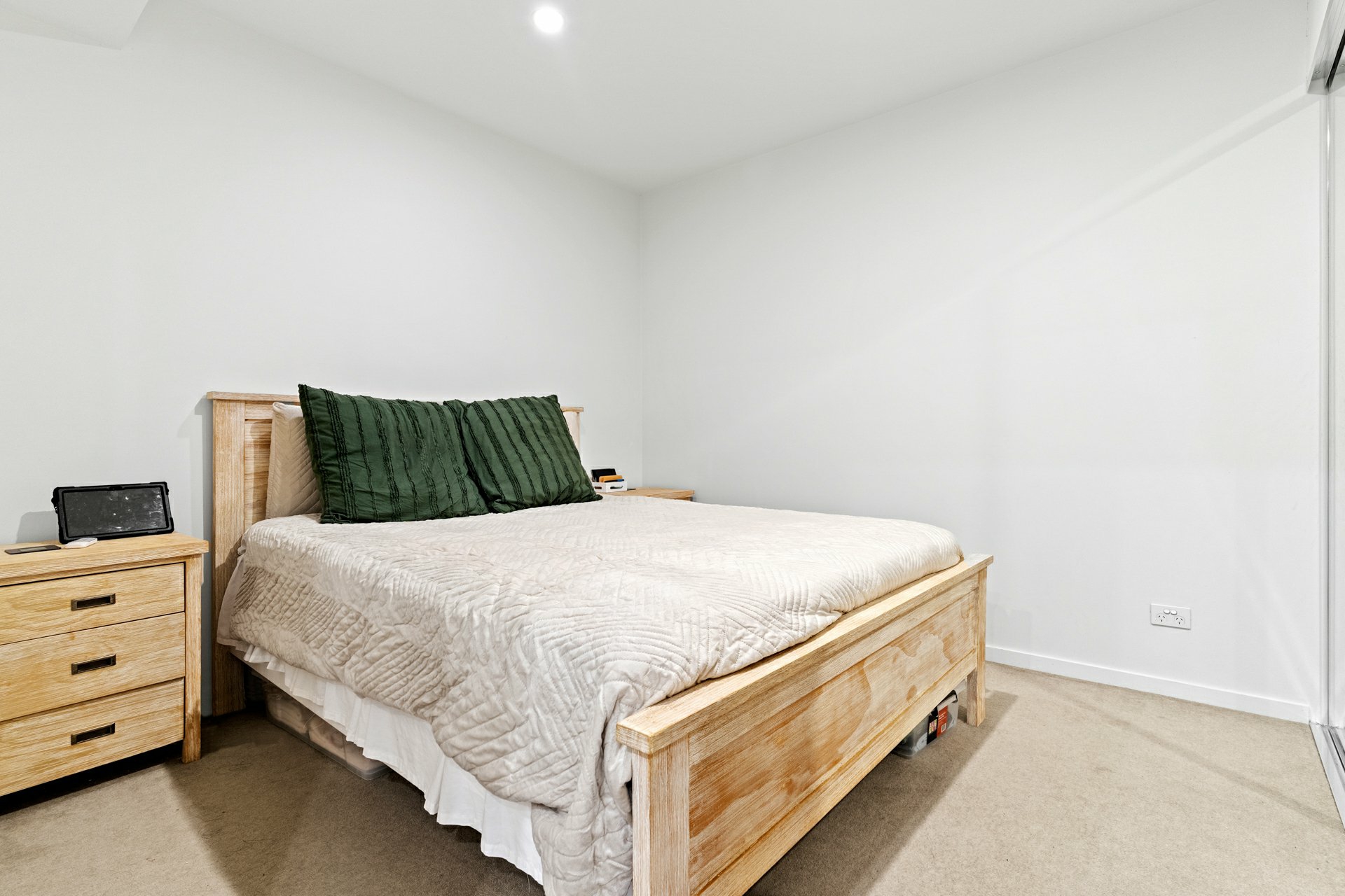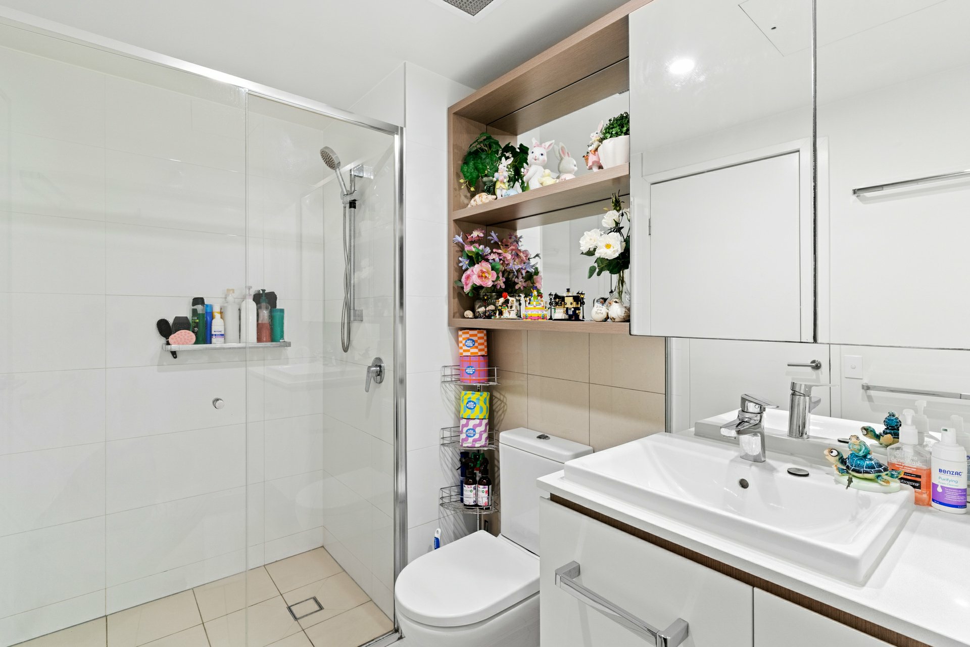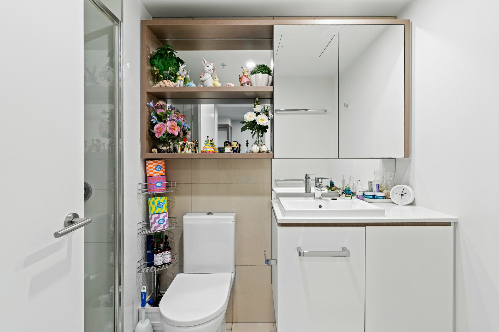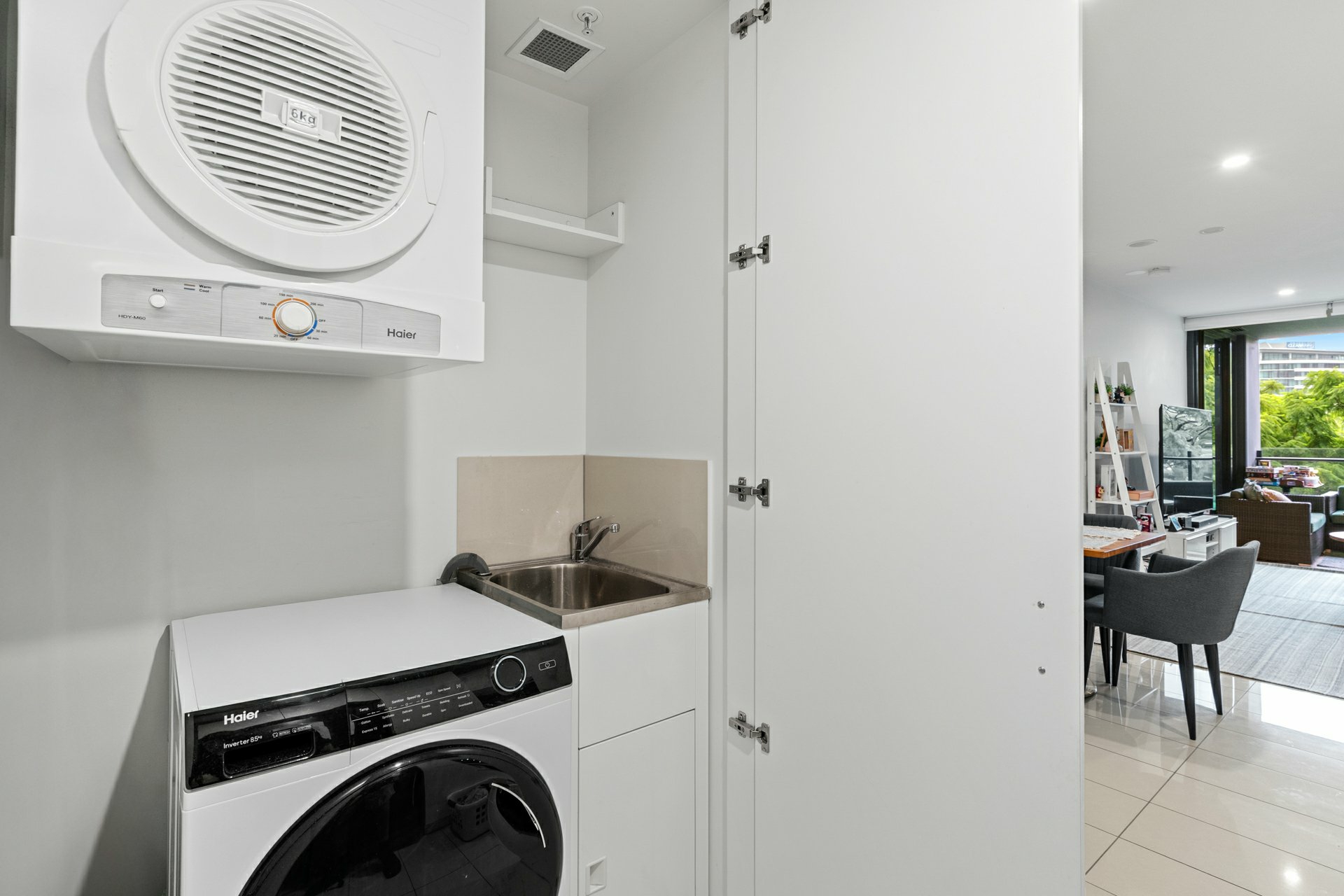 Elsewhere, the bathroom incorporates a glass enclosed shower and valuable storage behind the vanity mirror and under the basin, while the laundry is disguised as a cupboard at the front entry, but still manages to house a washer, wall-mounted dryer, and trough.