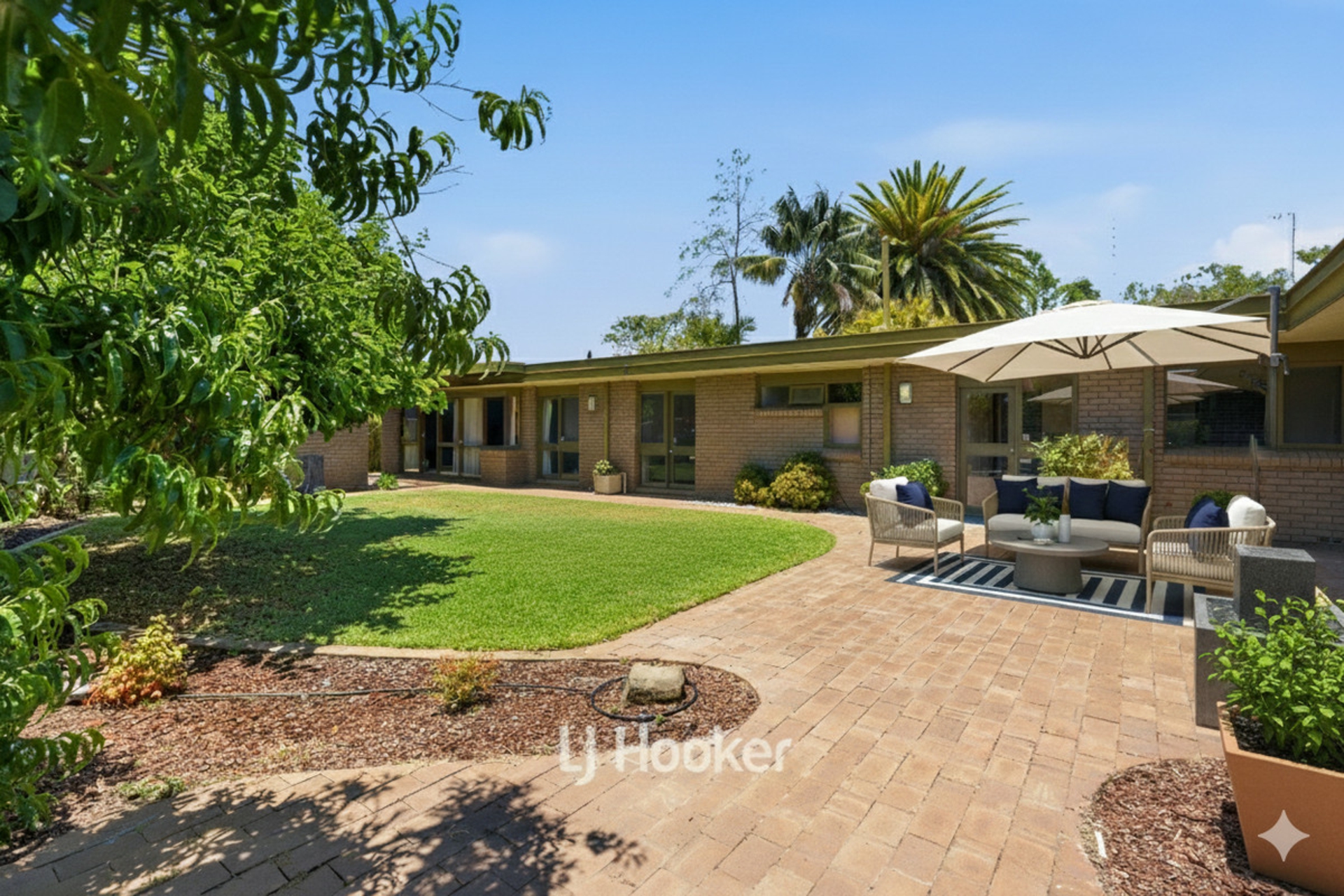 Stepping inside, you're welcomed by an inviting L-shaped layout that showcases subtle 1970s retro touches throughout. The home features a formal dining room, a cosy sunken lounge and a tastefully renovated kitchen. A wide central hallway flows through to all three bedrooms, each with its own external door opening out to the gardens, along with the main bathroom and an oversized laundry.