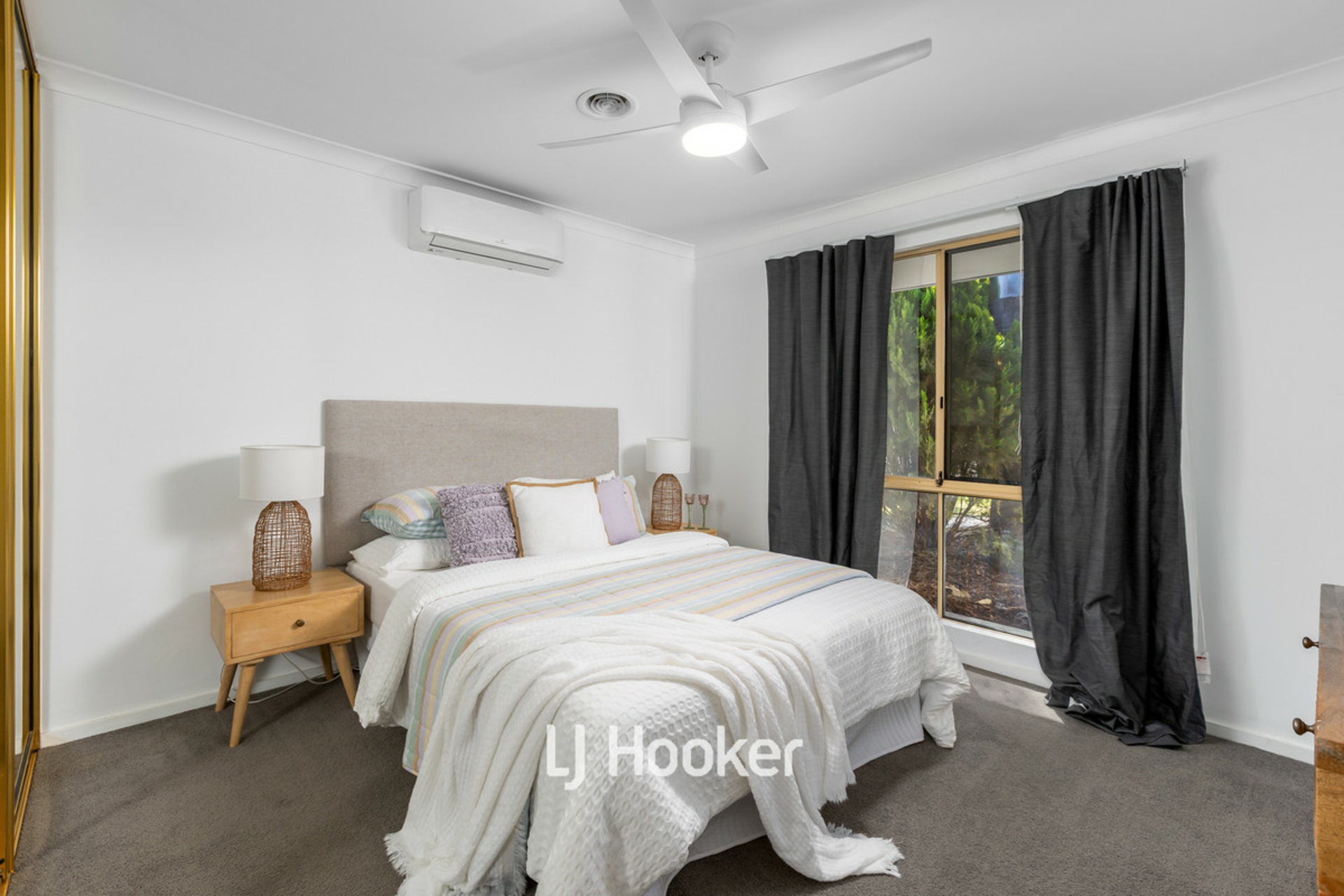 - Main bedroom with built-in robe, split system AC, and ducted heating vent