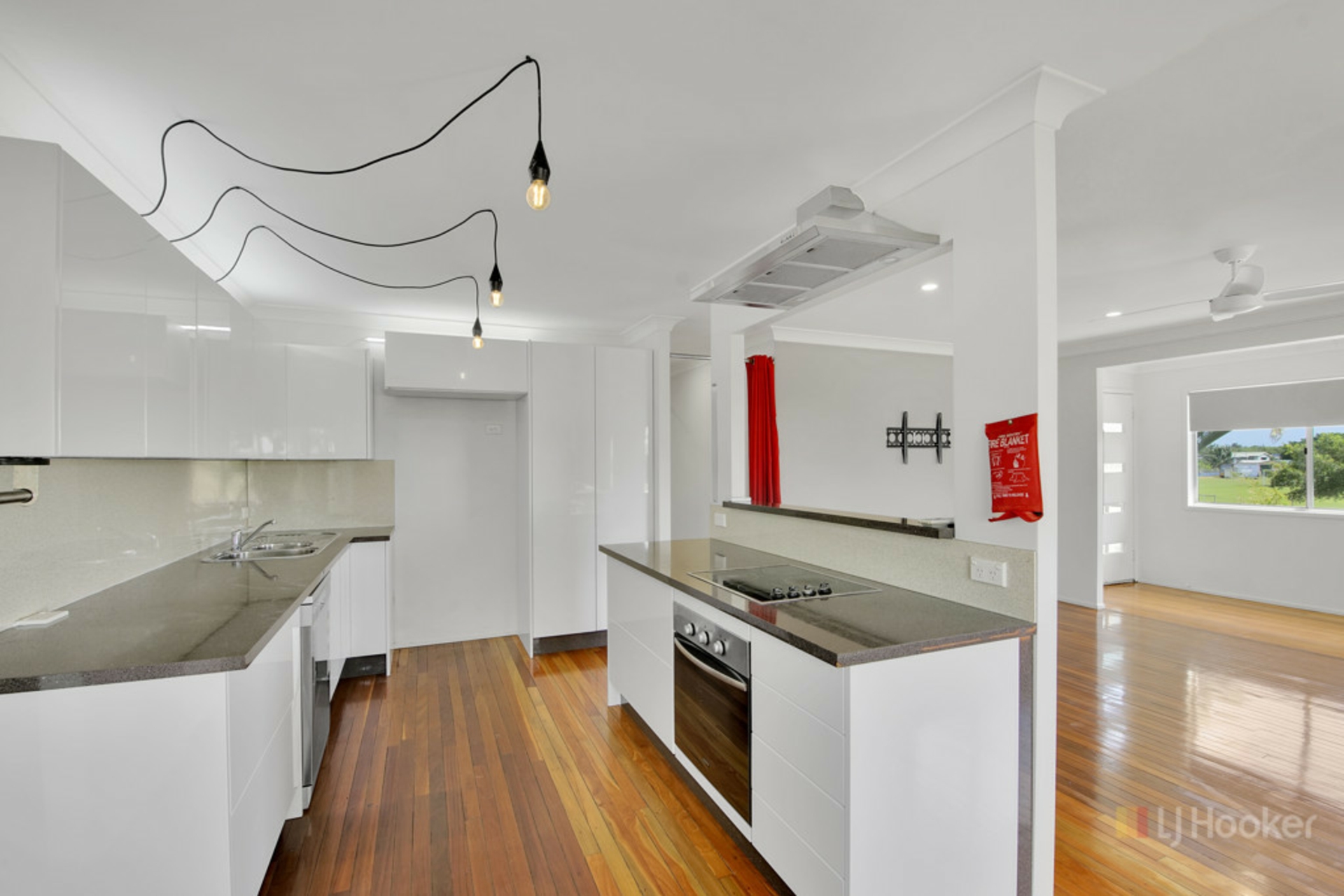 Open plan living, dining, and modern kitchen with study nook
