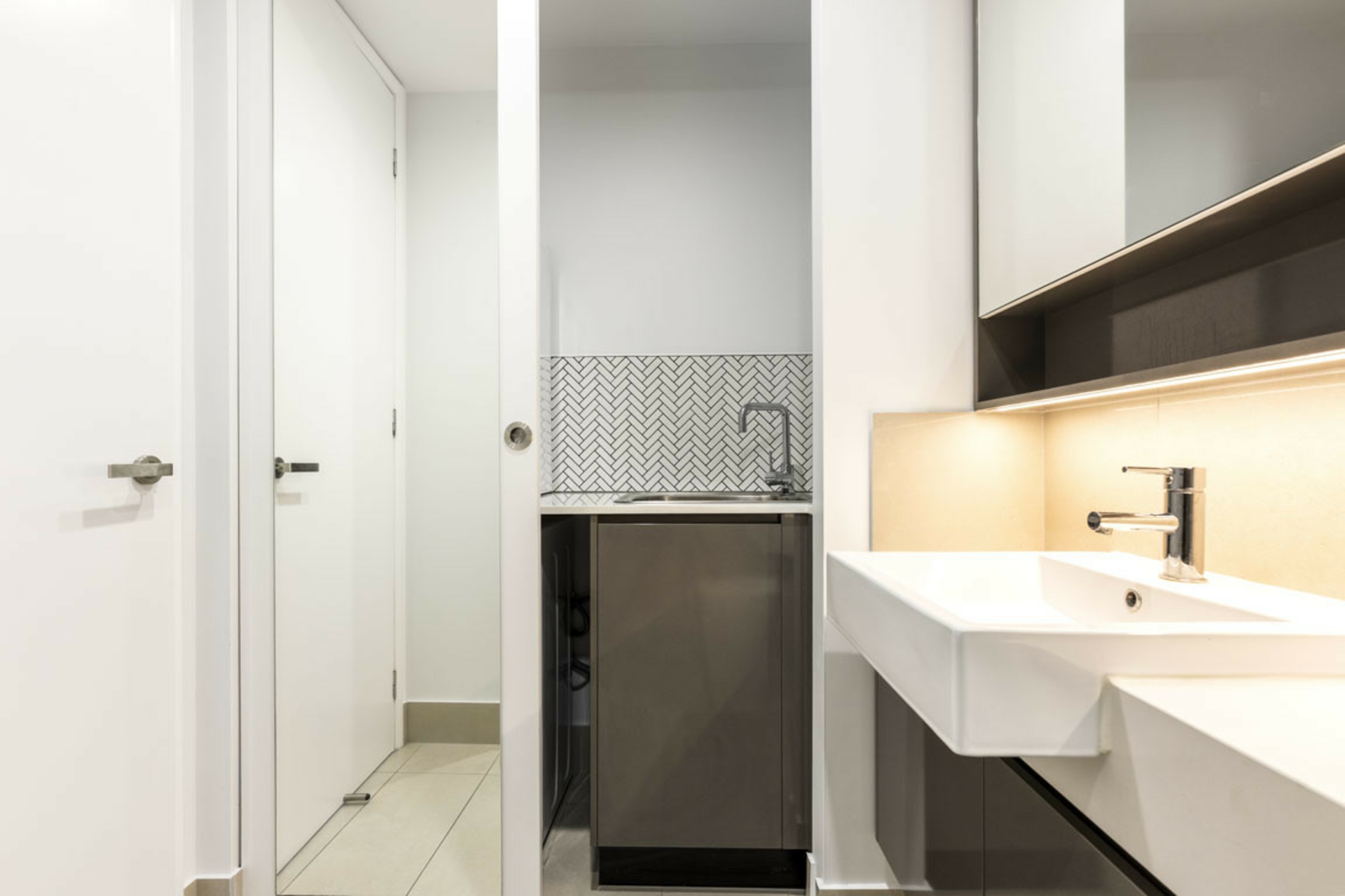 •Timber look flooring brings a natural, nearly coastal feel to the apartment and is hard wearing