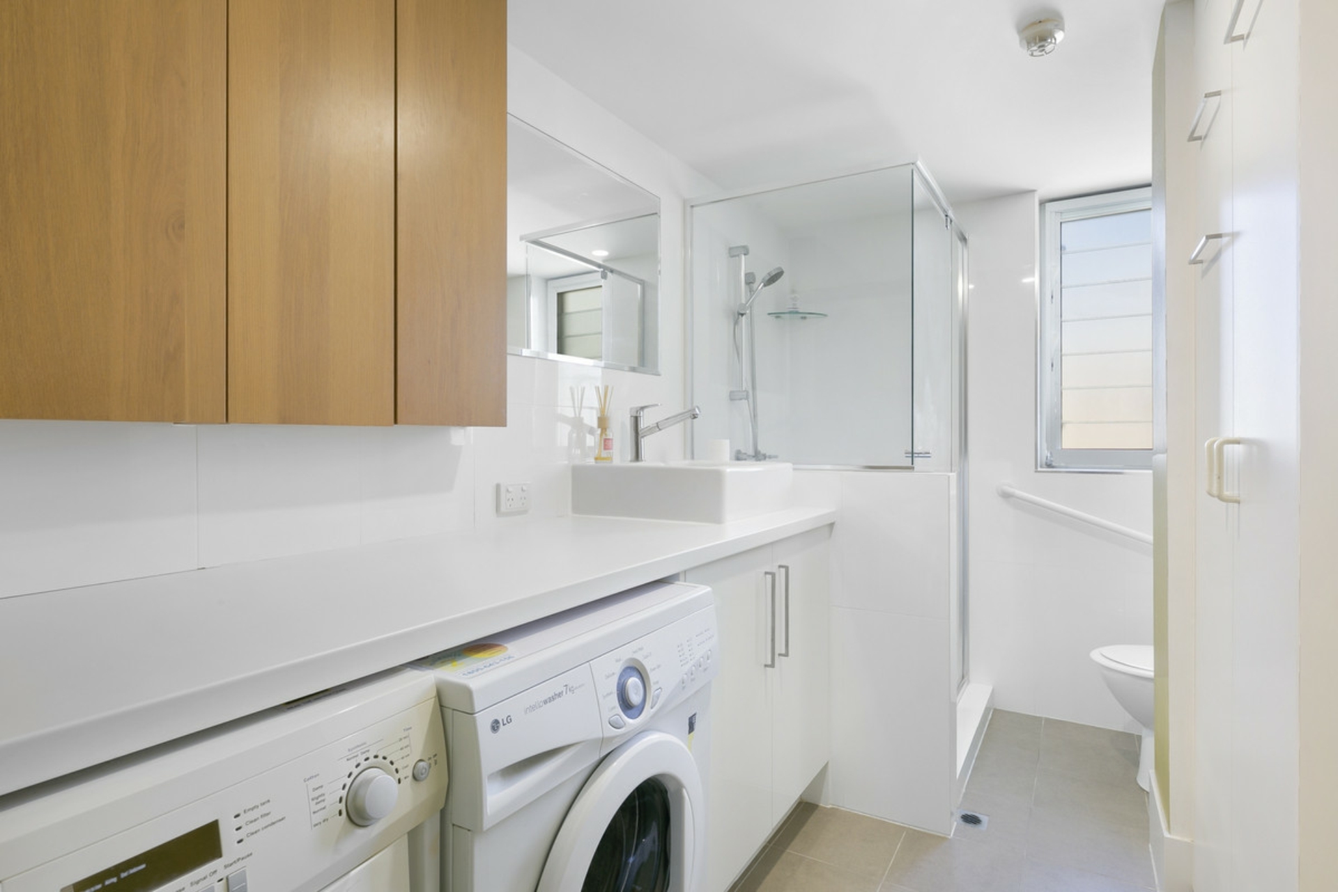 - 1 modern bathroom which includes the built in laundry with washing machine and dryer included