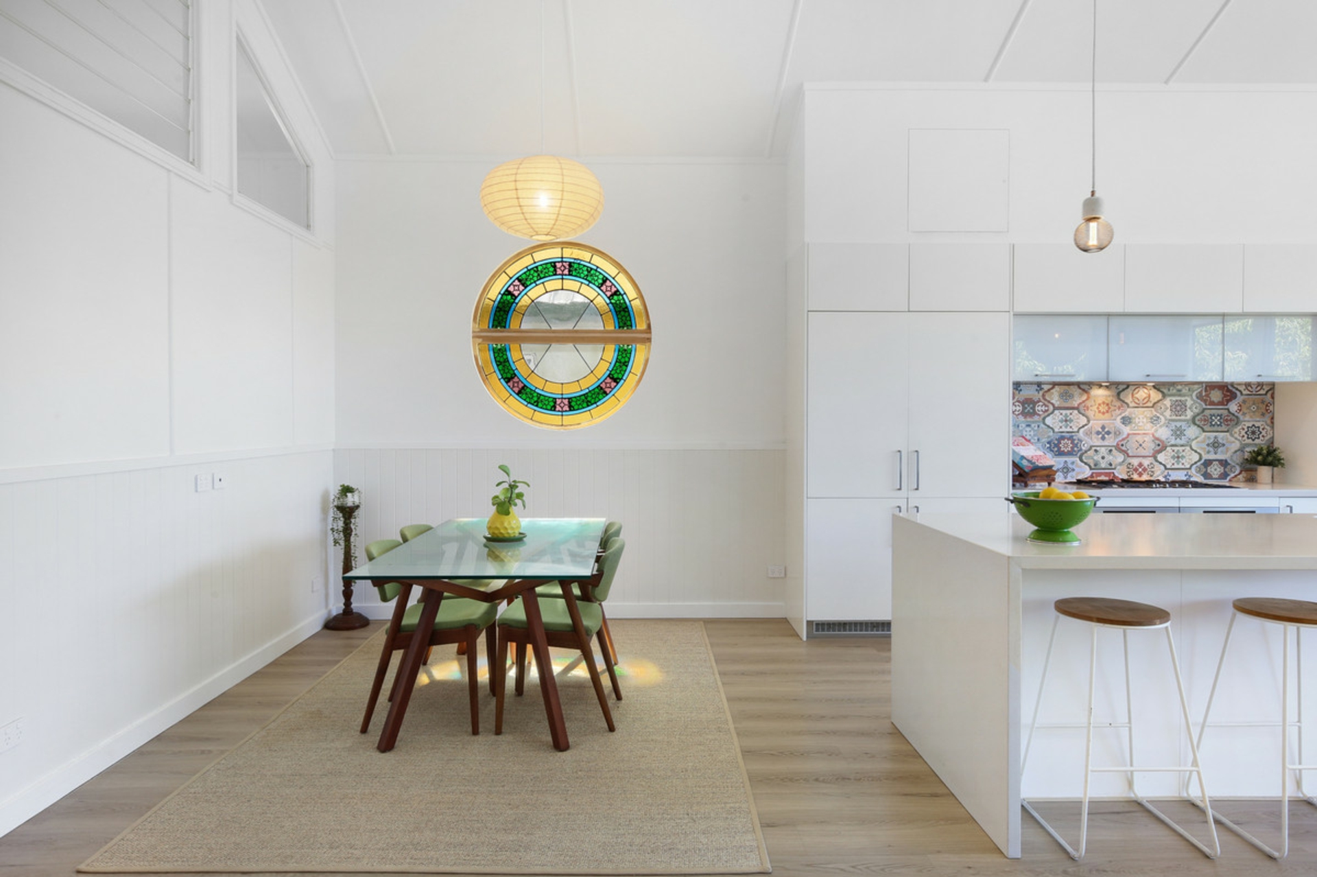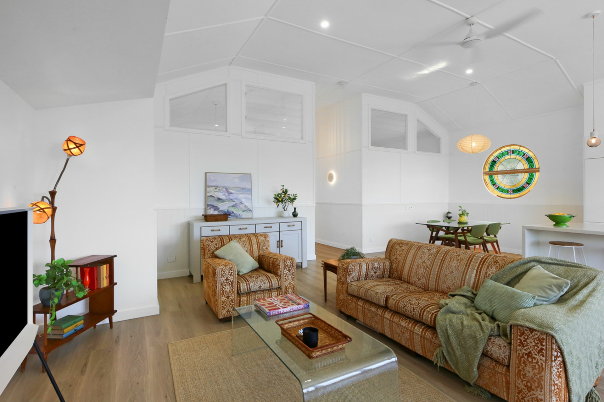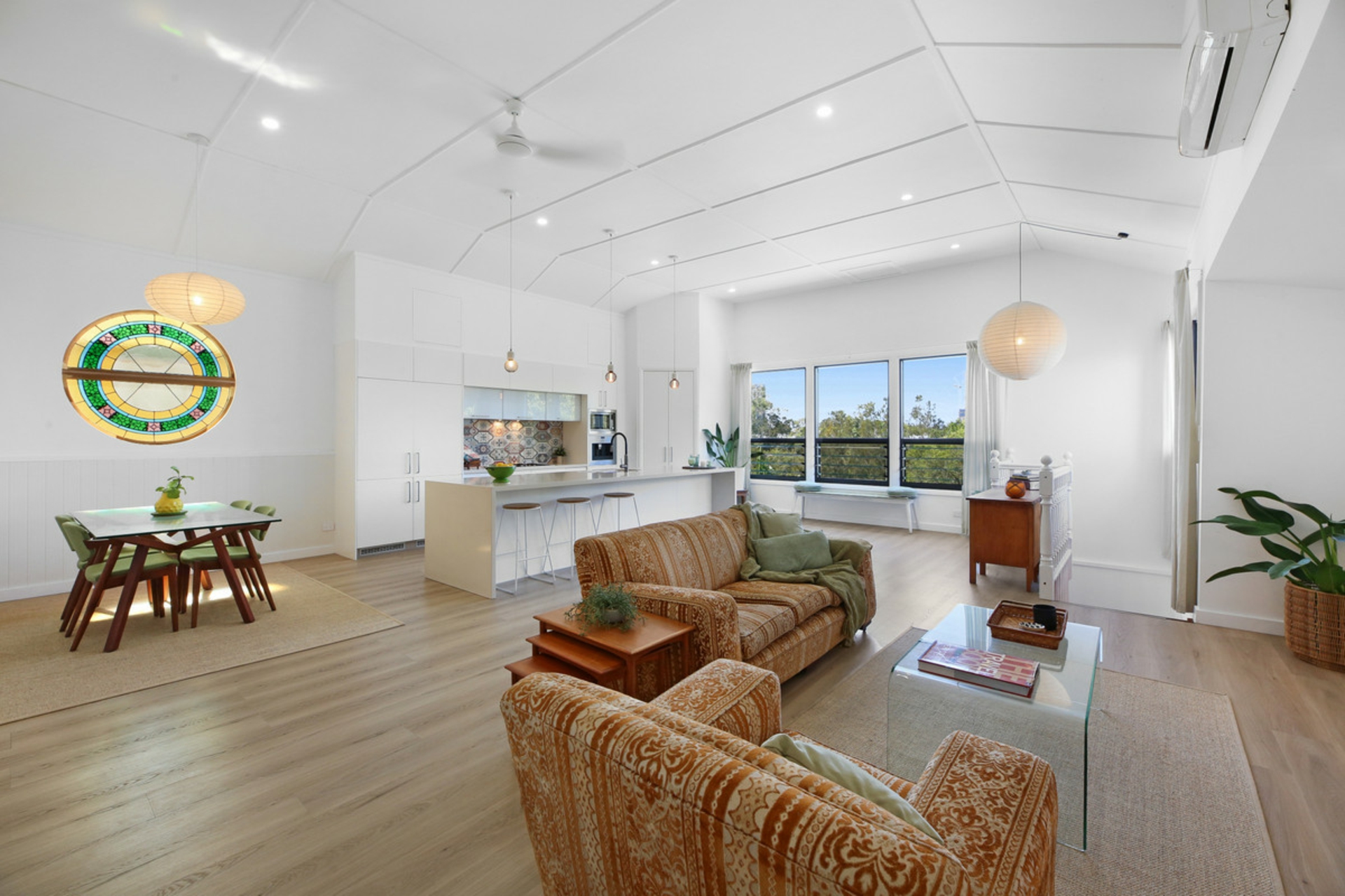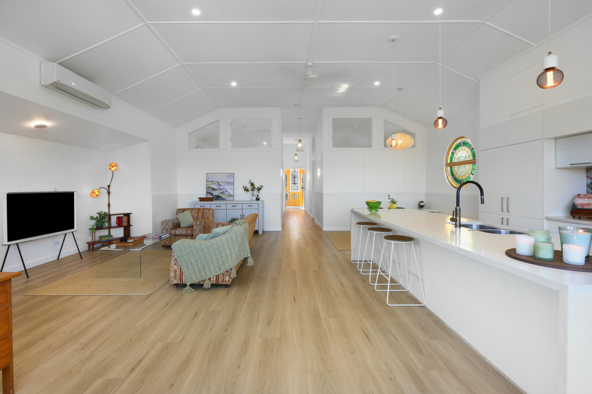 Behind the preserved exterior, the home is defined by light and sheer volume. The soaring vaulted ceilings and expansive open-plan living create a calm, airy interior where reclaimed timber and bespoke leadlight windows meet sleek, modern finishes. Every detail has been handled with care to ensure the building's heritage is honoured while providing the comforts of a high-end renovation full of character and charm.