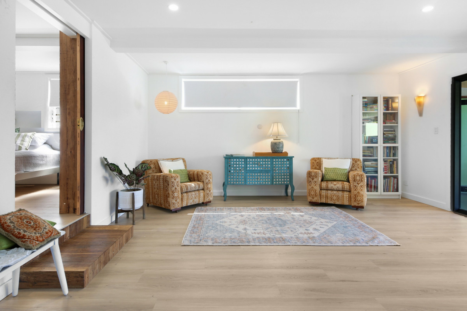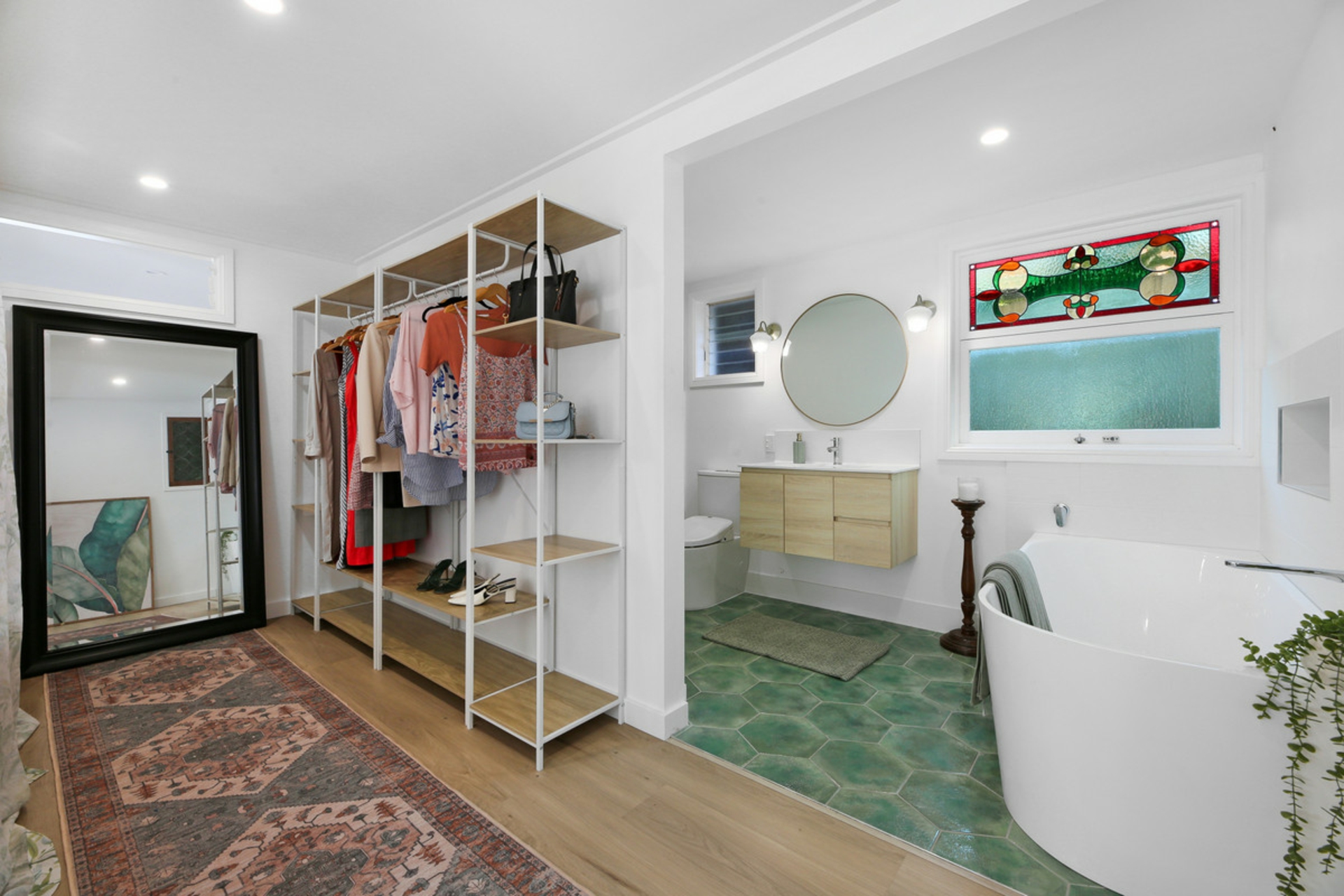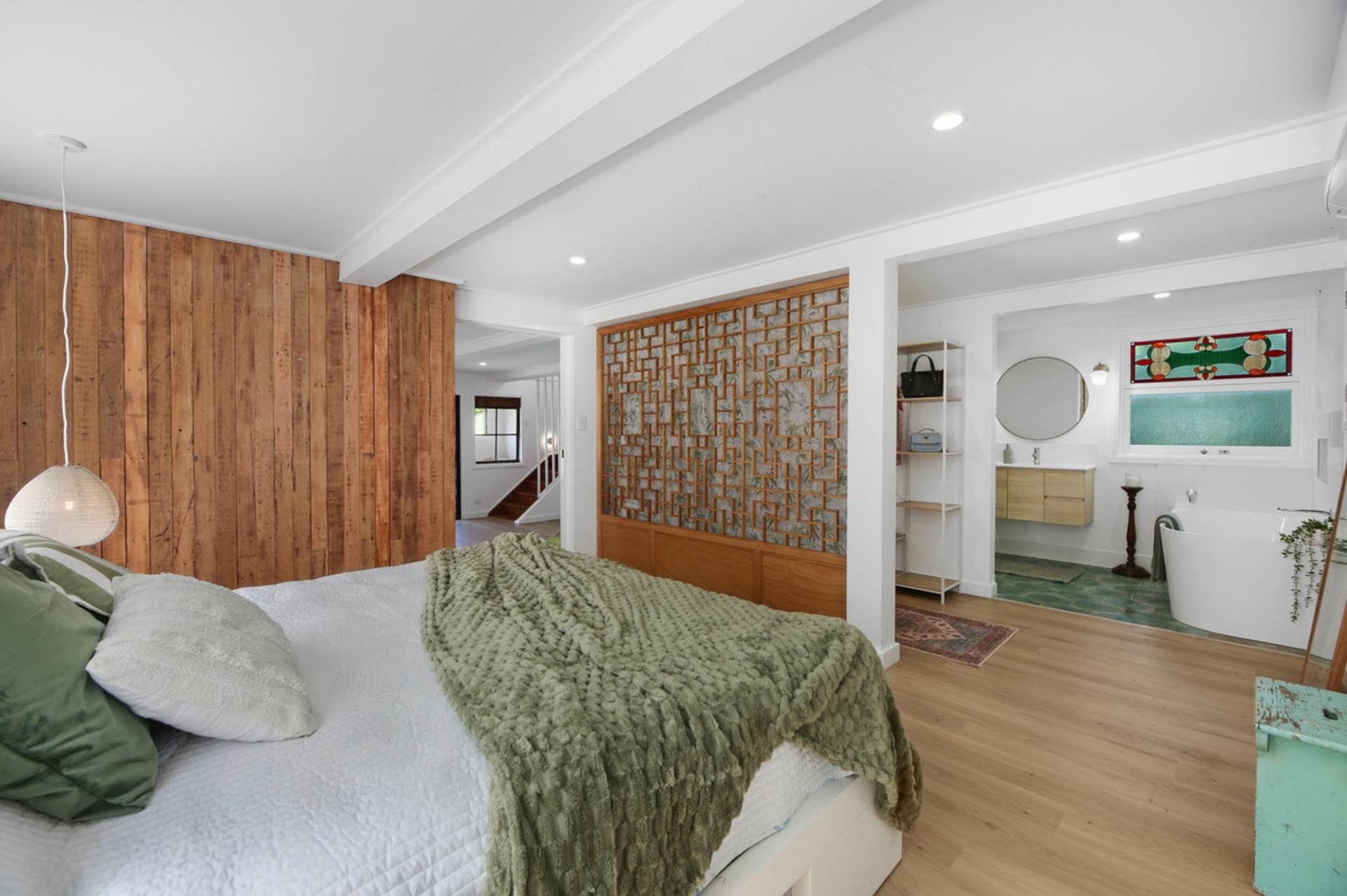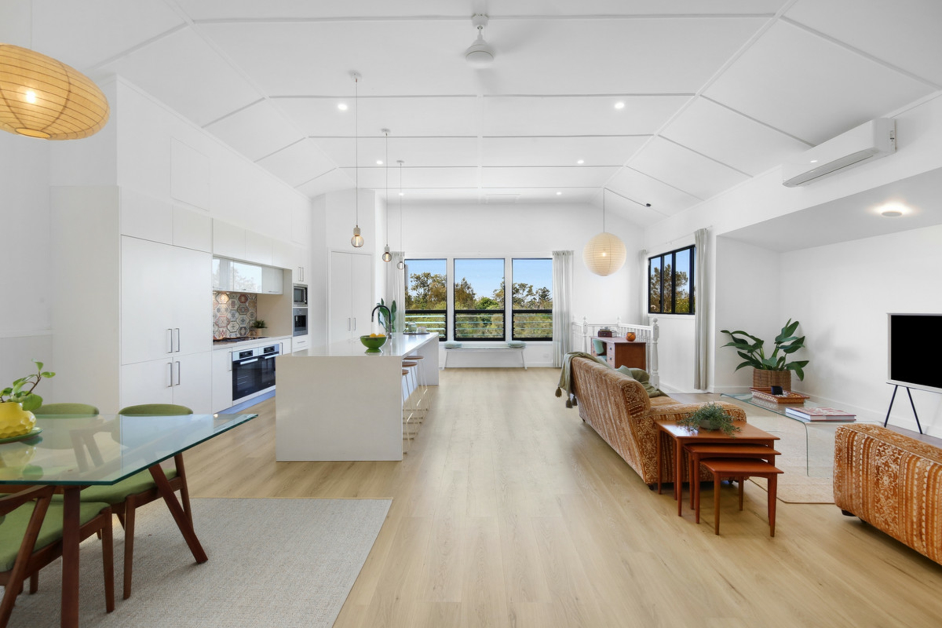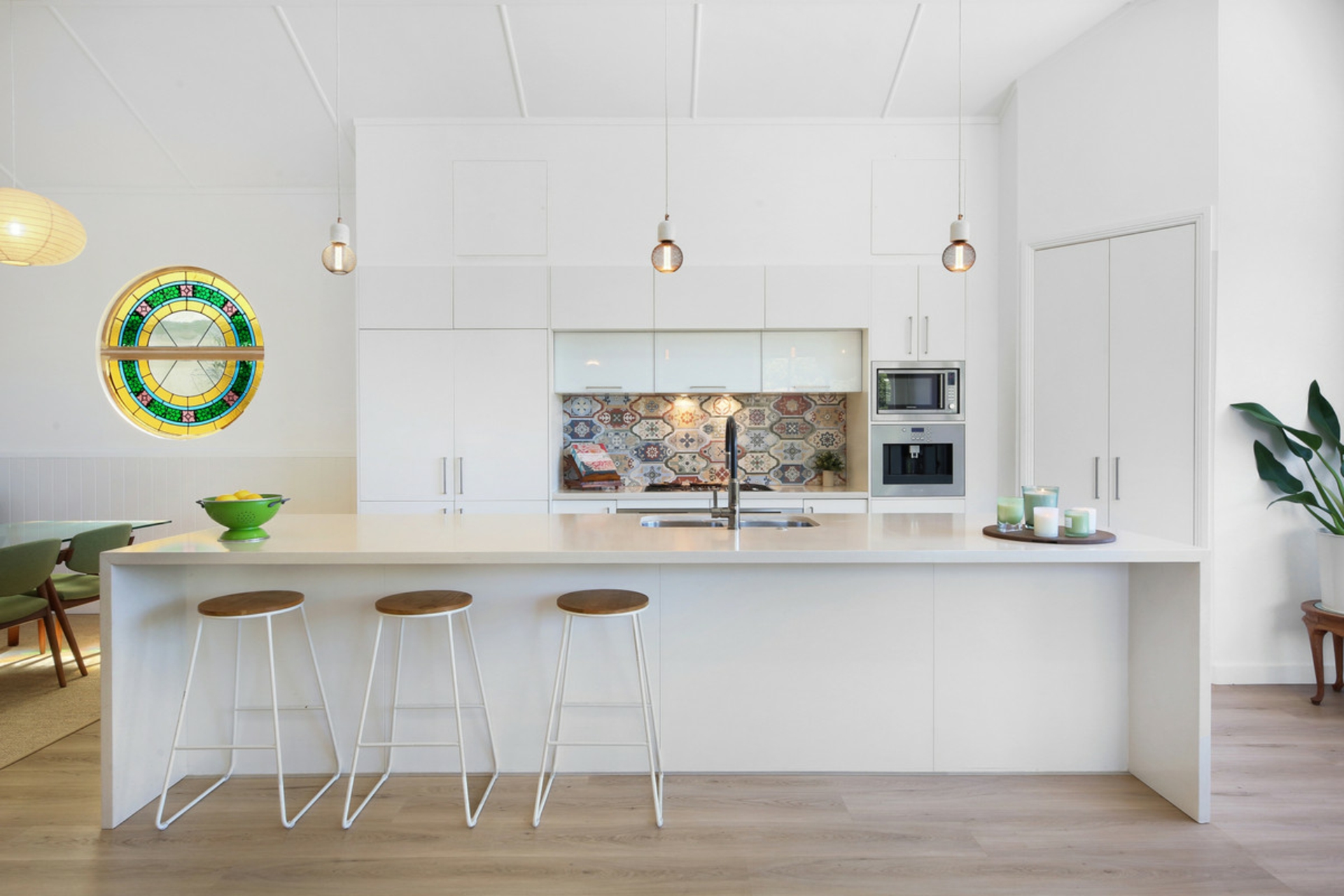 Behind the preserved exterior, the home is defined by light and sheer volume. The soaring vaulted ceilings and expansive open-plan living create a calm, airy interior where reclaimed timber and bespoke leadlight windows meet sleek, modern finishes. Every detail has been handled with care to ensure the building's heritage is honoured while providing the comforts of a high-end renovation full of character and charm.
