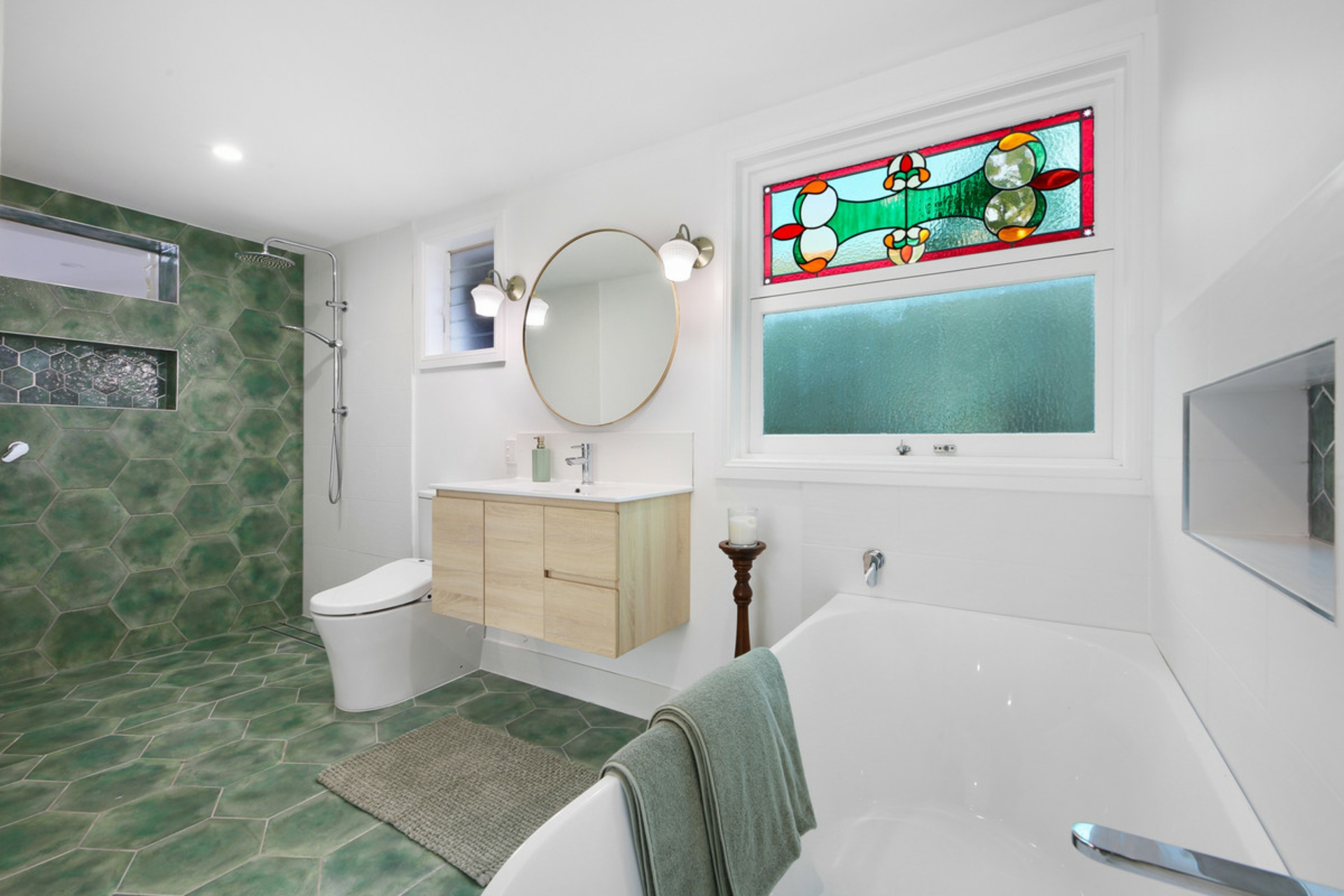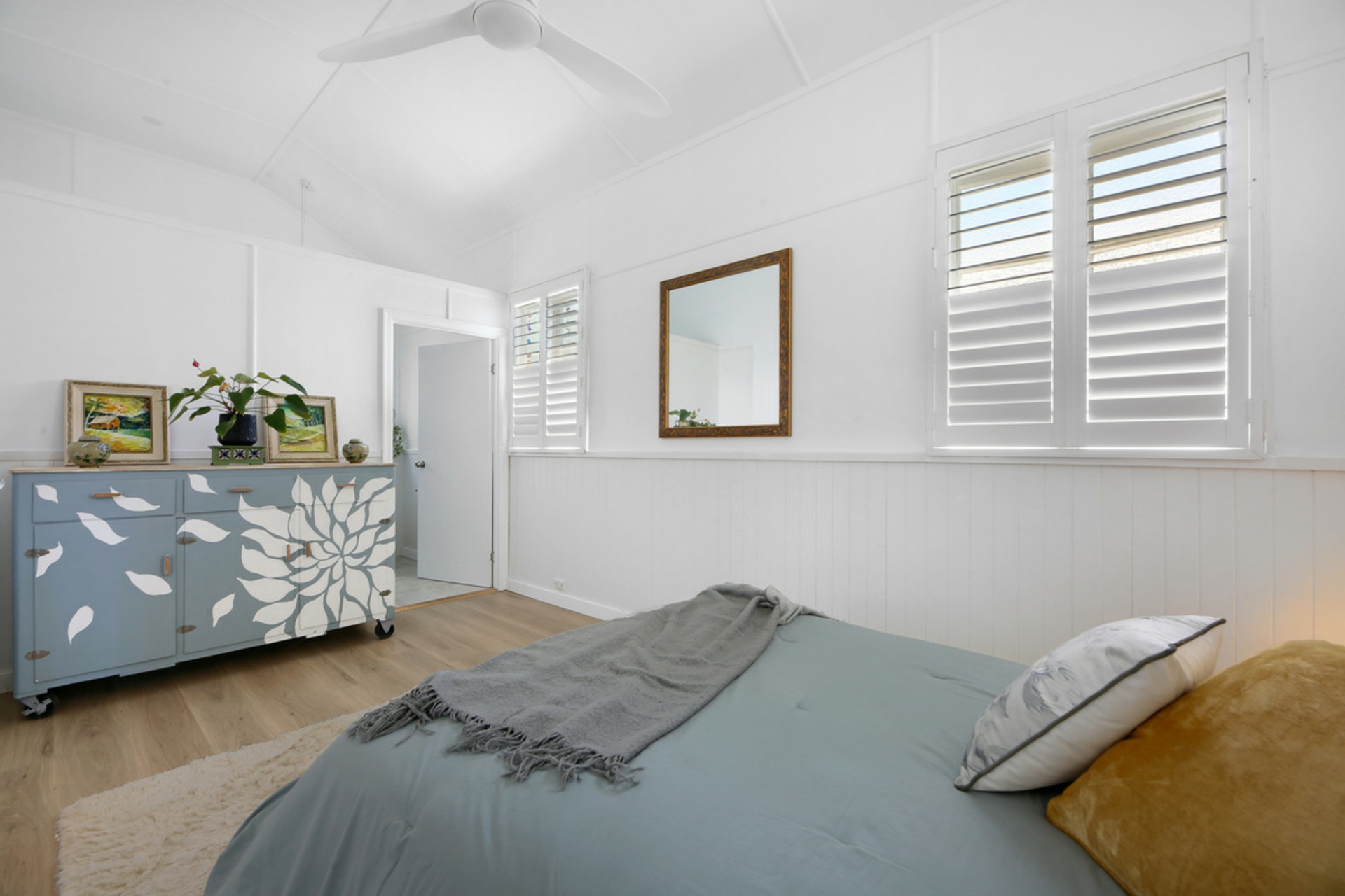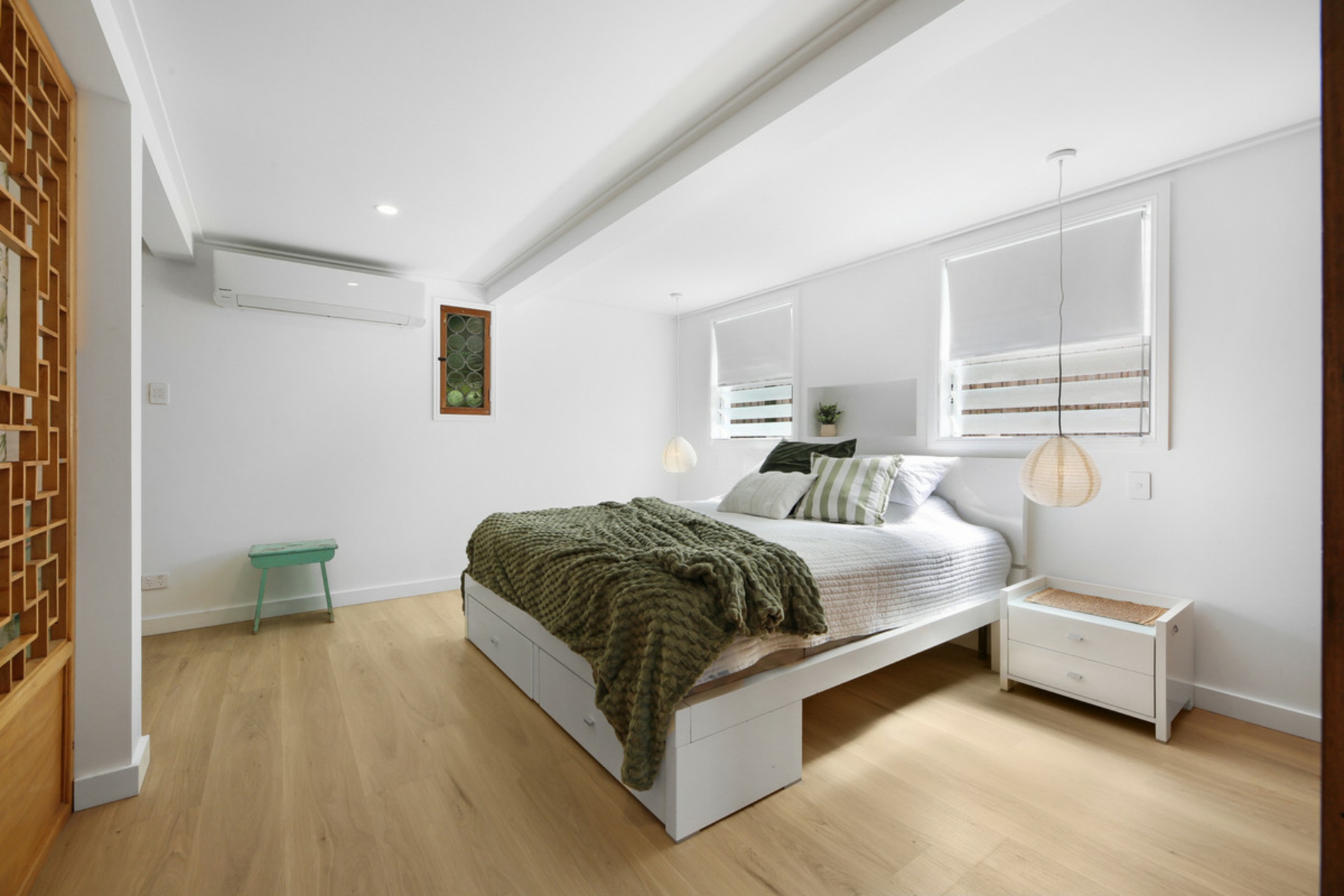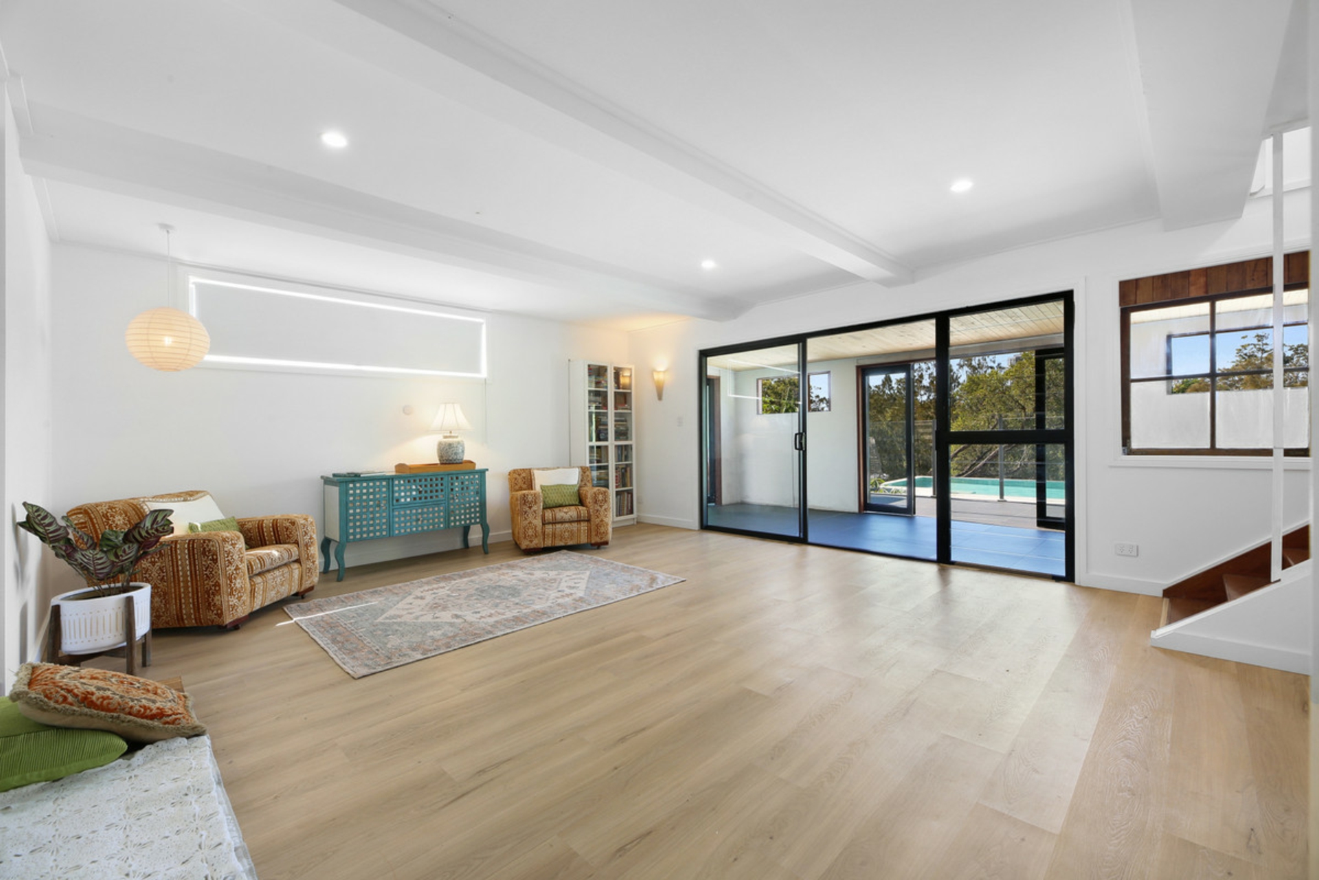 Behind the preserved exterior, the home is defined by light and sheer volume. The soaring vaulted ceilings and expansive open-plan living create a calm, airy interior where reclaimed timber and bespoke leadlight windows meet sleek, modern finishes. Every detail has been handled with care to ensure the building's heritage is honoured while providing the comforts of a high-end renovation full of character and charm.