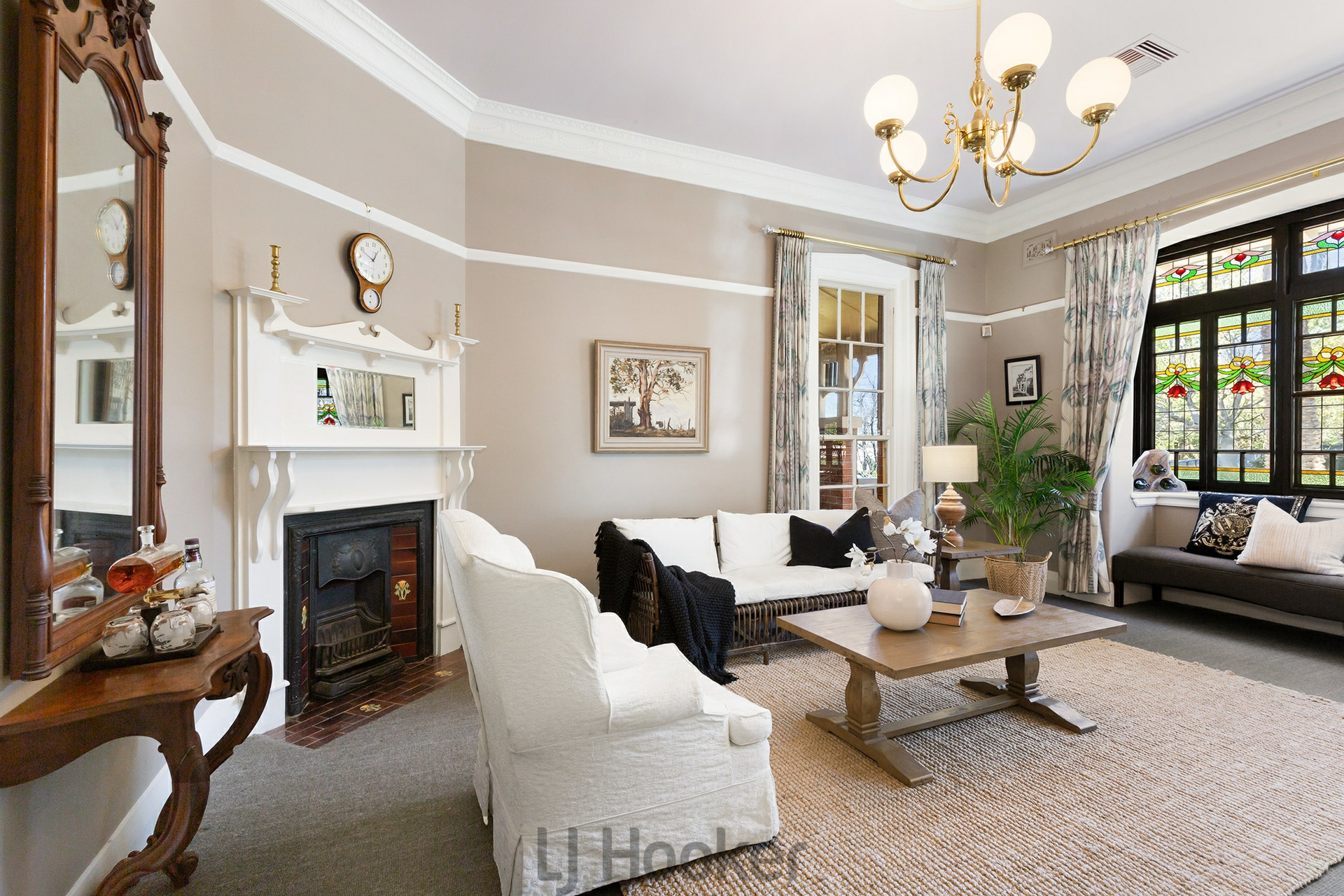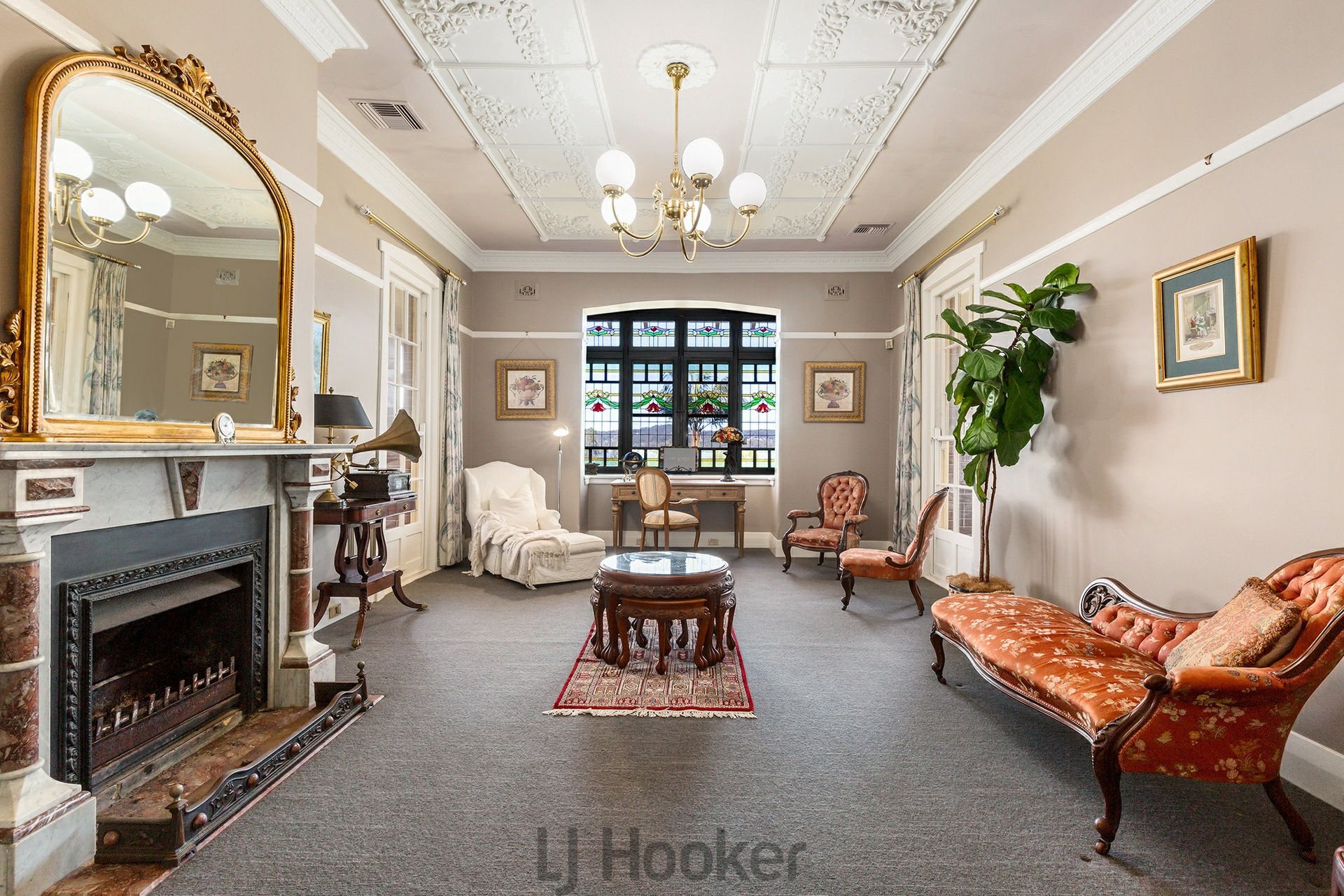 - Magnificent formal dining room with period fireplace and federation stained glass windows