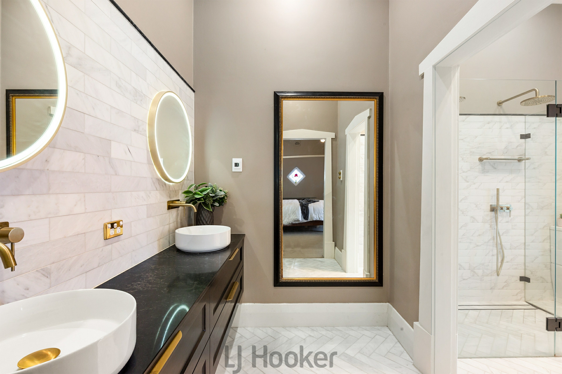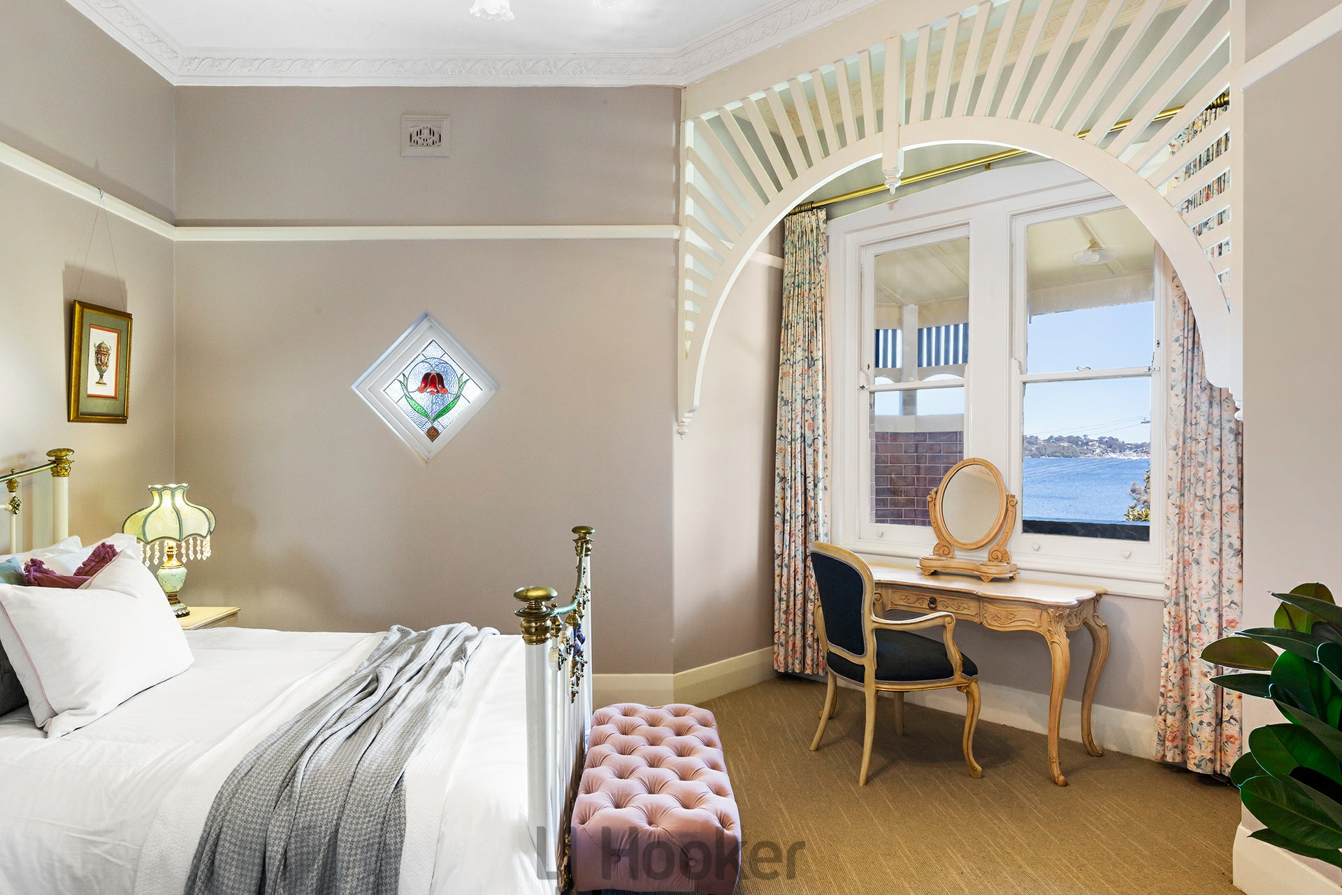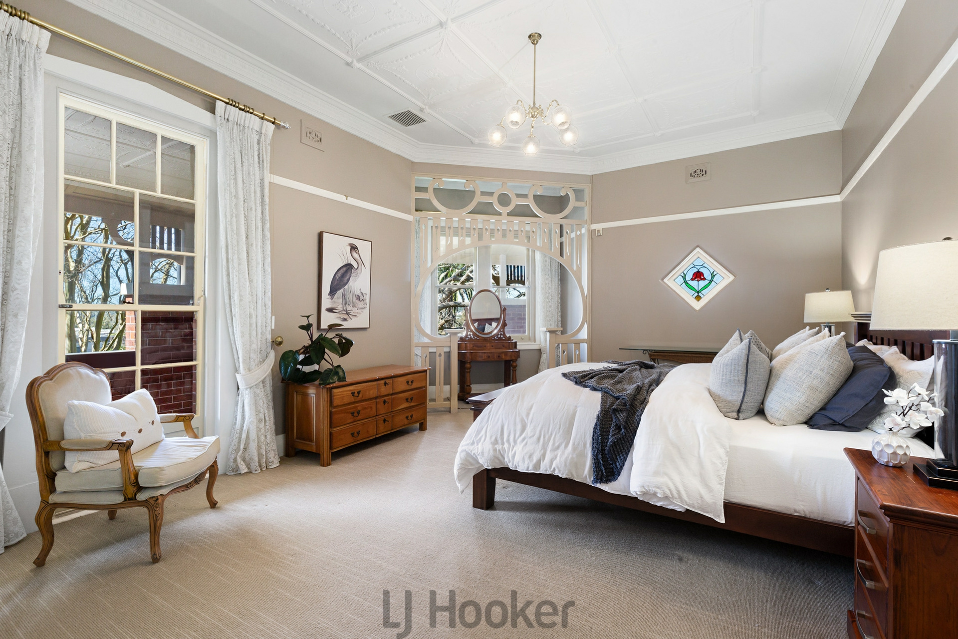 - Magnificent master bedroom with feature bay windows and timber fretwork, built-in robe and ensuite