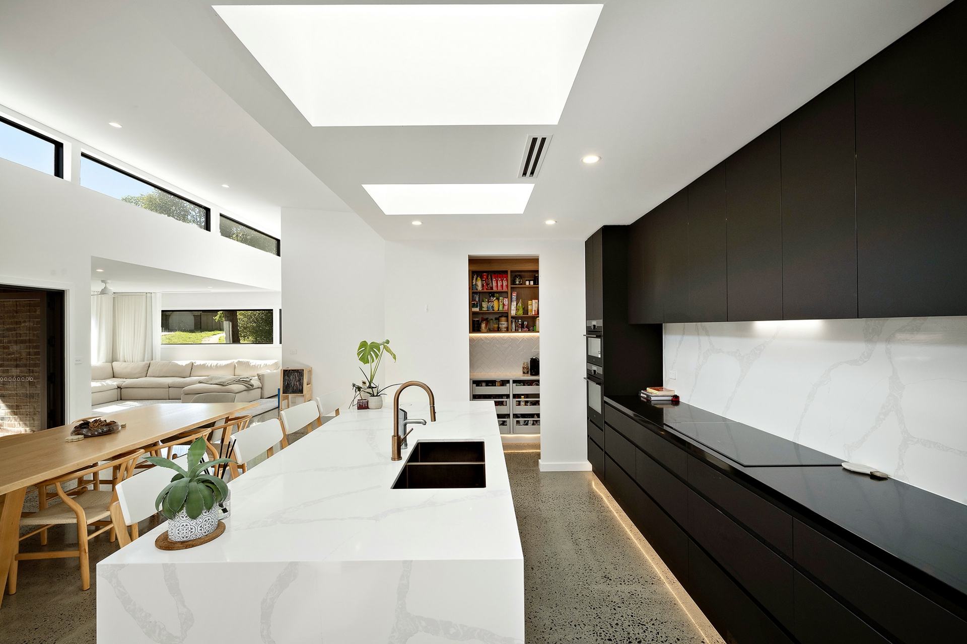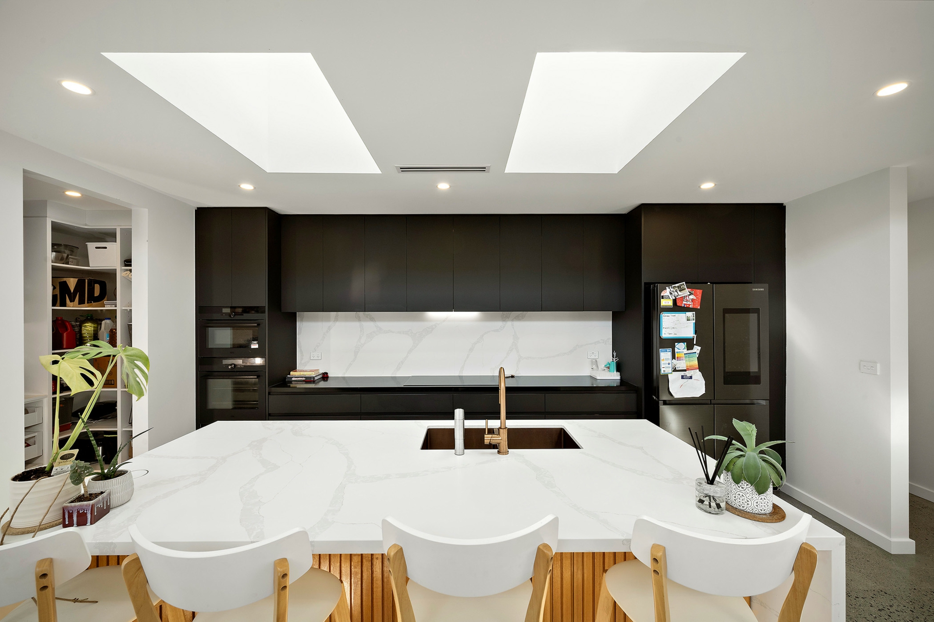•Designer kitchen appointed with quality appliances, stone surfaces, custom joinery and a walk-in pantry, forming the centrepiece of the home