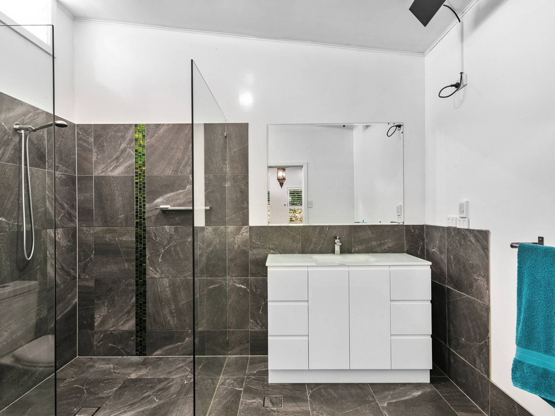 En-suite off the master with extra-large frameless shower cubicle, high louvre windows for ventilation, toilet and vanity unit with glass sink