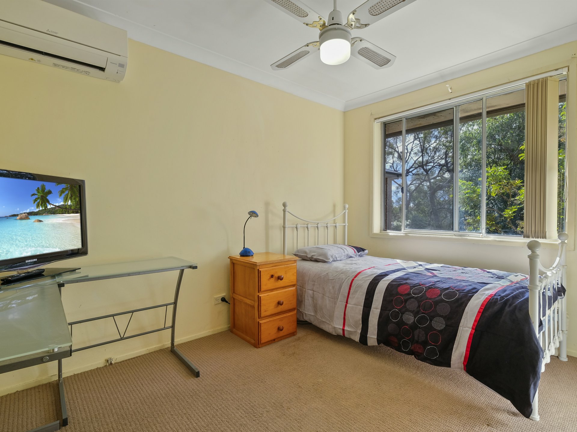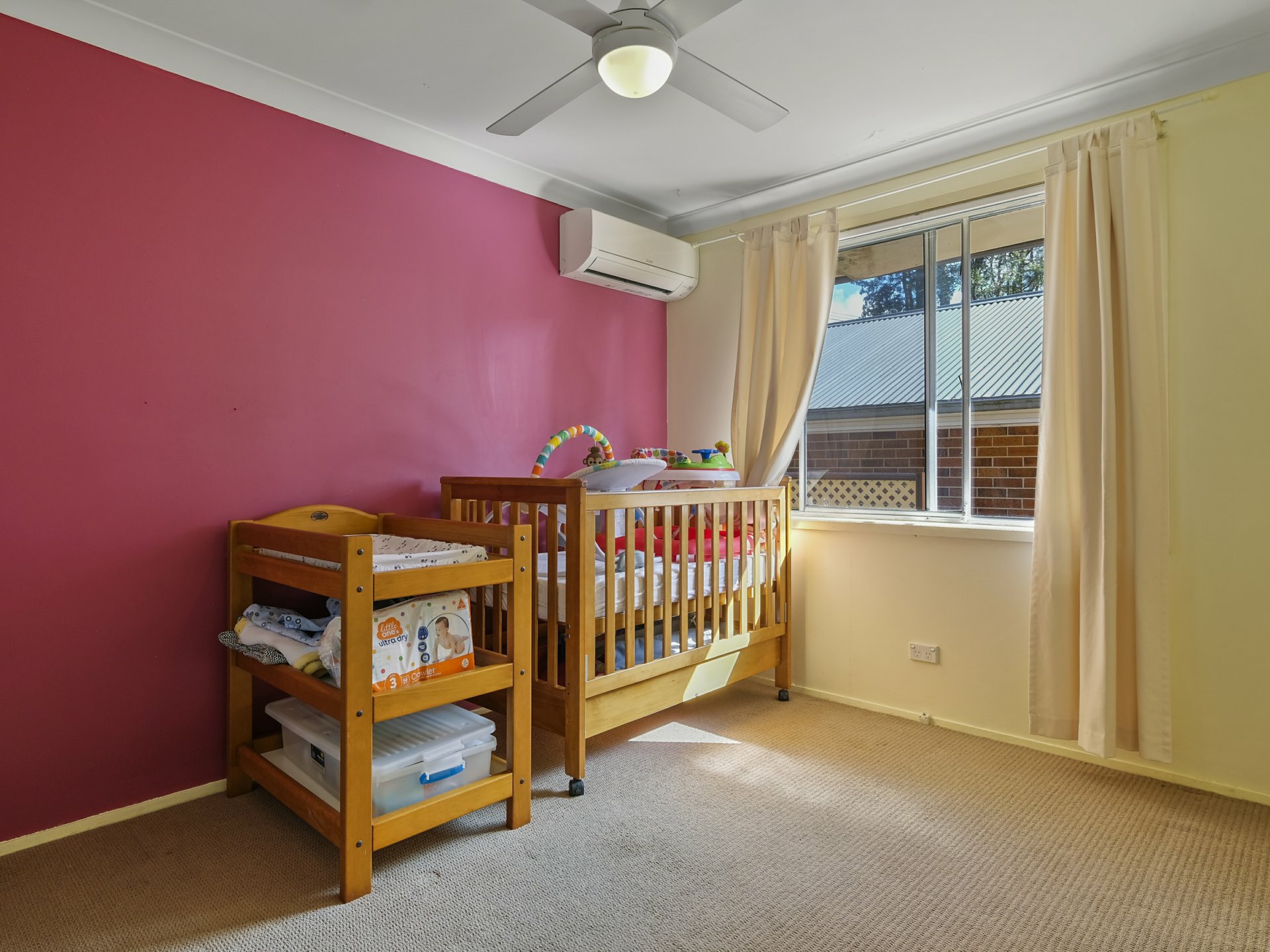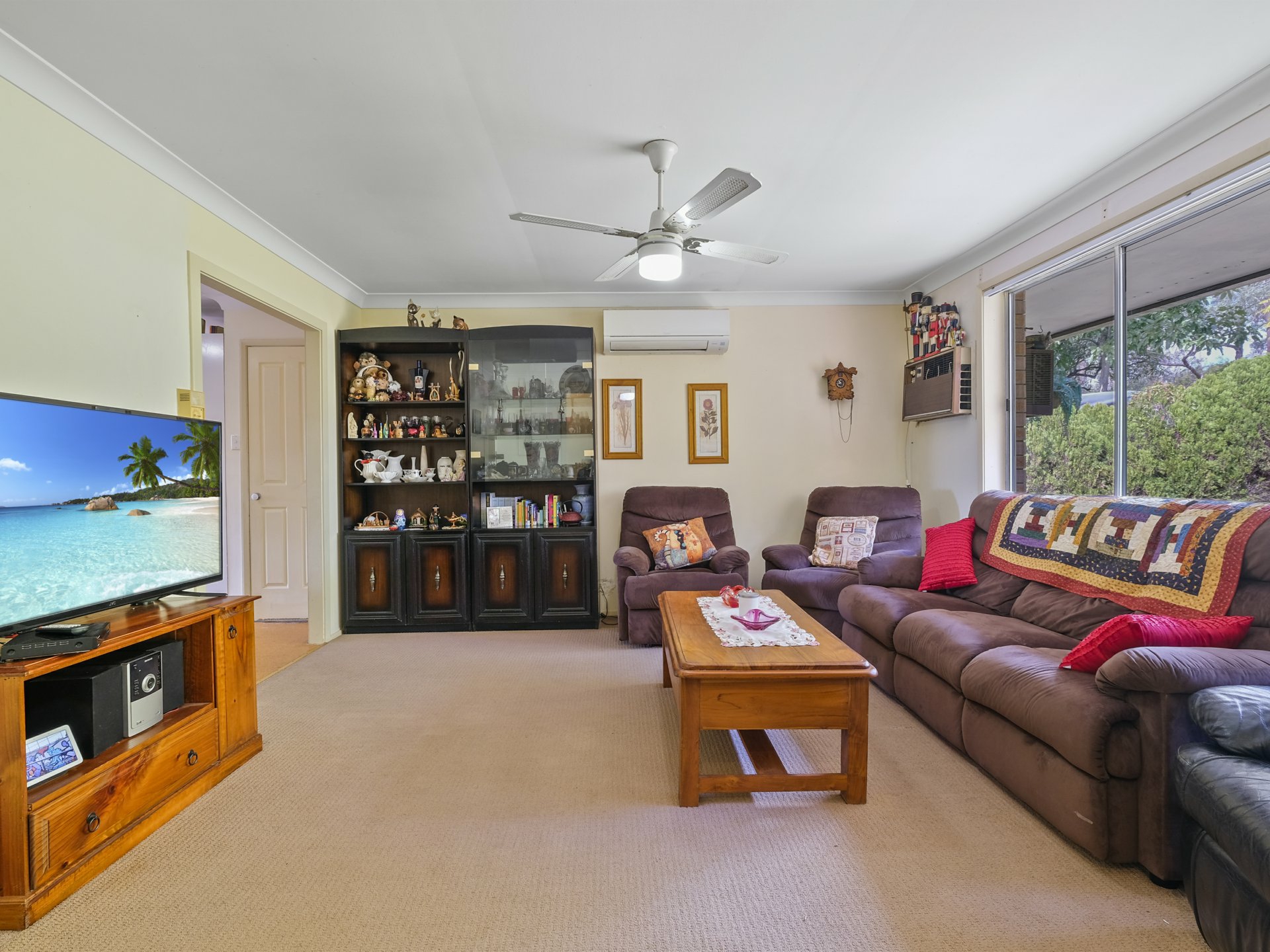 The home is designed for comfort and functionality, featuring a spacious lounge room with a split system air conditioner, ceiling fans, and gas heating to keep you comfortable all year round. Each of the three bedrooms also includes air conditioning and ceiling fans, ensuring a restful environment through every season.