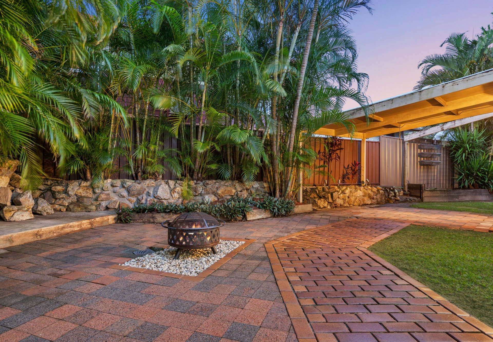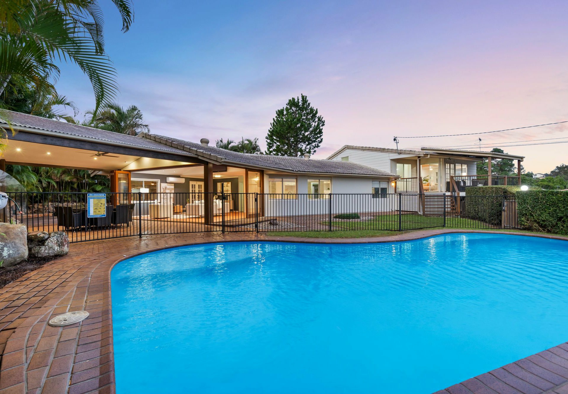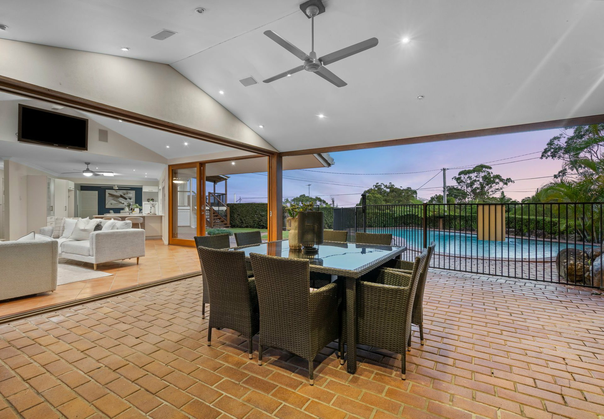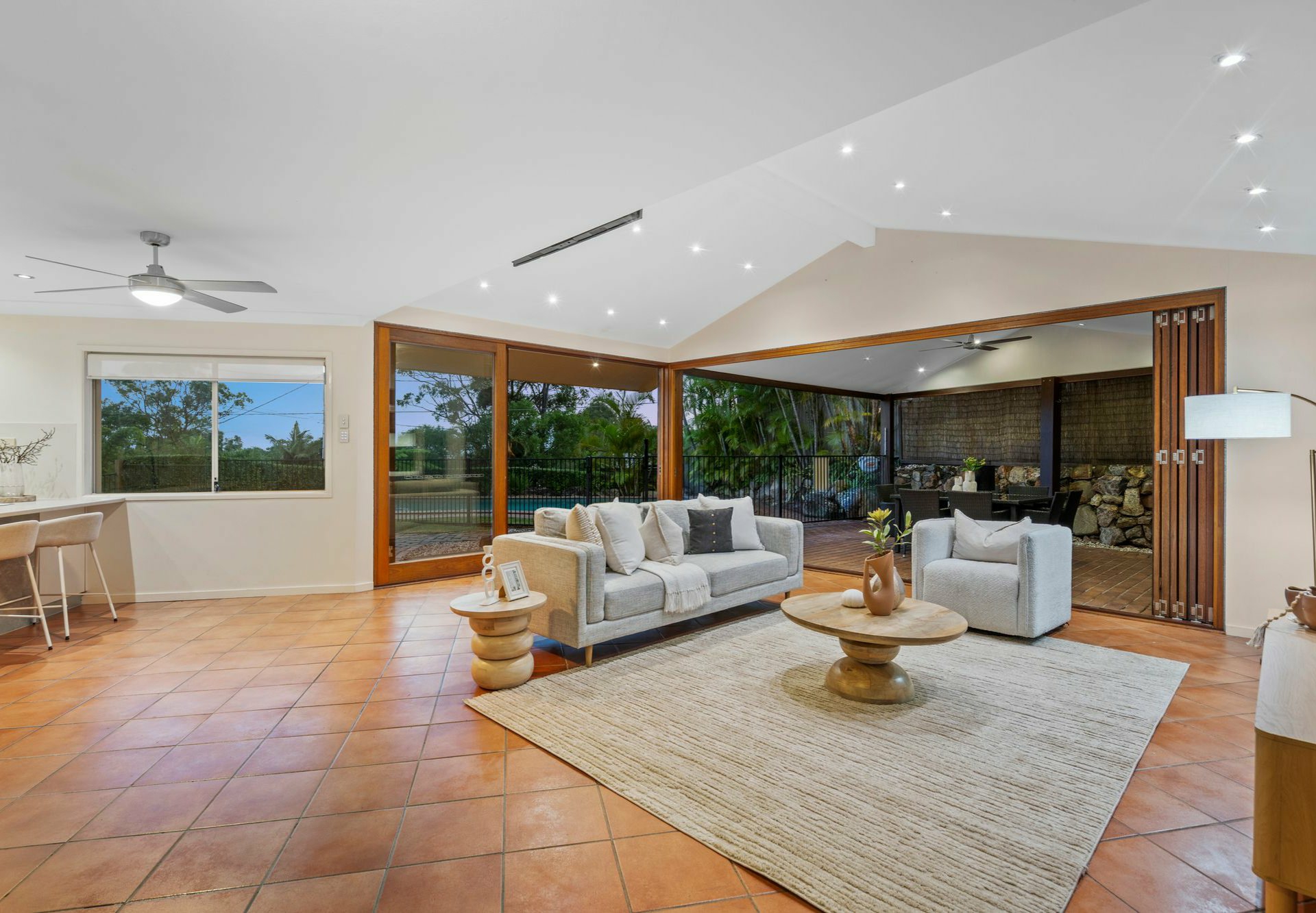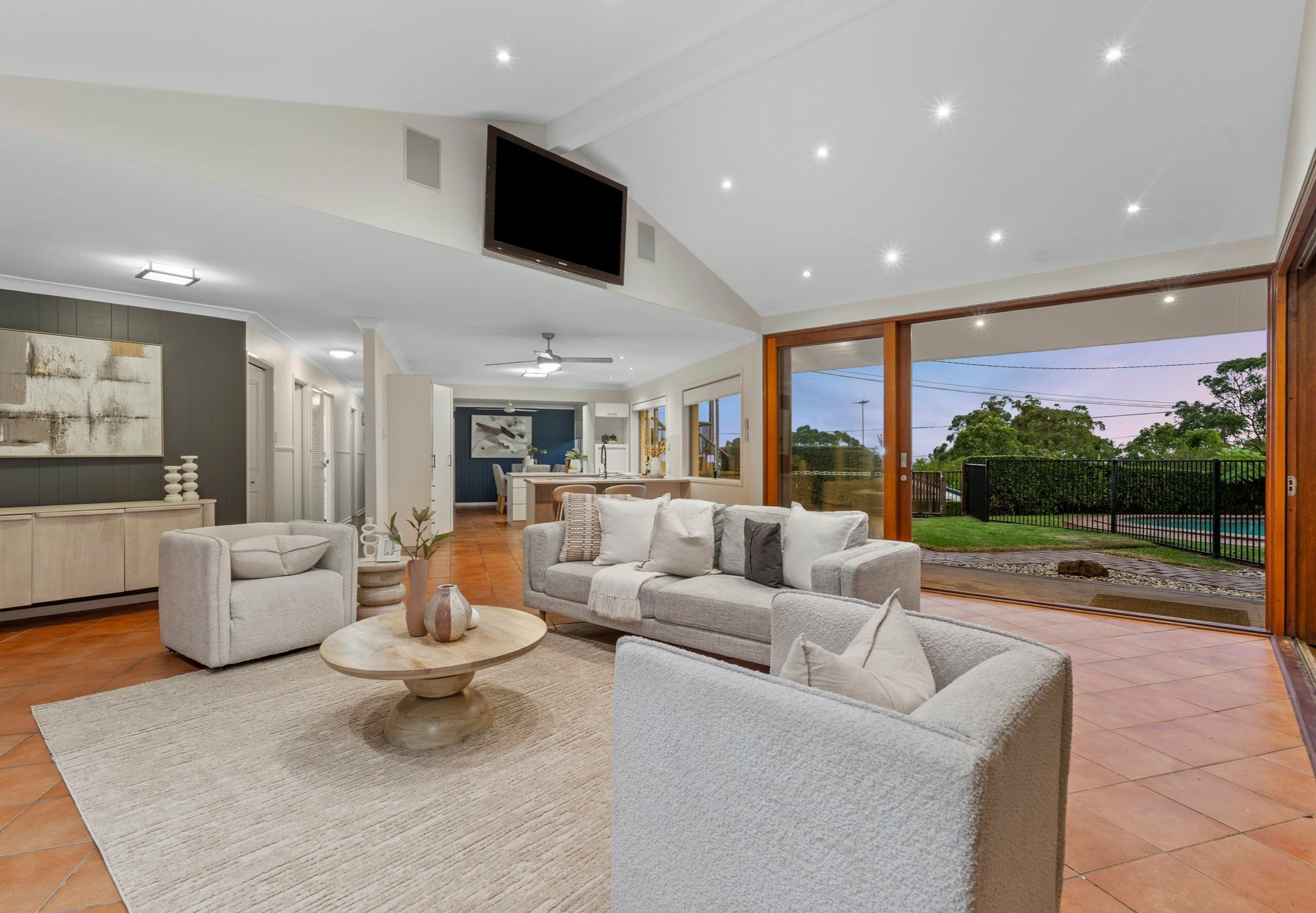 The home continues to deliver with three more spacious bedrooms (all with fans and air-conditioning), multiple flexible living spaces including a teenager's retreat or quiet sitting room, a study nook, and beautifully maintained bathrooms. Outdoors, enjoy the lush gardens, a fire pit corner, and a fully fenced saltwater pool set against a backdrop of swaying palms and distant hills.