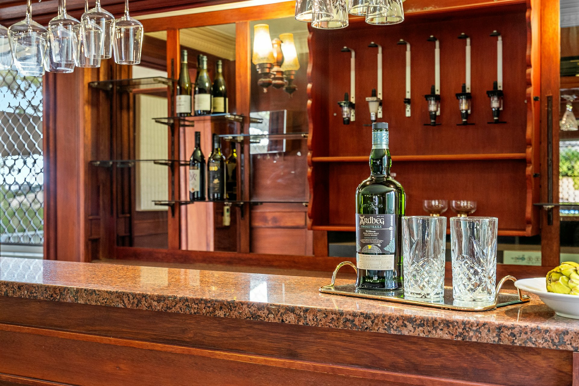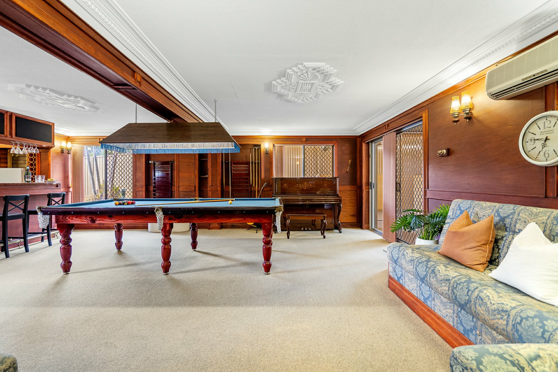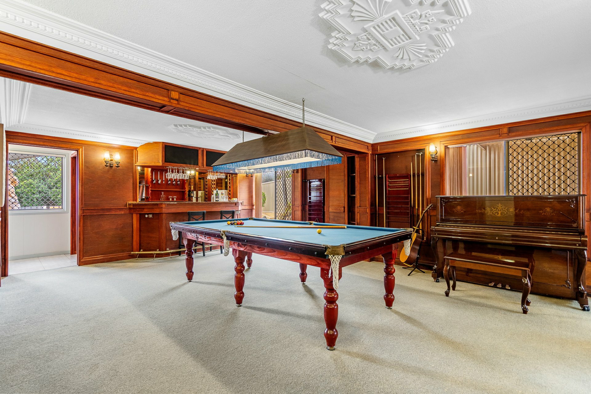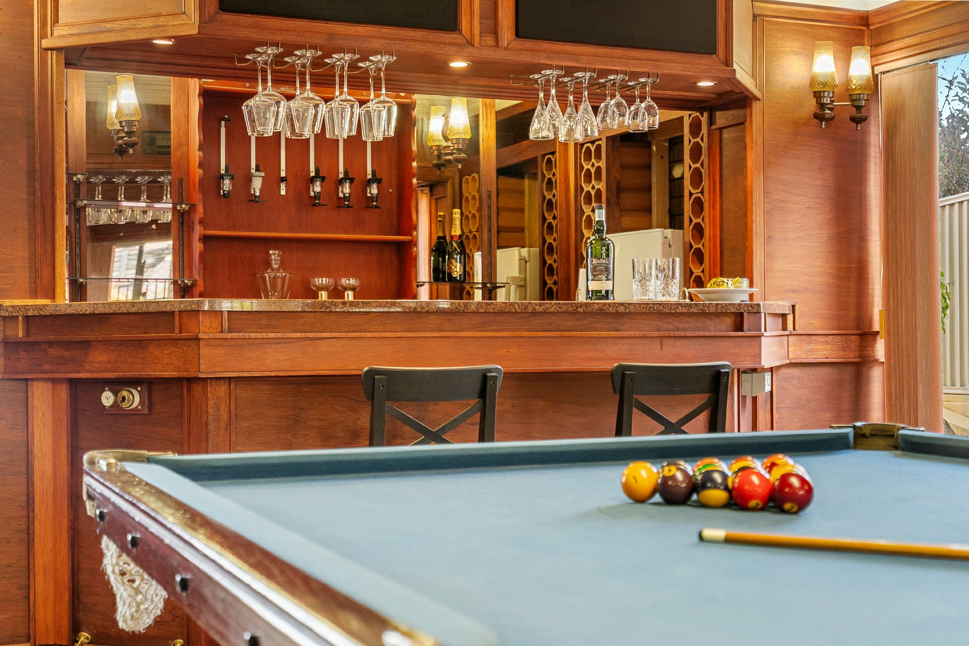 - Ornately timber-panelled games room with timber bar (beer keg plumbing) & sound system