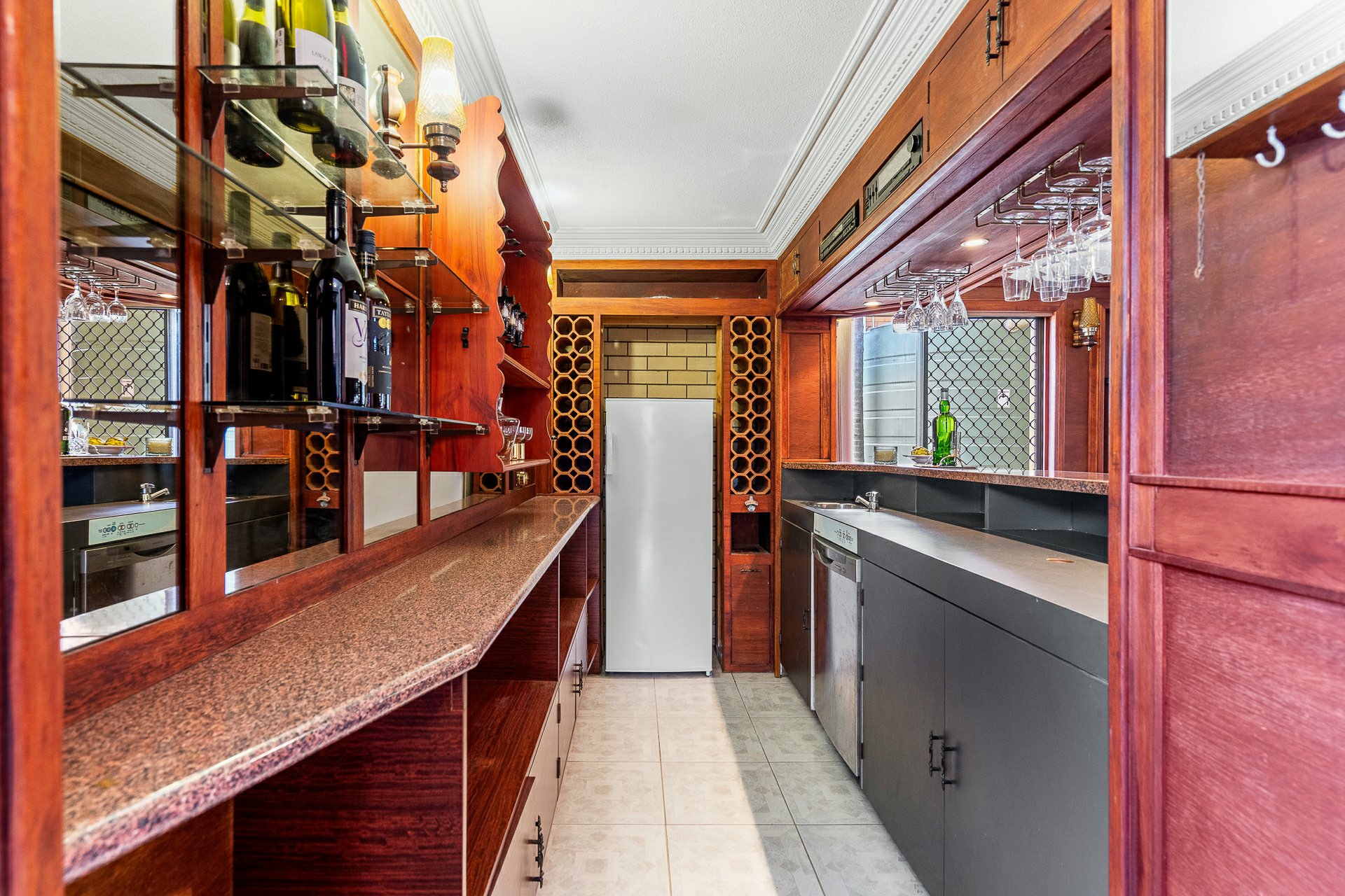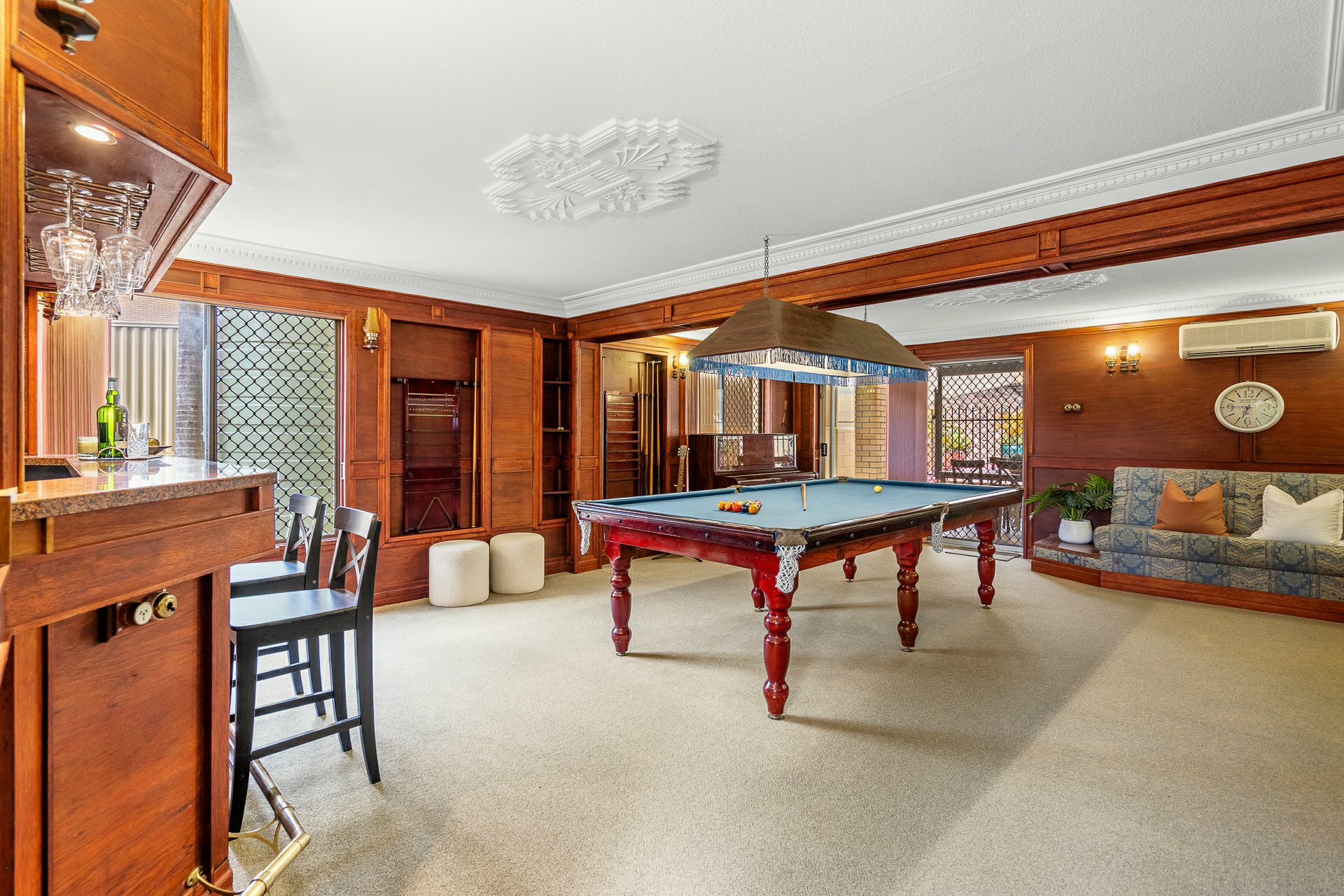 Just off the front entry, the games room is on par with something you might find in a smooth inner-city lounge bar. Rich-toned, moulded timber panels line the walls, with premium carpet underfoot and fancy stepped cornices framing an ornate Art-Deco-inspired central ceiling rose. A tad under 41m2, there's ample space to land even the trickiest of shots at a full-size billiard table, with stylish spectator viewing at the sumptuous bar while you enjoy tunes through the built-in sound system.