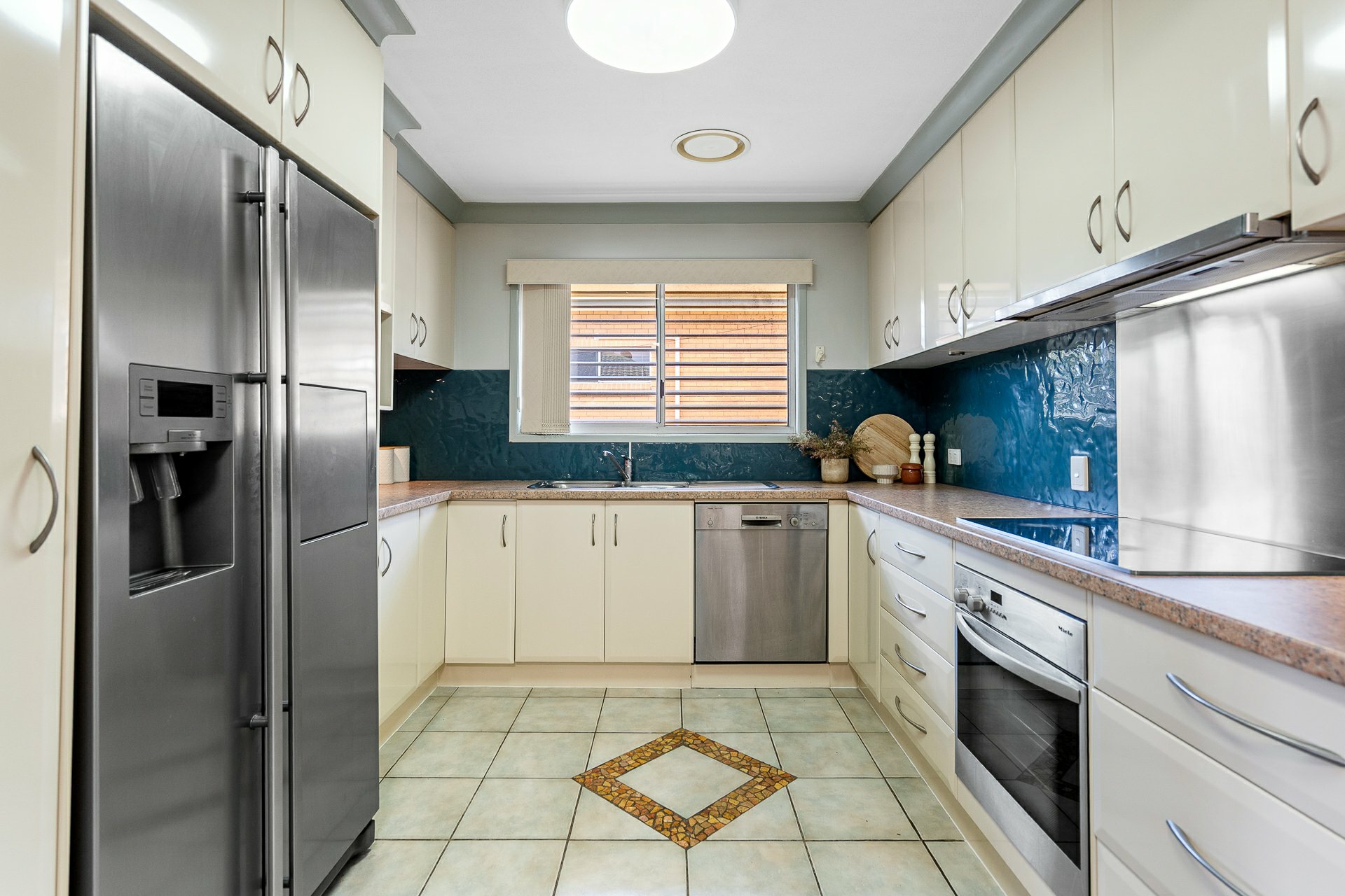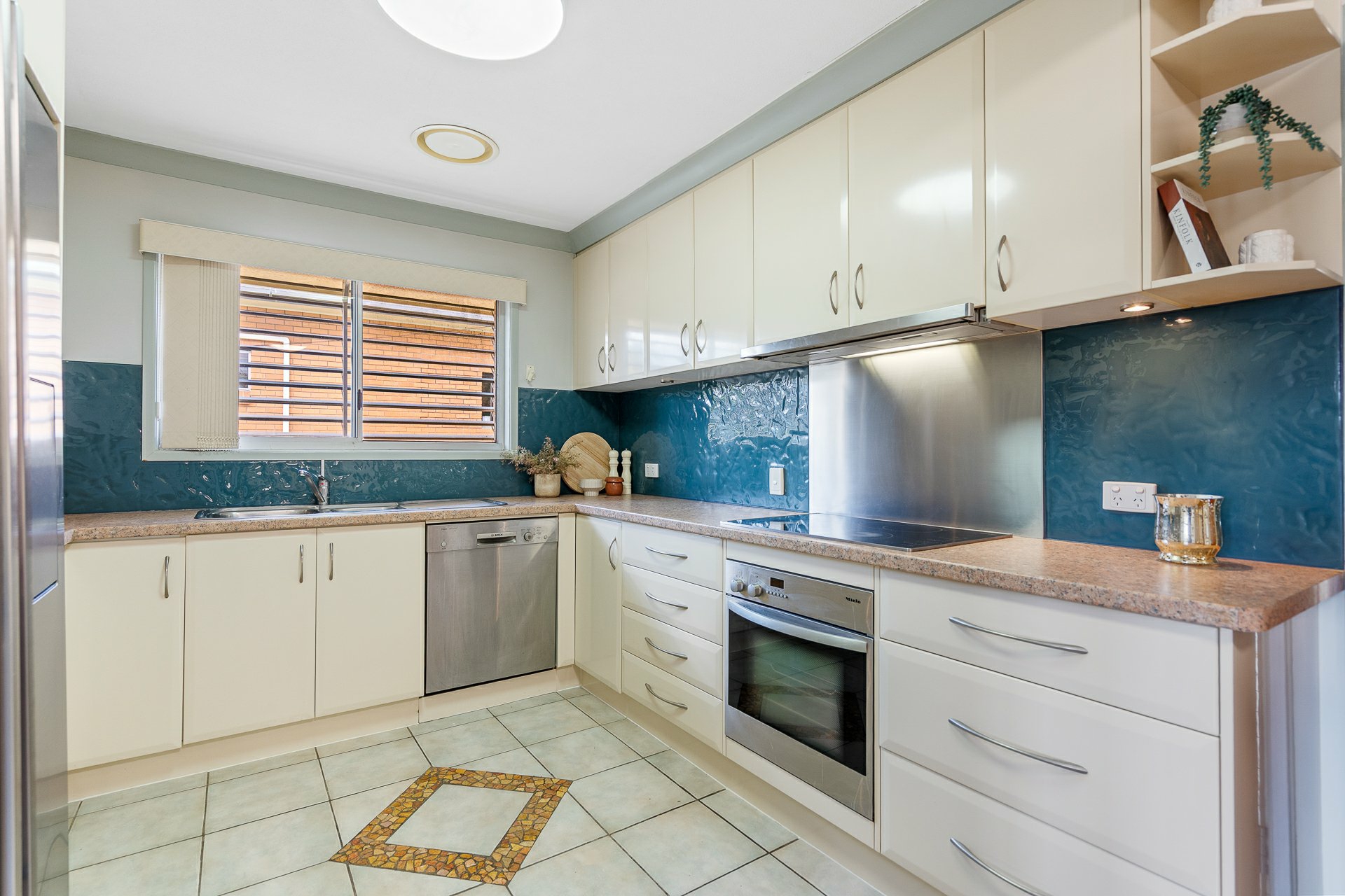- 2-Pac kitchen upstairs with Miele mod cons, glass/stainless splashbacks, mood downlights