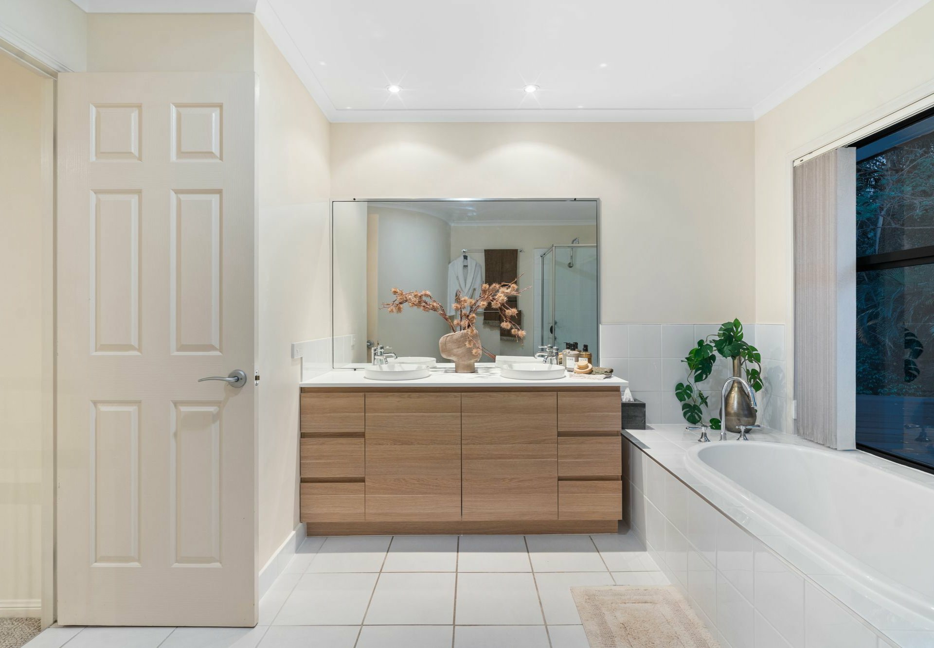 The palatial master suite feels like its own private haven, complete with an enormous walk-in dressing robe and a beautifully appointed ensuite featuring a spa bath, separate shower, and dual vanities. The family bathroom echoes the same refined design, with its double vanity, generous storage, separate bath and shower, and quality finishes that make life feel effortless.