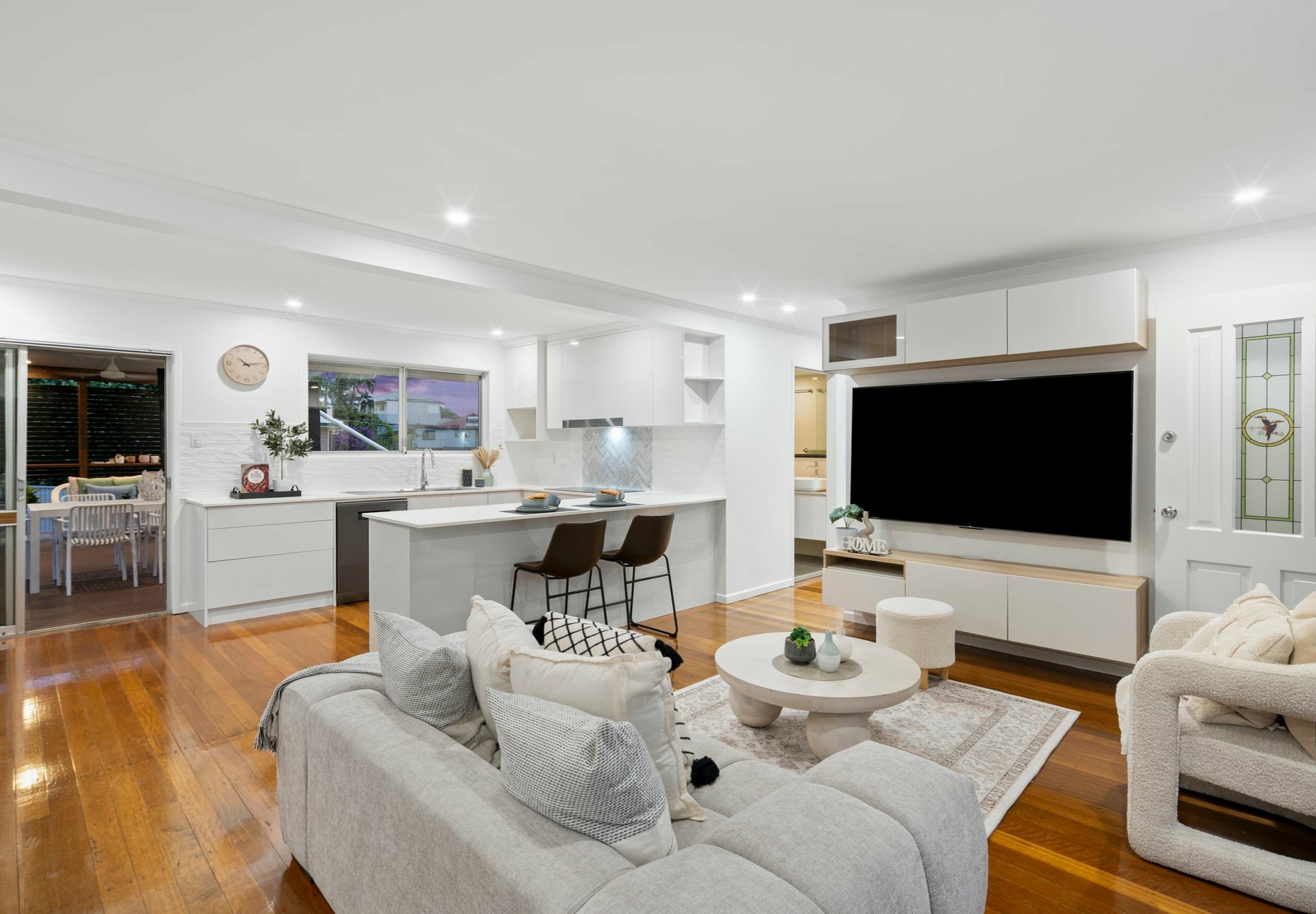 Discerning renovations have elevated this highset to lofty new heights. Upstairs, solid timber flooring pays homage to the past, but everything else feels thoroughly modern - especially features like the floating custom storage units framing the wall-mounted TV in the lounge ( can be sold depatately) and the stone benches, feature tile splashbacks and sparkling all-electric kitchen appliances!