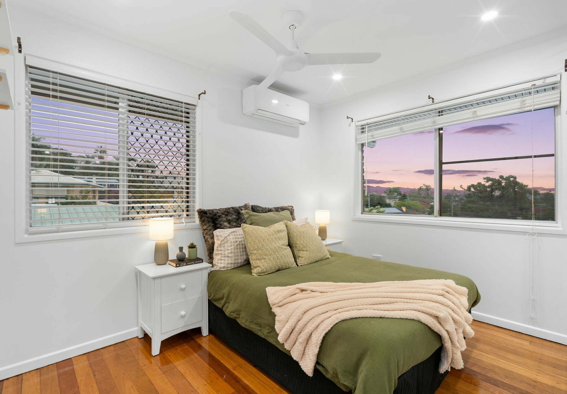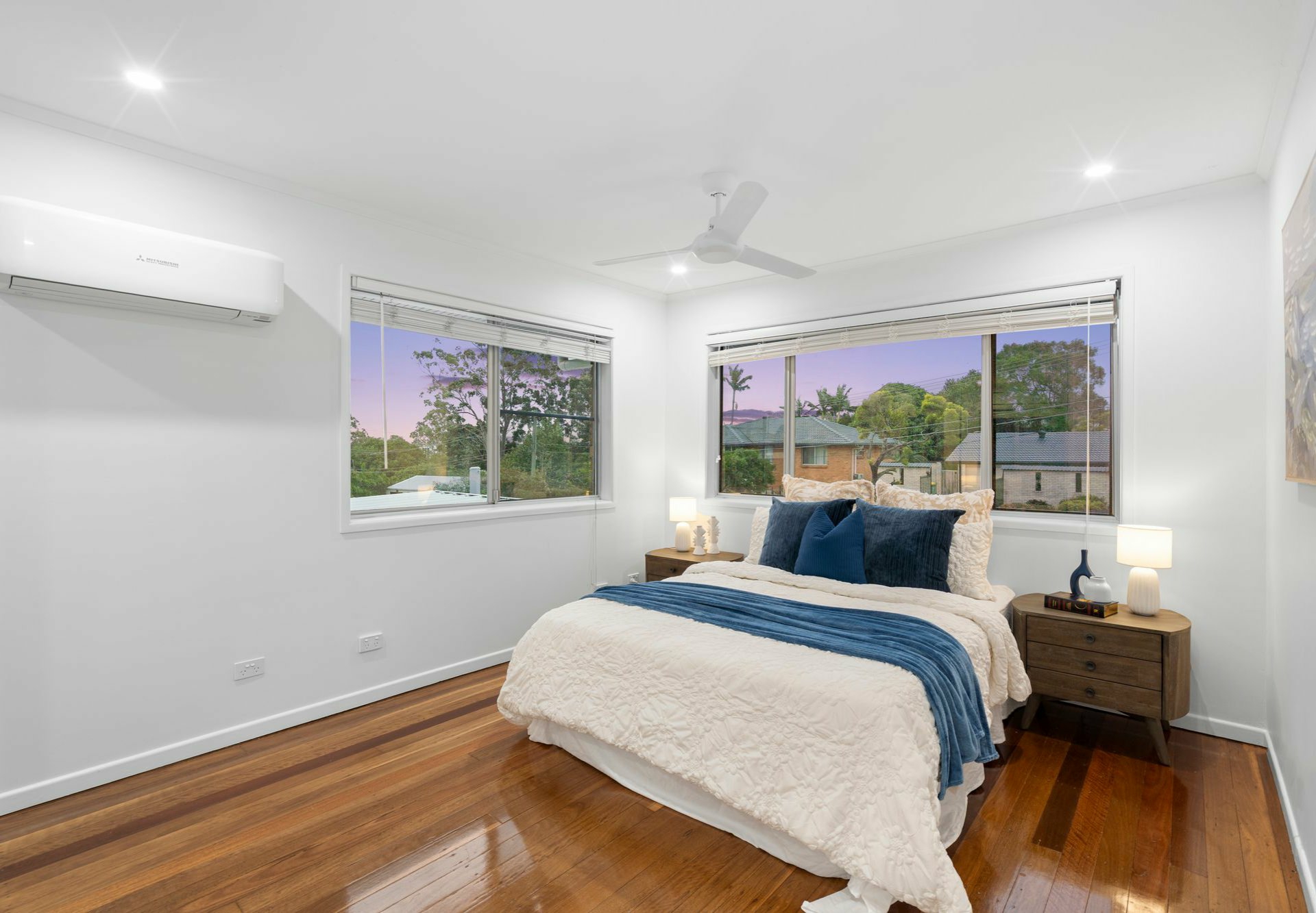The sleeping wing sits at one end of the house, the three bedrooms all with BIRs, one with split-system AC & rest with fans - and floating storage cabinet.